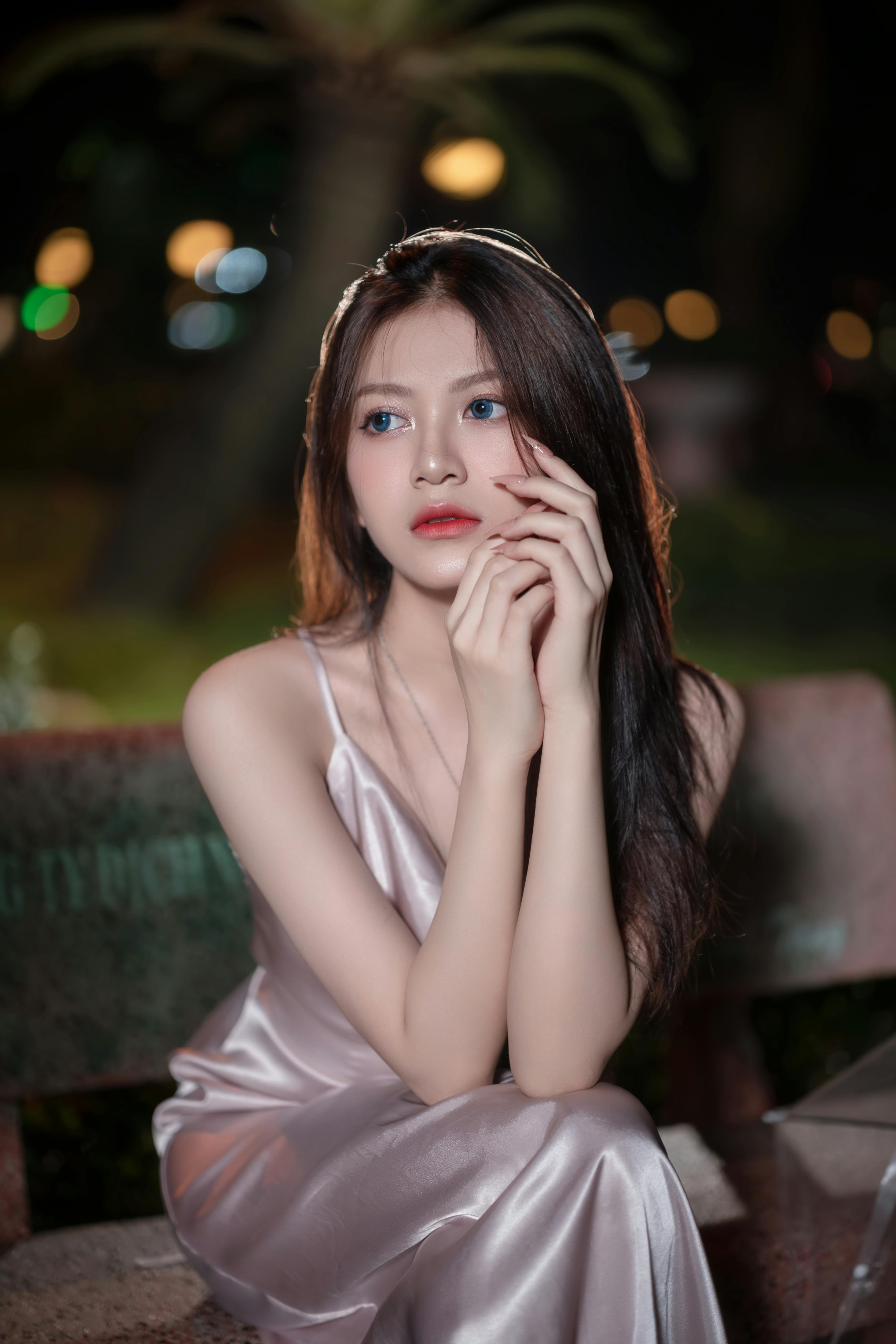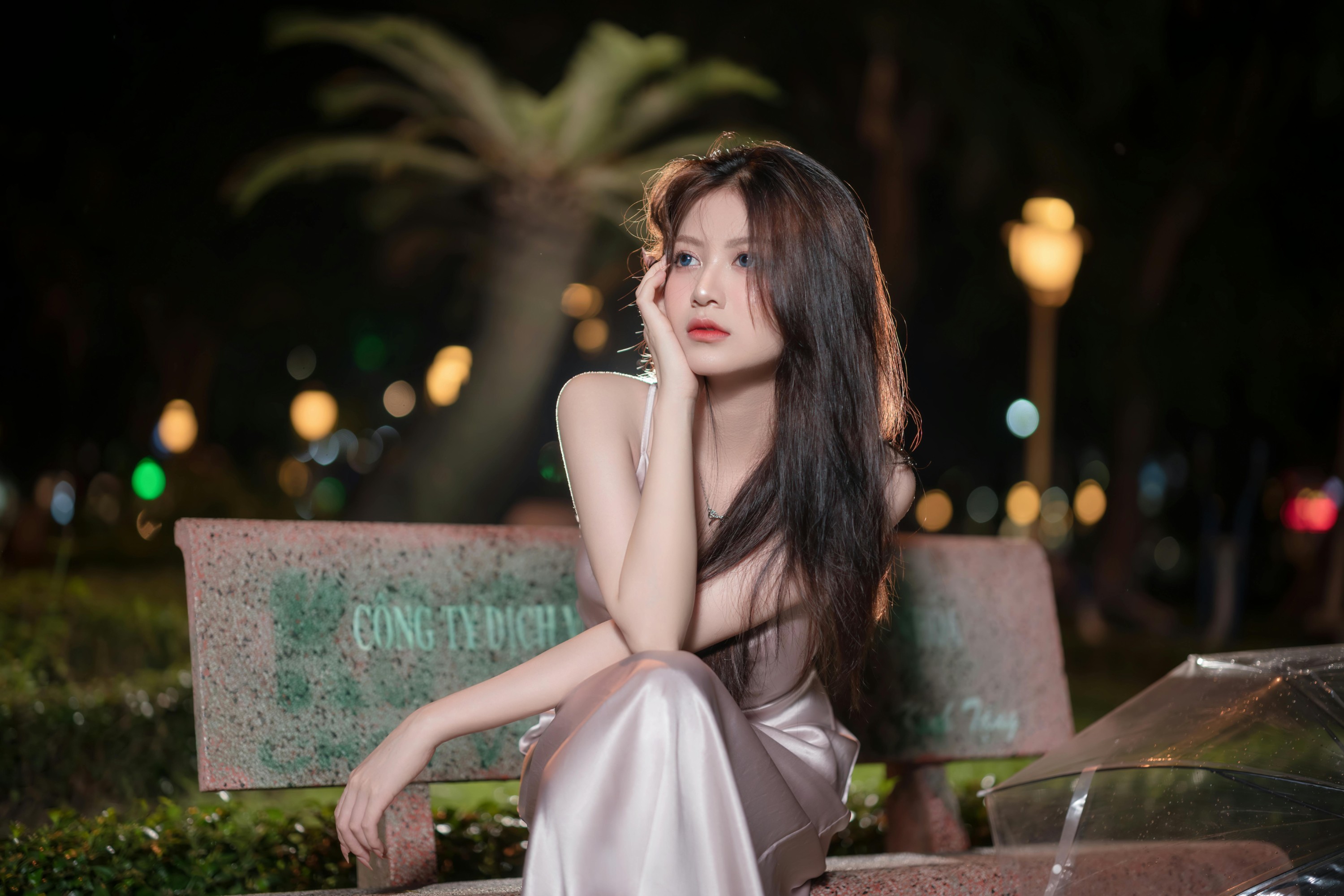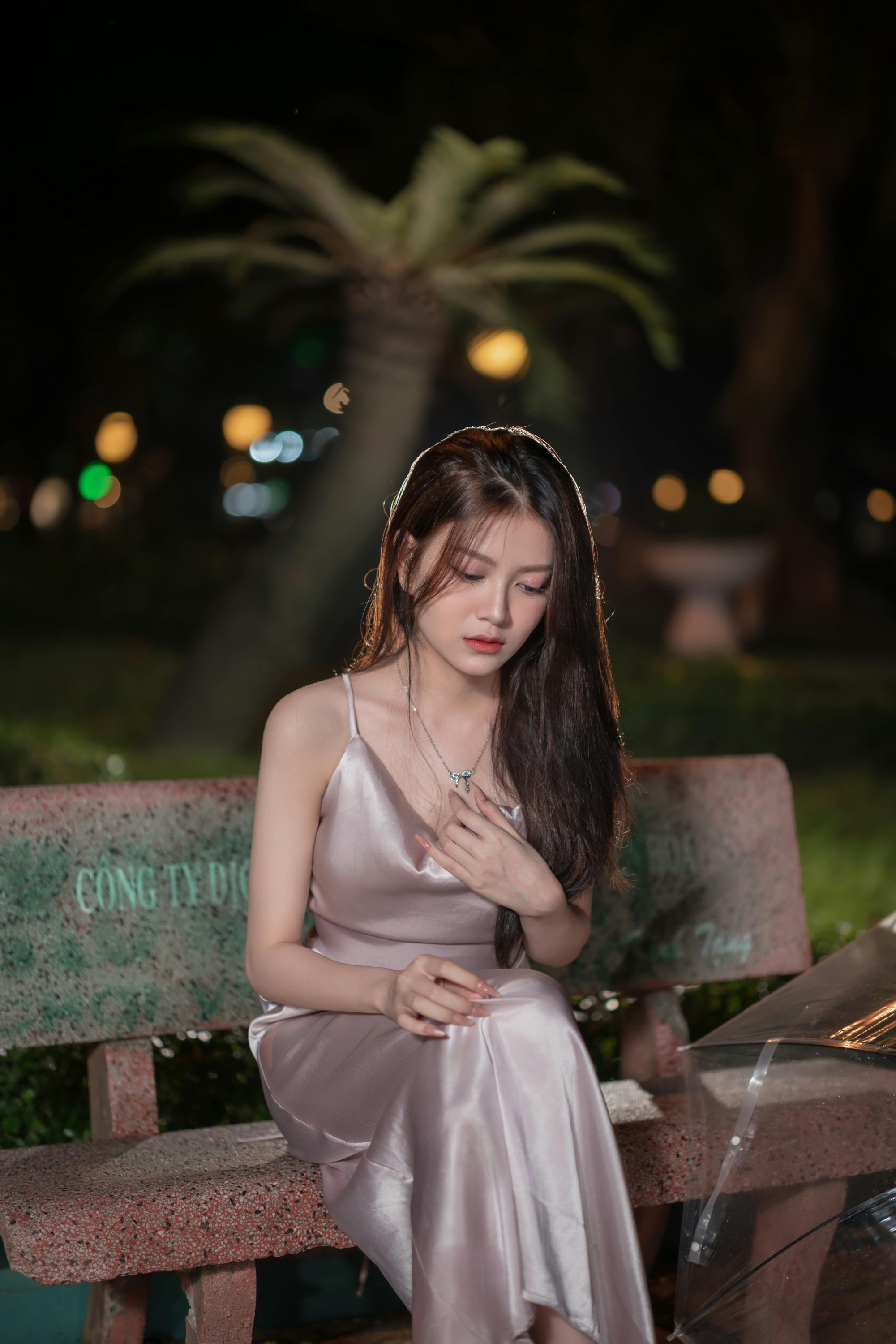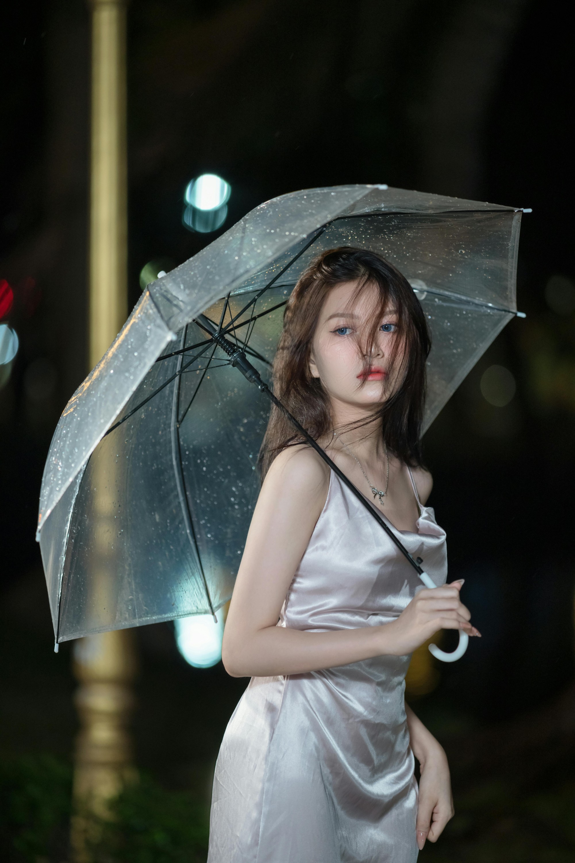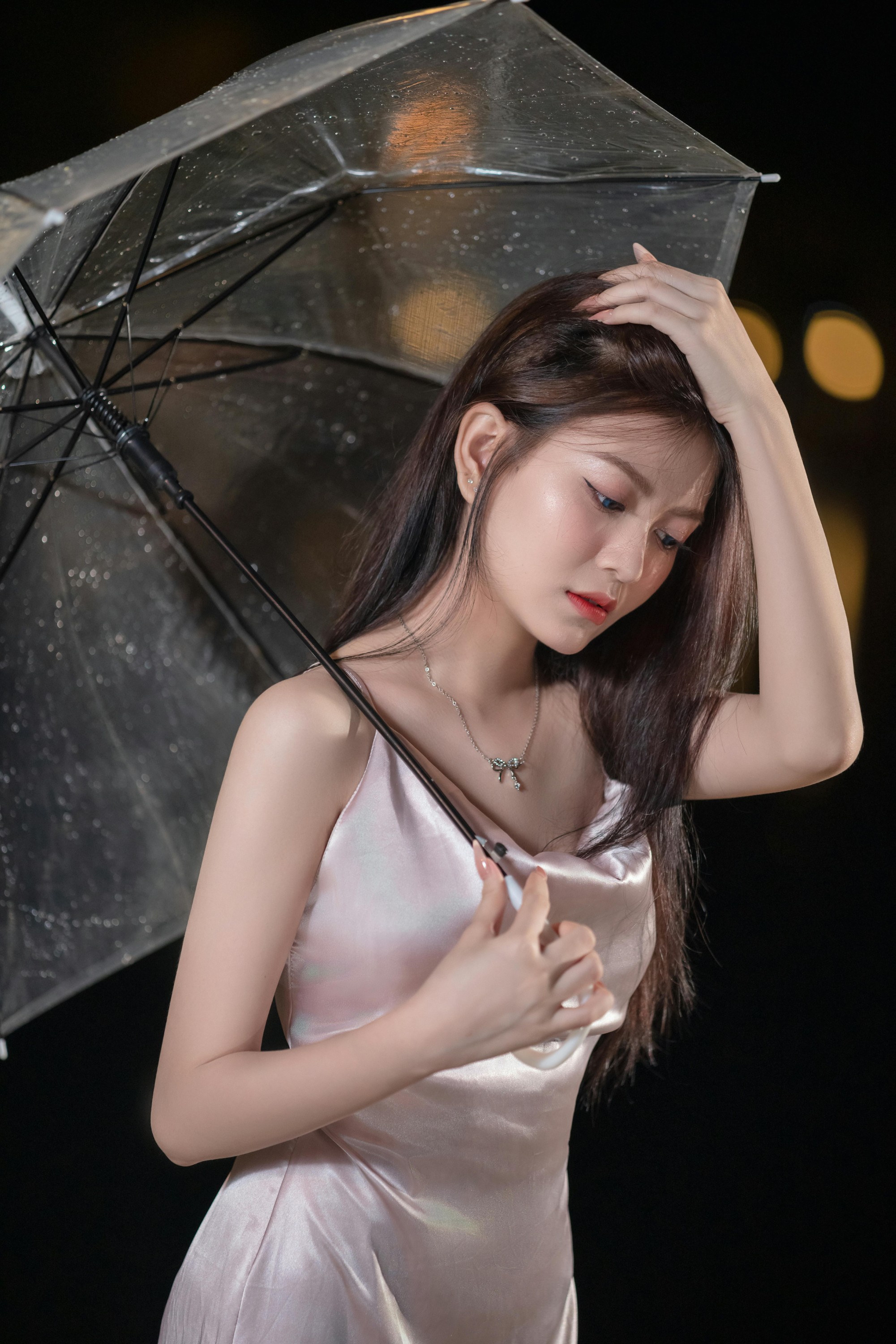 撑着透明雨伞站在雨里,发丝被晚风拂起,缎面裙在灯光下泛着温柔的光泽,清冷又妩媚;托腮望向远方,眼底是化不开的温柔与故事感,连雨落的声音都成了背景音。
