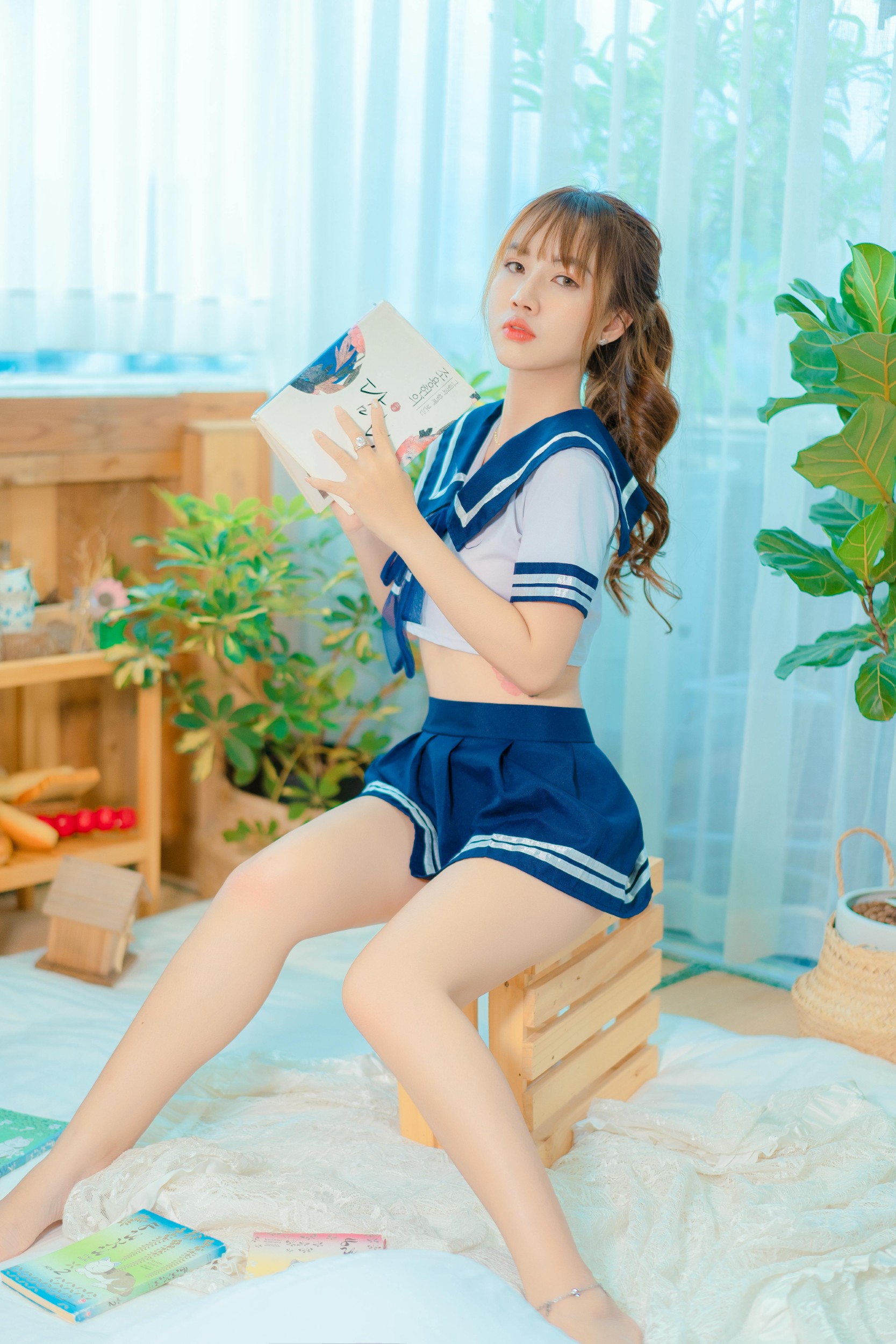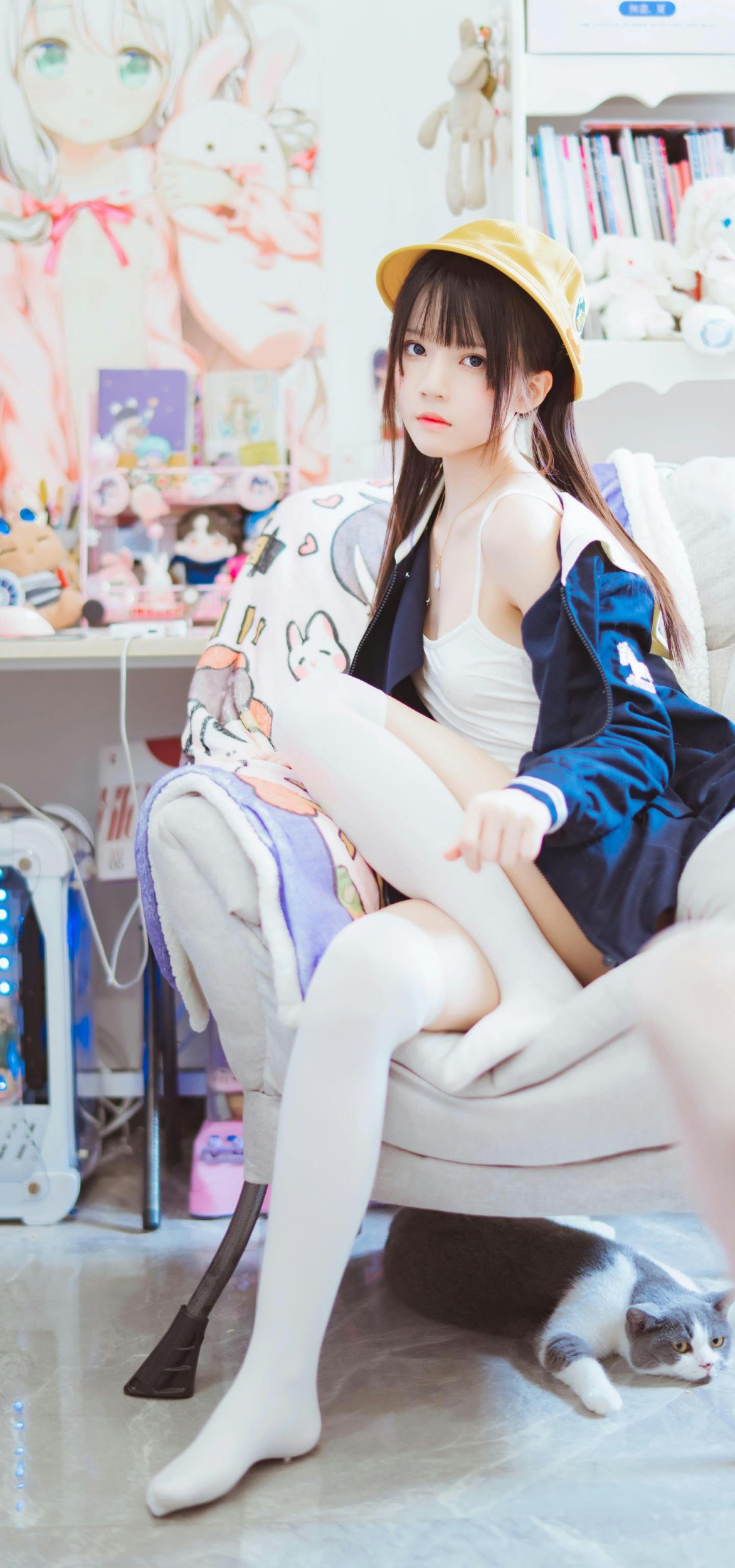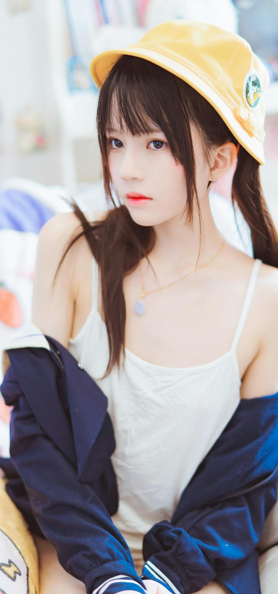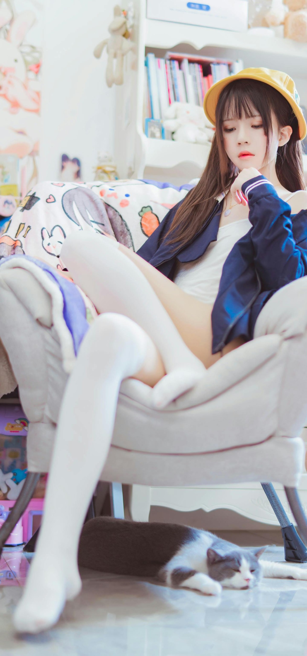有的画面是被阳光晒得暖洋洋的房间,她抱着书本,靠在窗边,风里都带着夏天的清爽气息;有的则是满墙海报的小窝,戴着小黄帽的少女蜷在沙发上,脚边蜷着一只睡得正香的猫咪,空气里都是慵懒又治愈的味道;复古房间里,她握着老式电话,像在等待一通跨越时光的来电;户外的光影下,透明伞上的花瓣和她眼里的光,都成了青春里最亮眼的风景。