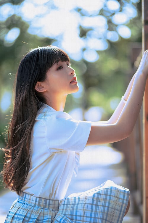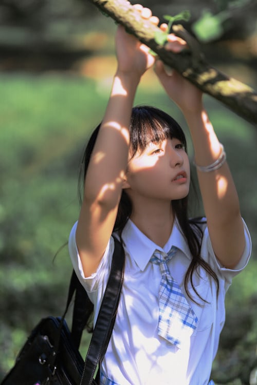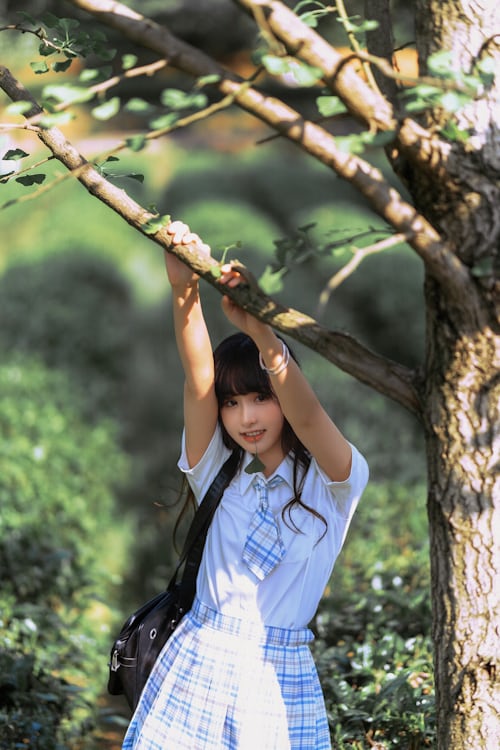抬手轻触枝叶的灵动,侧身望向林间的松弛,或是托腮浅笑的温柔,每一个动作都藏着夏日的清甜💙。自然的绿意做背景,蓝白配色衬得整个人元气满满,像从日系电影里走出来的少女,连风都变得温柔起来。