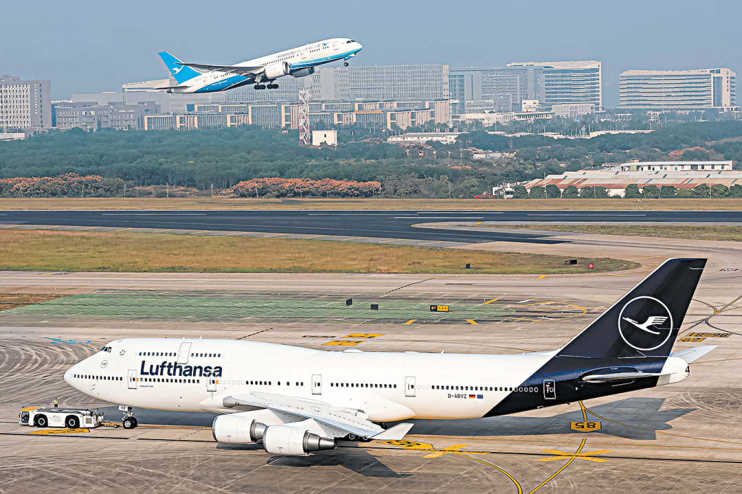 汉莎与厦航合影 张盛凯 摄点评:作者俯拍机场,利用地面上的飞机作前景,并精彩捕捉正在起飞的飞机形态,与前景飞机形成前后构置,以动与静、大与小的对比效果,彰显“合影”趣味,展现机场样貌。