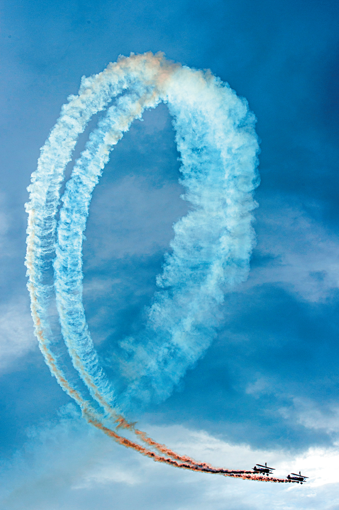 飞行表演 王林 摄点评:特技飞机在空中划出的图案形式在恰当捕捉和生动构图中得到精彩呈现,尤其是对两架飞机的位置把控恰到好处,虚实明暗的变化进一步增强了画面的趣味性。