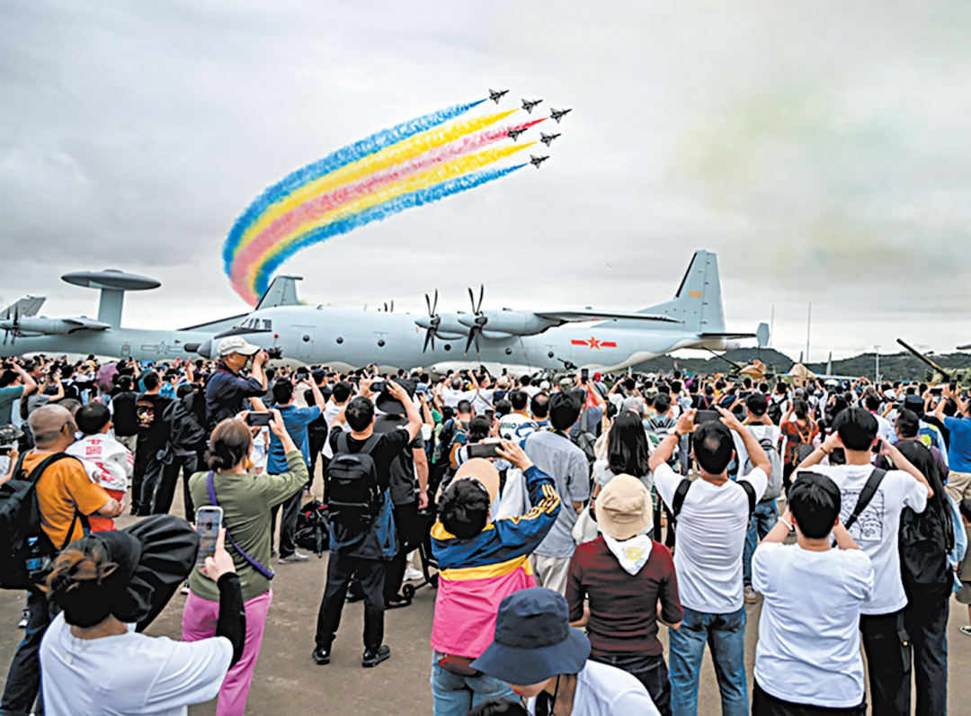 欢呼 李童 摄 点评人:罗韬(海南省摄影家协会主席)点评:作者把握了恰当的时机和角度,通过逆光仰拍的角度刻画人物特征,并在飞机与人物交错而过的瞬间按下快门,合理的曝光控制营造出深沉磅礴的色调效果。人机共画的生动场面,云霞的渲染增强了画面美感和现场气息。人们与飞机遥相呼应之势,强化了主题意蕴,富有生机和活力。