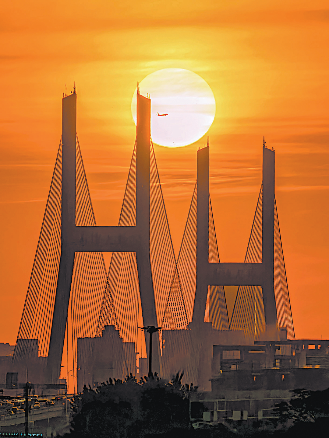 飞机与太阳同框 励福华 摄点评:恰当的瞬间捕捉,将一架客机与太阳巧妙结合一处,产生精彩的视觉效果,富有形式感的高耸建筑在剪影化的呈现下,画面内容得到抽象处理,并在构图上展现出协调之感。