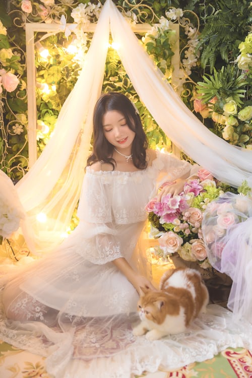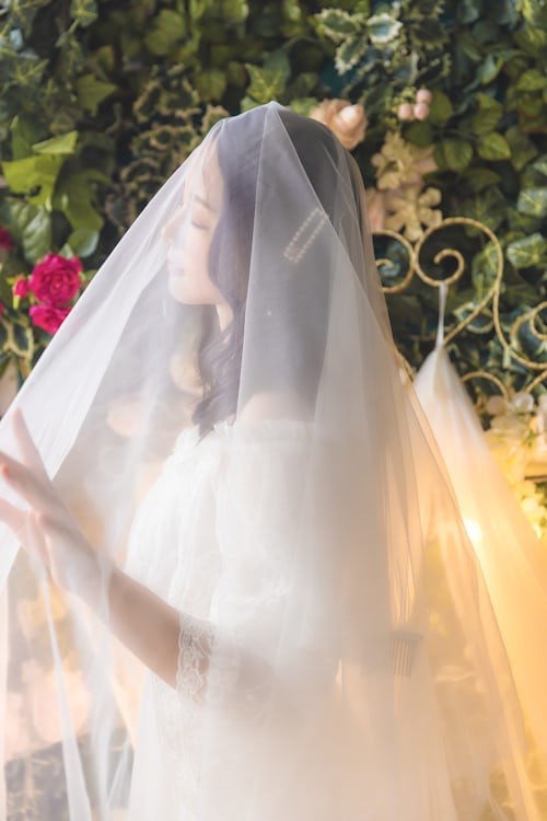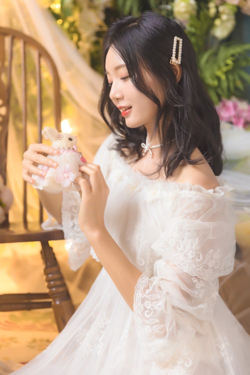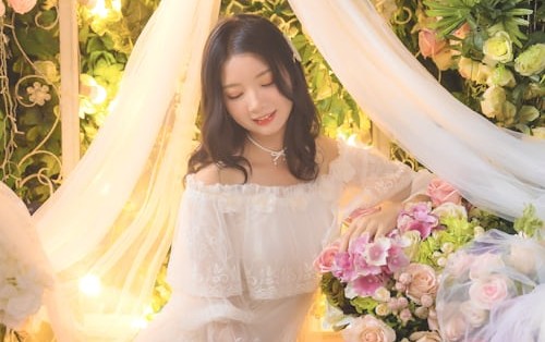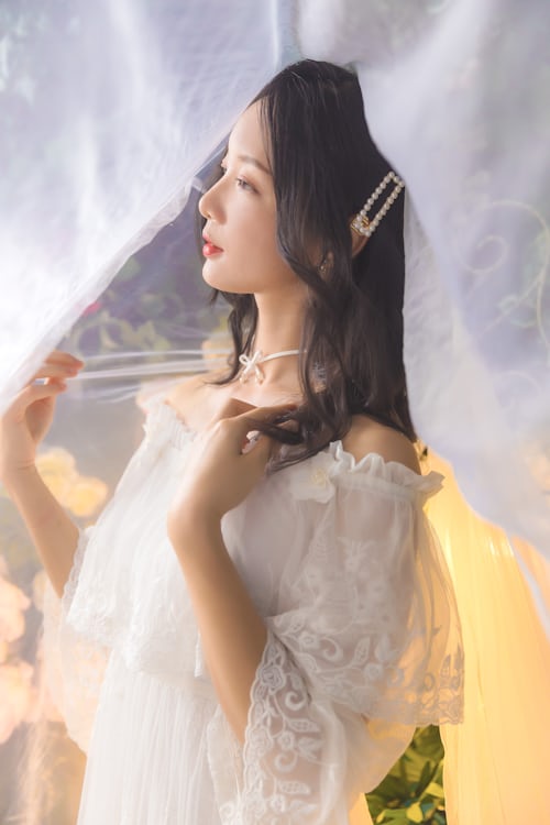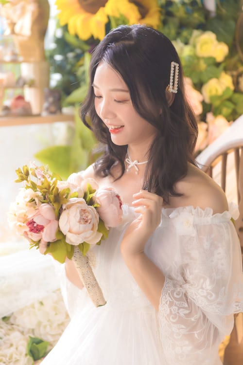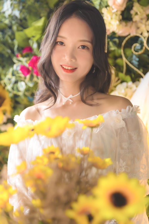 一袭轻盈白色长裙,手持暖黄色花束,头戴精致头纱,穿梭在金灿灿的向日葵花海中,自带暖调治愈氛围感,把少女的温柔与浪漫完美拿捏。