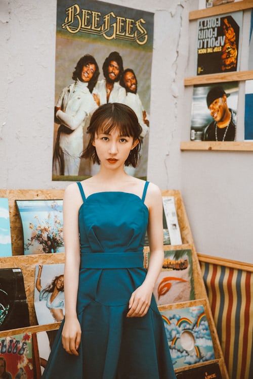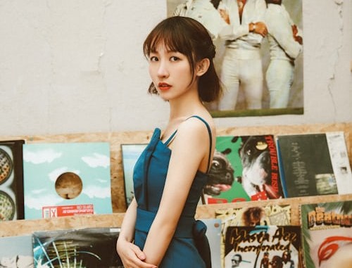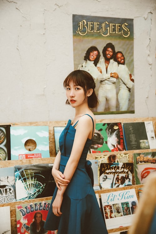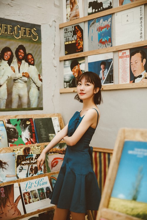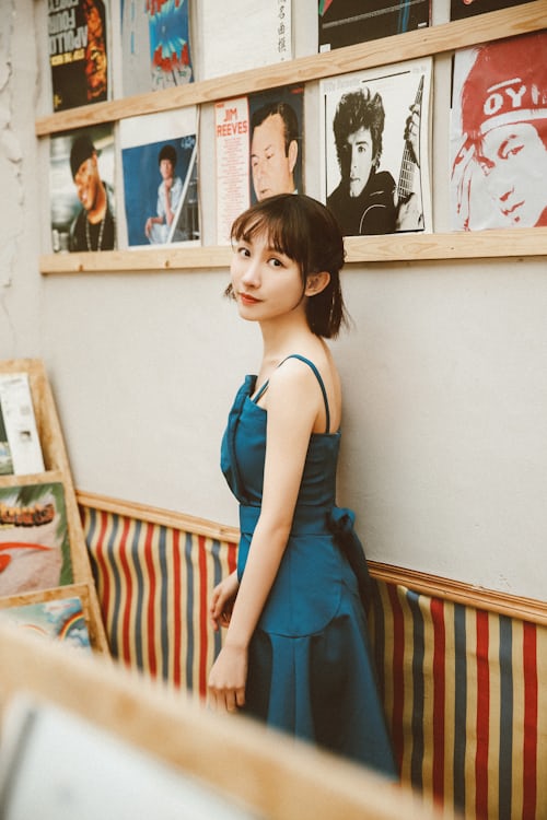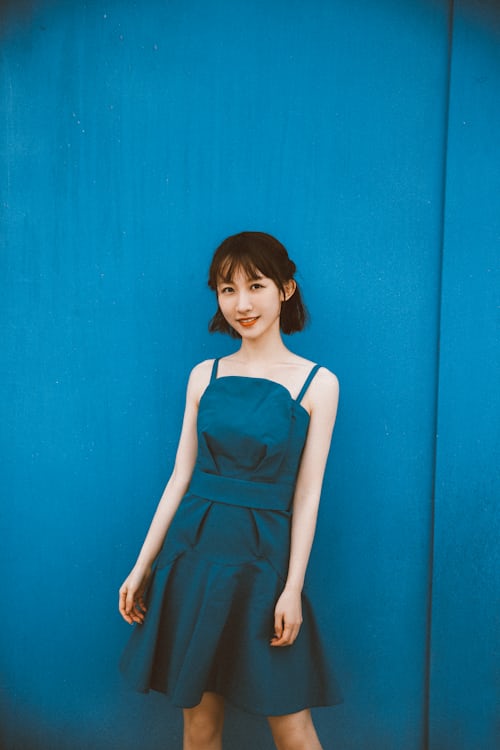 一袭丝绒质感的深蓝色吊带裙,搭配简约干净的妆容,在复古蓝调背景的衬托下,把韩系少女的清冷纯欲与温柔氛围感完美拿捏。