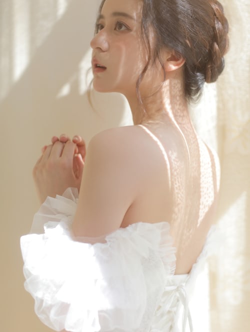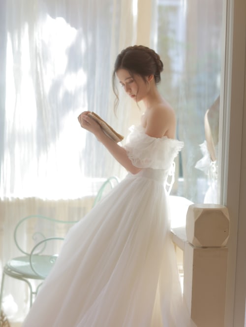 一袭简约精致的一字肩轻婚纱,蓬松温柔的白纱裙摆,搭配温婉盘发造型,在窗边漫射柔光的包裹下,把纯粹干净的高级氛围感完美拿捏。