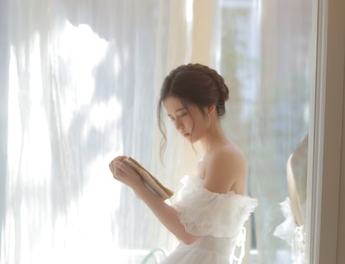 侧身回眸、轻拢裙摆、静坐浅笑、低头凝眸,每一个舒缓优雅的姿态都自带温柔气质✨。暖调柔光穿过薄纱窗幔,在肌肤与白纱上晕开细腻光影,极简干净的室内布景,没有繁杂多余的装饰,全是独属于轻婚纱的纯粹浪漫。