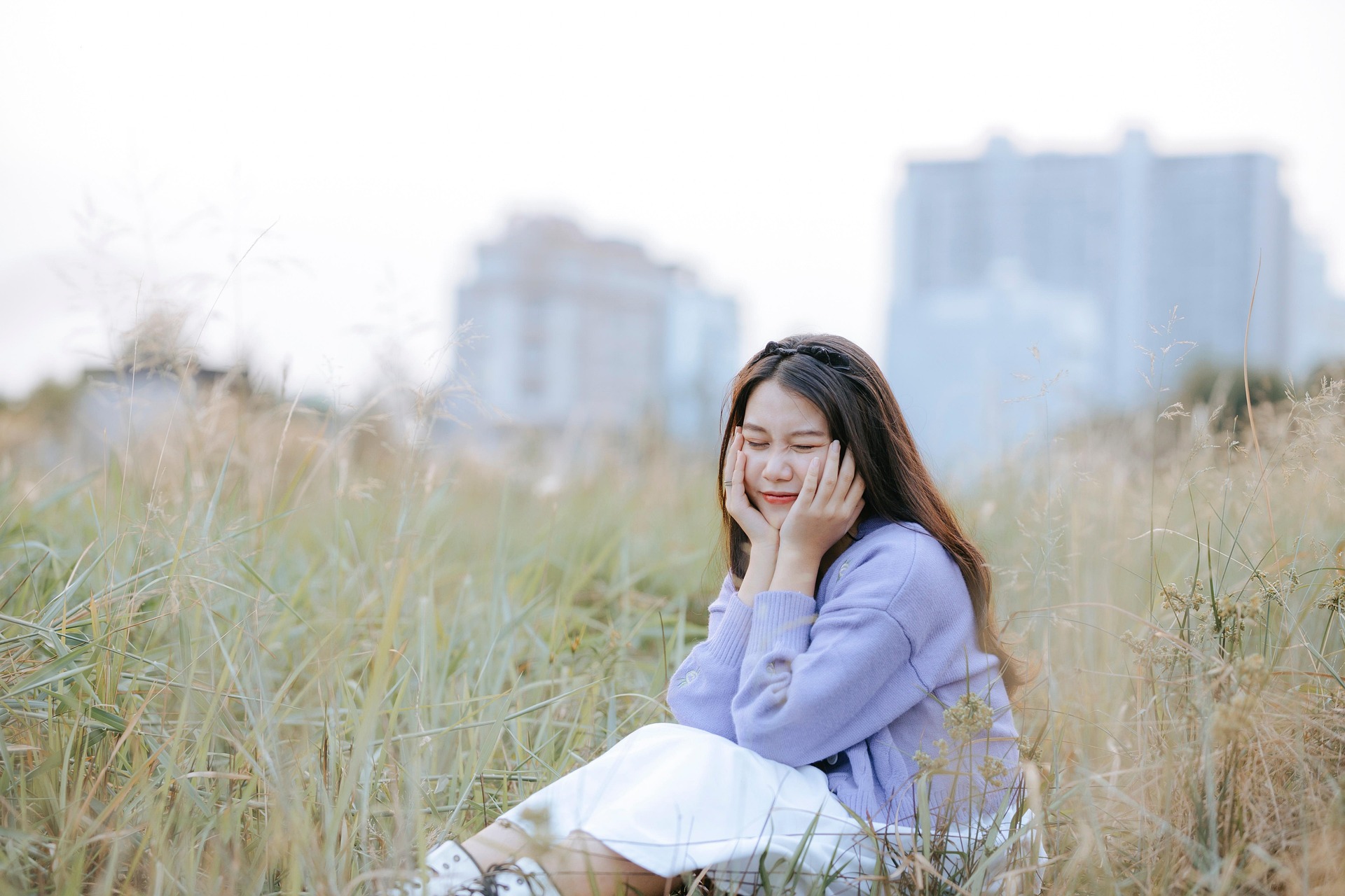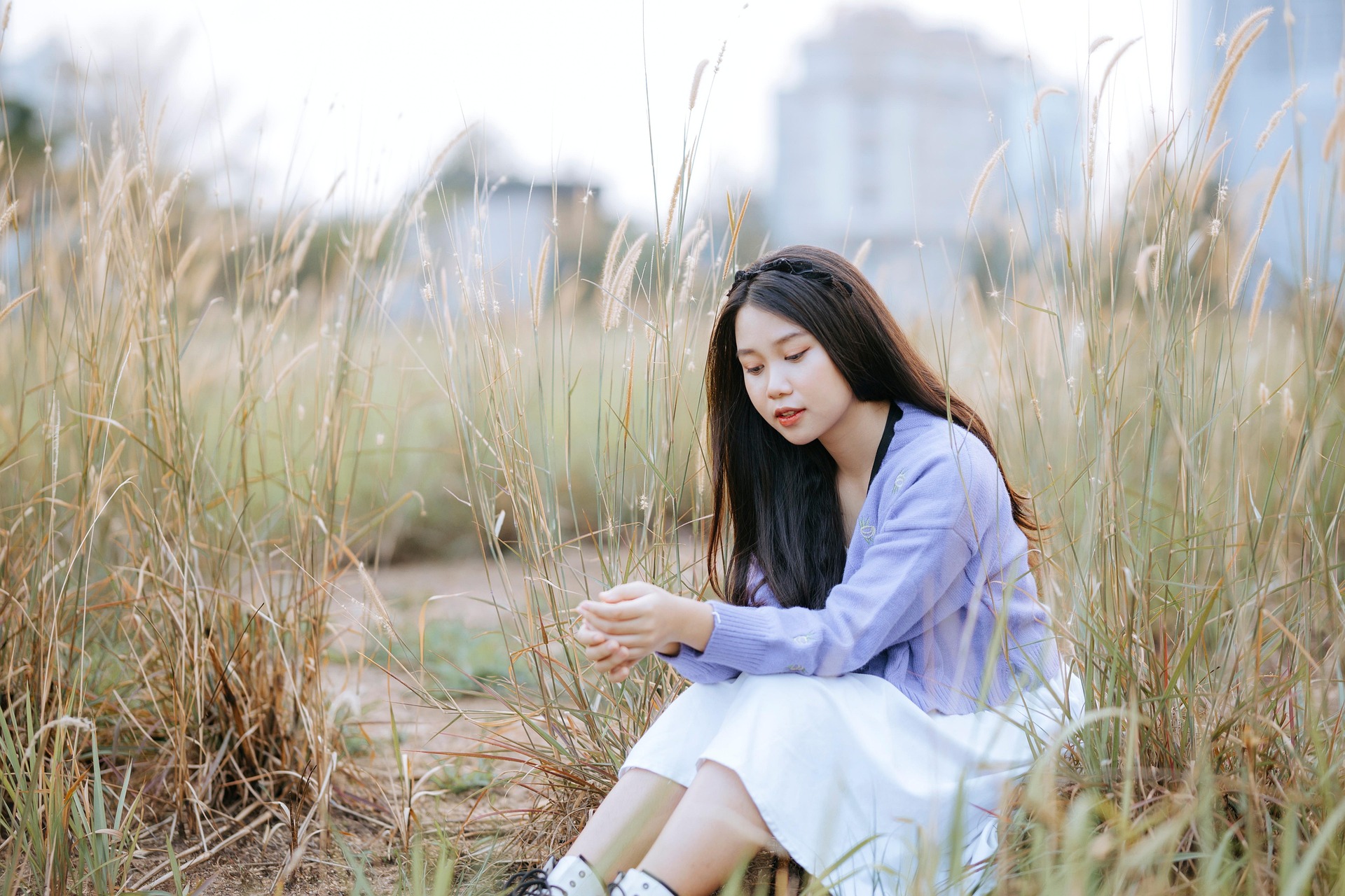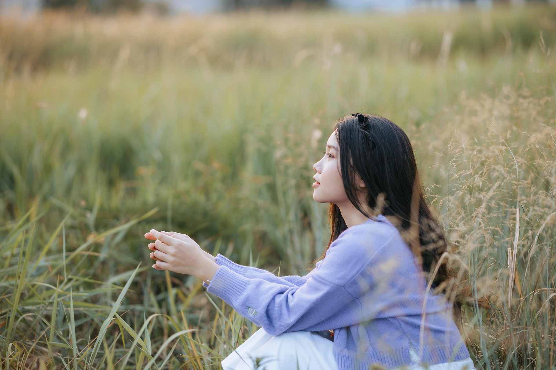 一身软糯香紫针织开衫,搭配干净的白裙,黑发间点缀精致发箍,少女独坐于草色之间,整个人都被朦胧柔和的光线包裹。