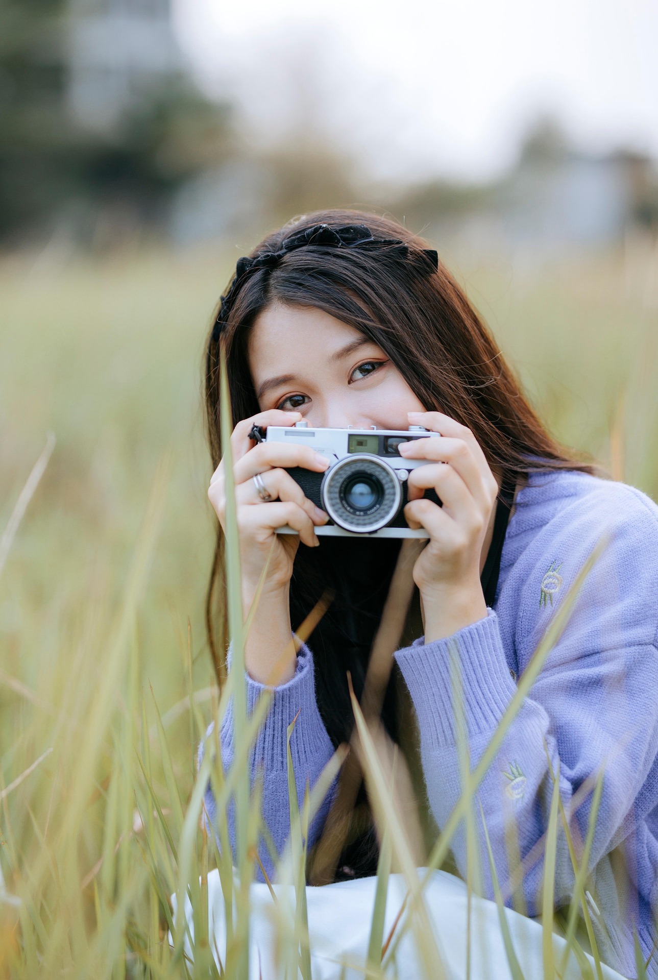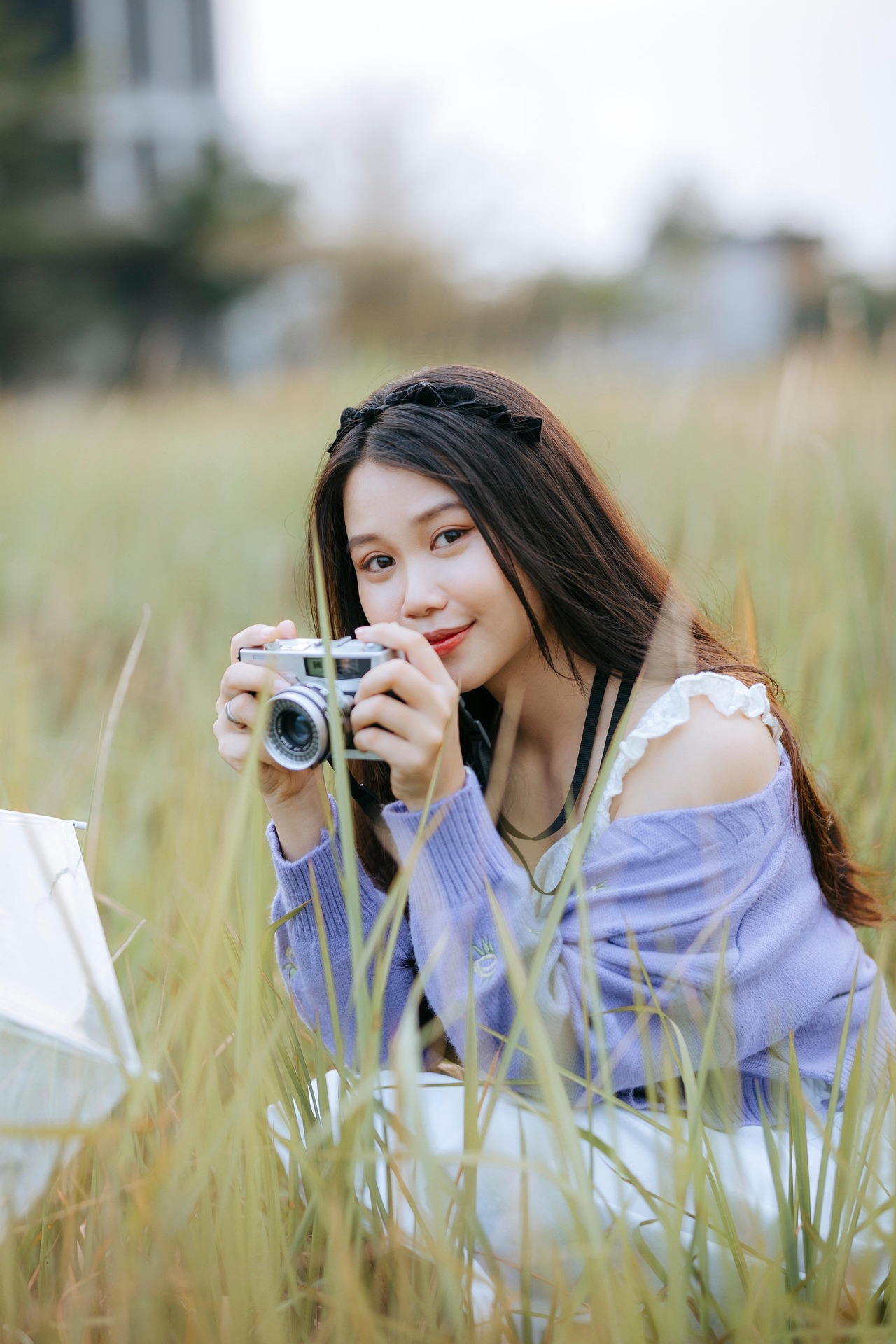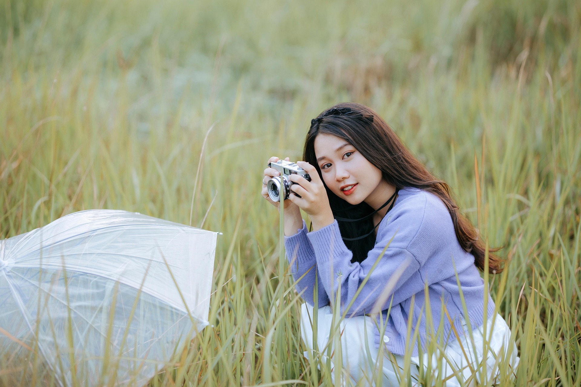 一身软糯香紫针织开衫,搭配干净的白裙,黑发间点缀精致发箍,少女独坐于草色之间,整个人都被朦胧柔和的光线包裹。