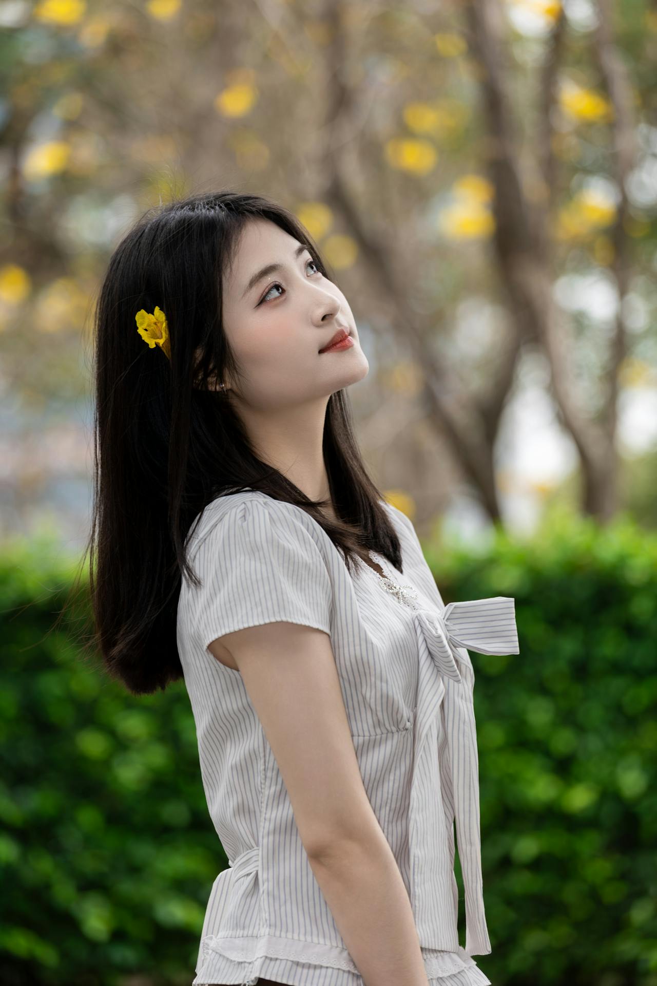 原来春天的美好,从来都藏在这些不经意的瞬间里✨黄花风铃木的黄,衬衫的白,和眼里的笑意,就是这个春天最温柔的限定呀~
