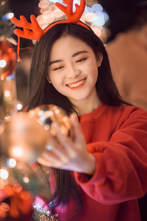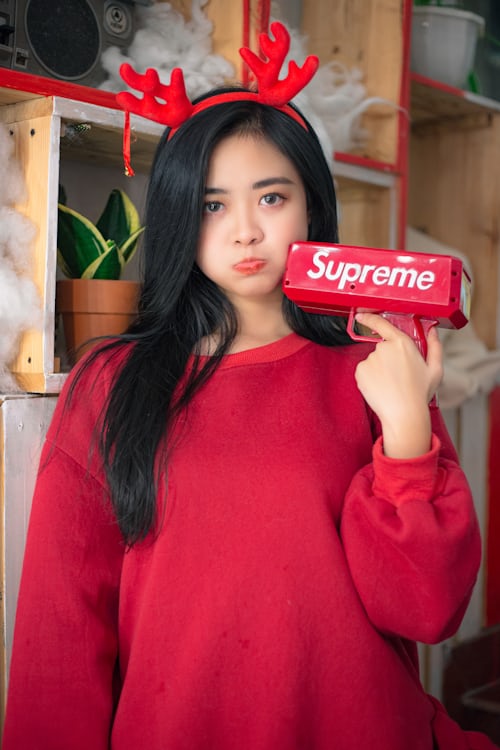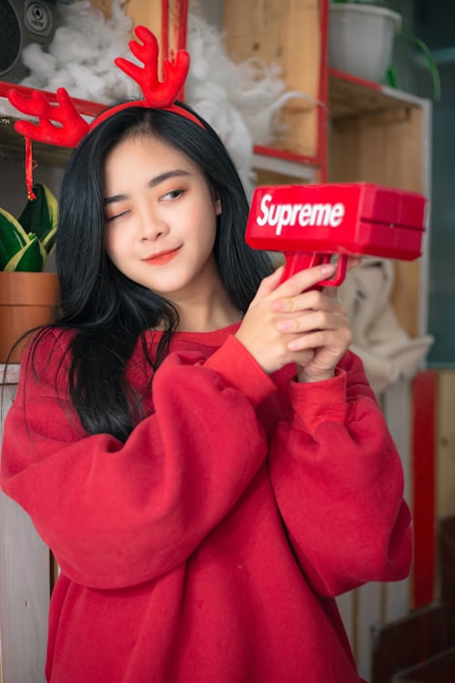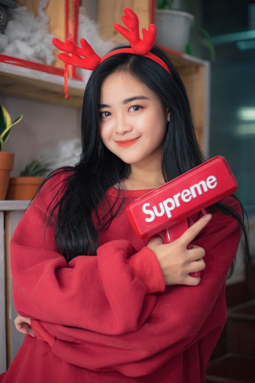 冬日的浪漫,全被圣诞氛围感承包啦🎄一身热烈的红色宽松毛衣,搭配可爱的红色小鹿发箍,把冬日的温柔与元气全部穿在身上。