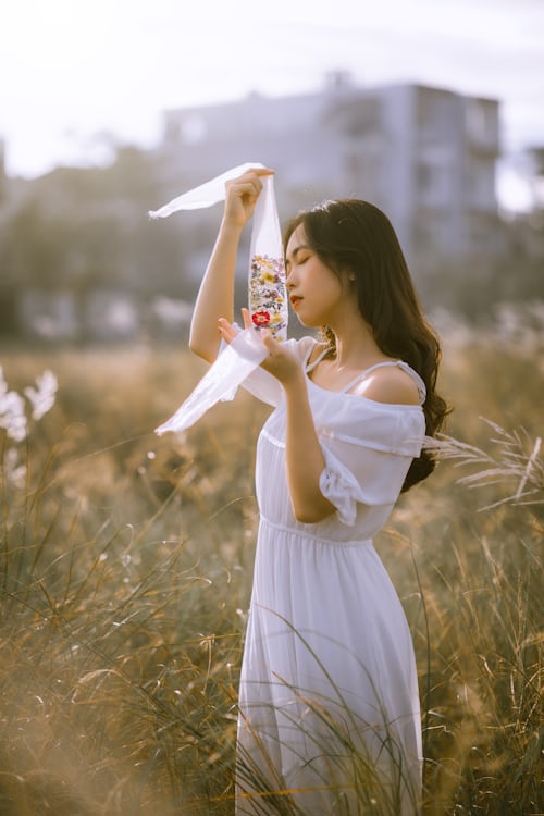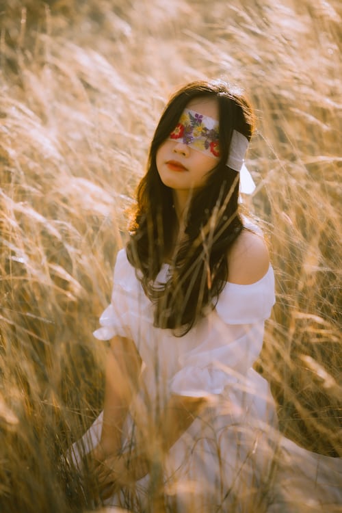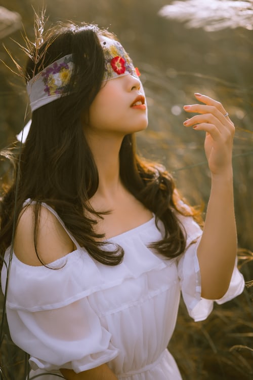 奔赴秋日的旷野,与温柔晚风撞个满怀🍂一袭轻盈飘逸的白色露肩长裙,在满片枯黄的草丛间,化作山野里最干净的月光。蓬松卷发随风轻扬,碎花蒙眼丝带自带朦胧艺术氛围感,温柔又充满独特故事感。