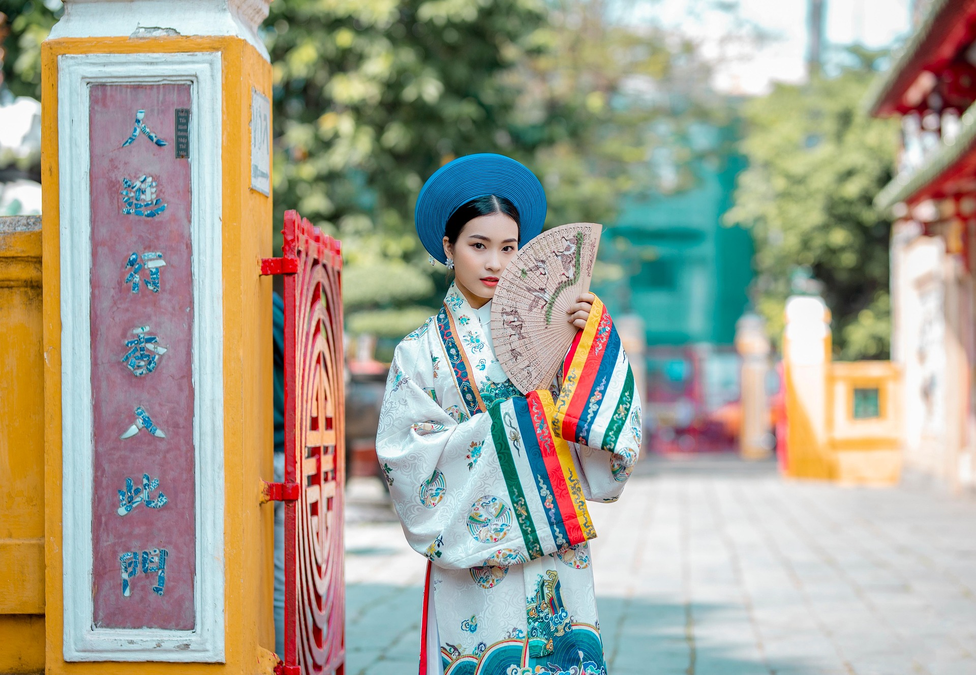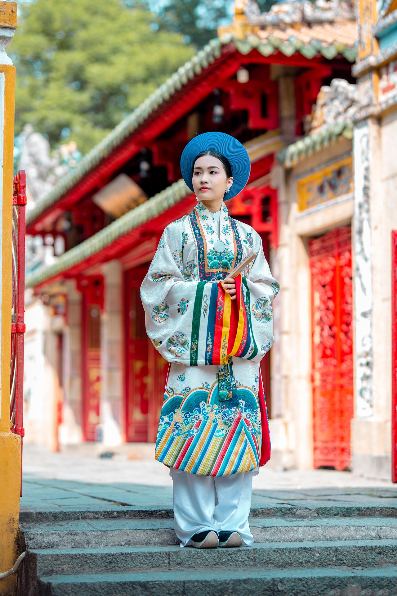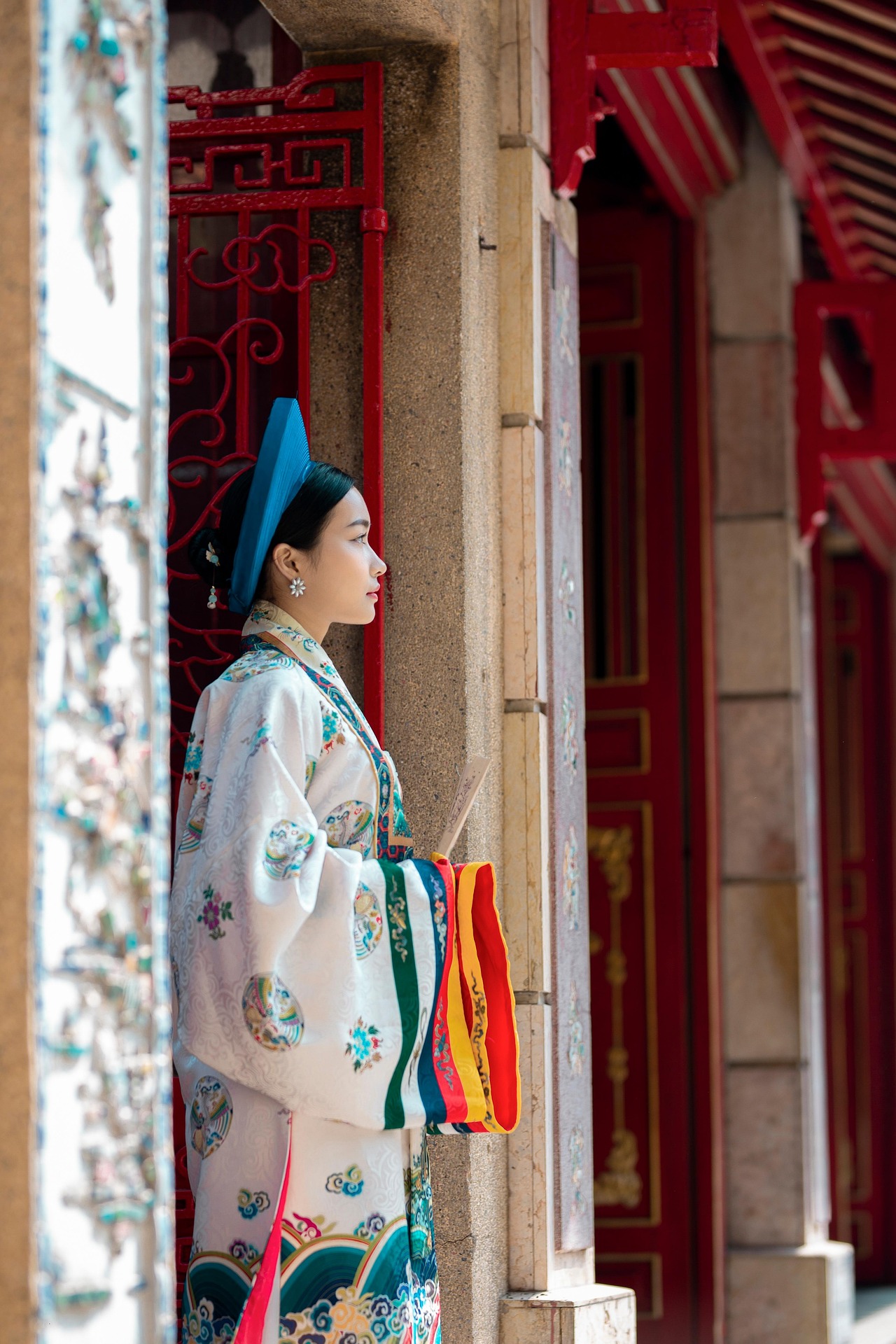 画面中,少女身着一袭精致繁复的传统服饰,立于古色古香的庙宇门前。明艳的蓝色圆帽端庄典雅,与素雅的白色衣袍形成极致对比;衣摆处五彩斑斓的竖条纹装饰,如彩虹般流淌,为整体增添了活泼与灵动。繁复的团花纹样细腻考究,手持的折扇半遮容颜,尽显东方女子的含蓄温婉。