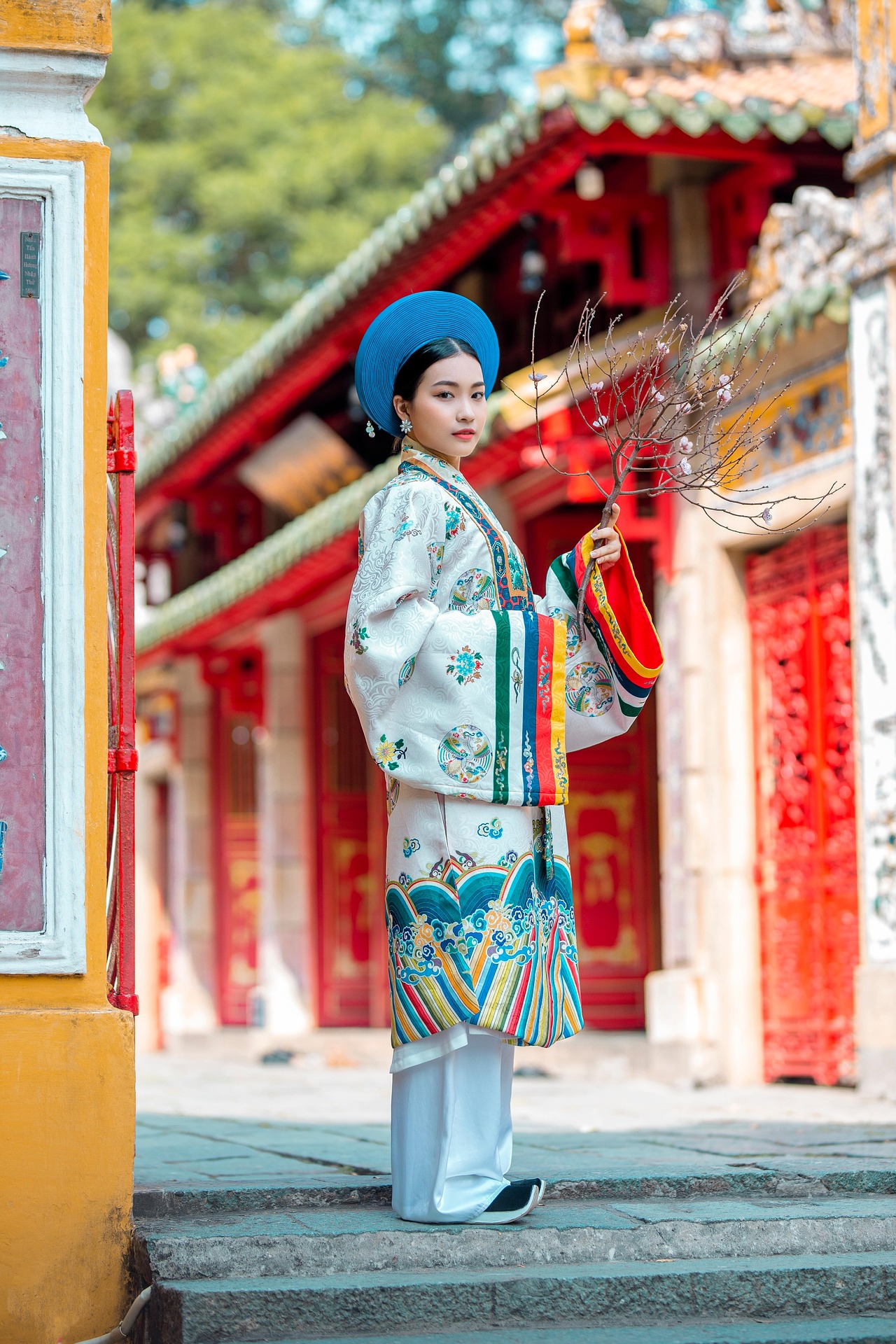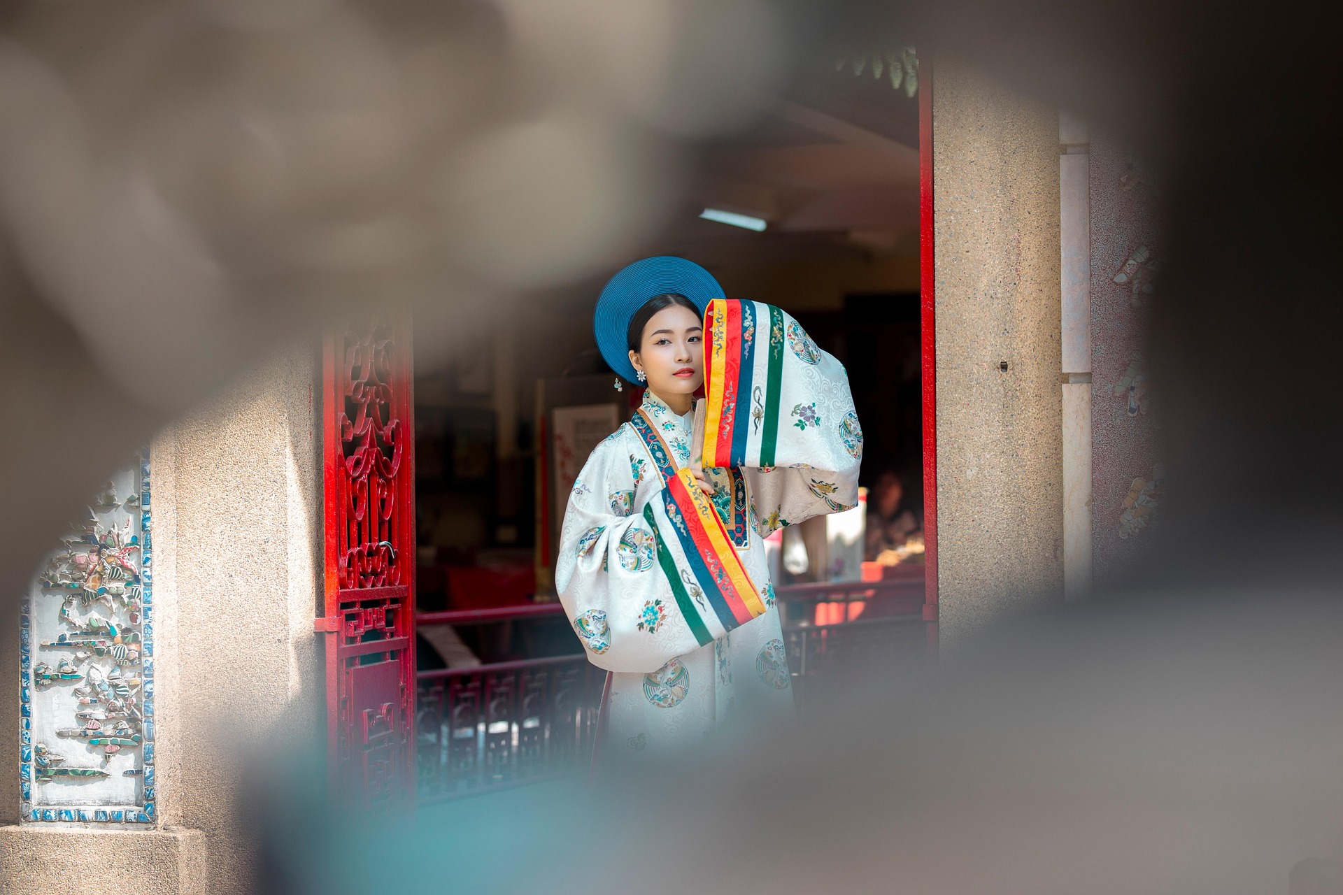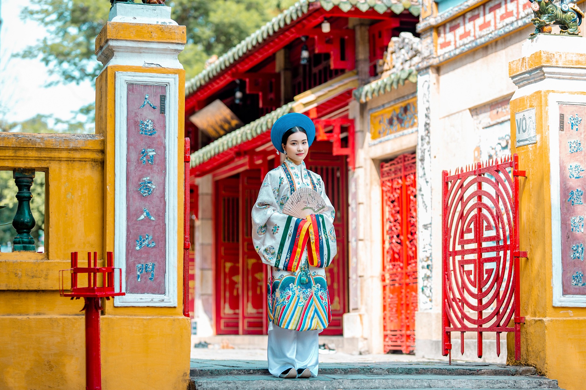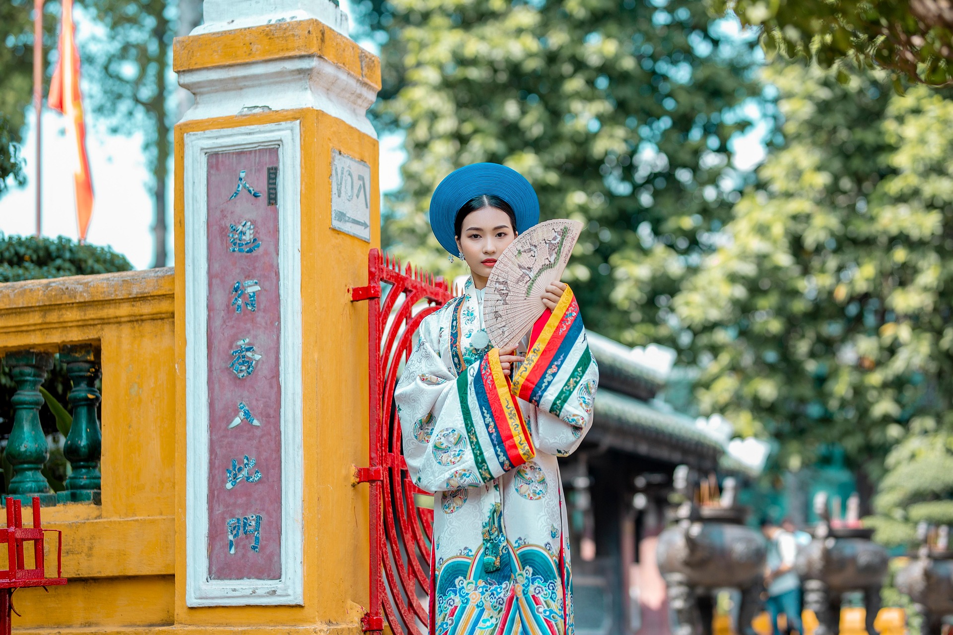 画面中,少女身着一袭精致繁复的传统服饰,立于古色古香的庙宇门前。明艳的蓝色圆帽端庄典雅,与素雅的白色衣袍形成极致对比;衣摆处五彩斑斓的竖条纹装饰,如彩虹般流淌,为整体增添了活泼与灵动。繁复的团花纹样细腻考究,手持的折扇半遮容颜,尽显东方女子的含蓄温婉。
