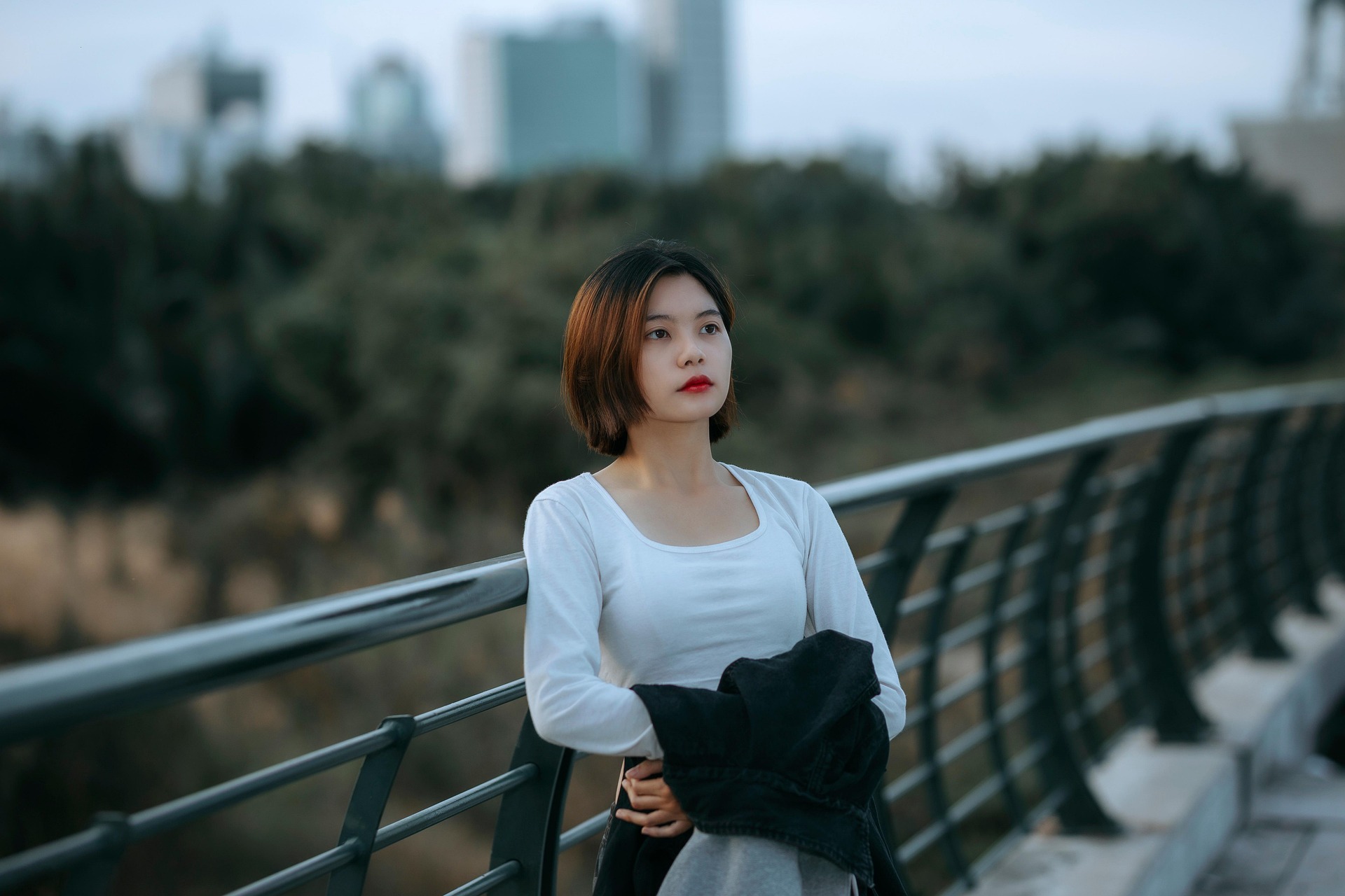 少女或静倚栏杆,眼神望向远方,流露着淡淡的心事与向往;或侧身回眸,与镜头无声对话。身后是林立的高楼与模糊的城市轮廓,身前是铁艺栏杆与萧瑟的草木,冷暖色调交织,将都市里的孤独、清醒与自由完美定格。