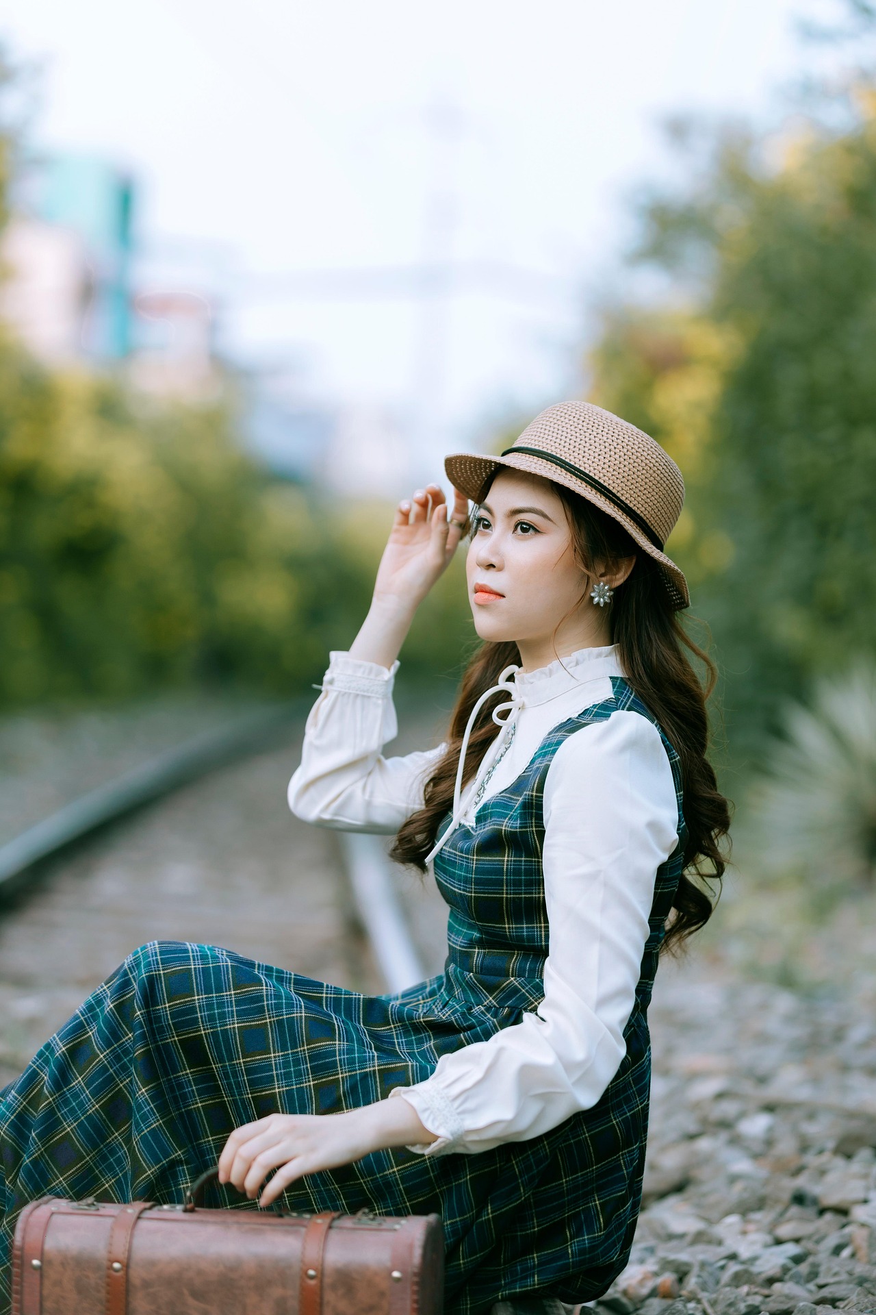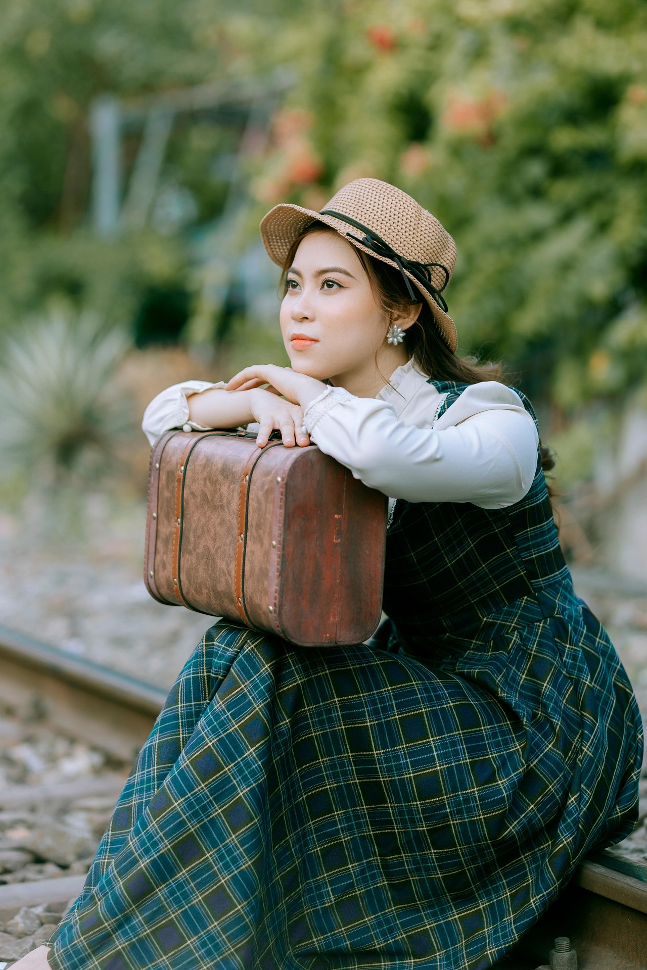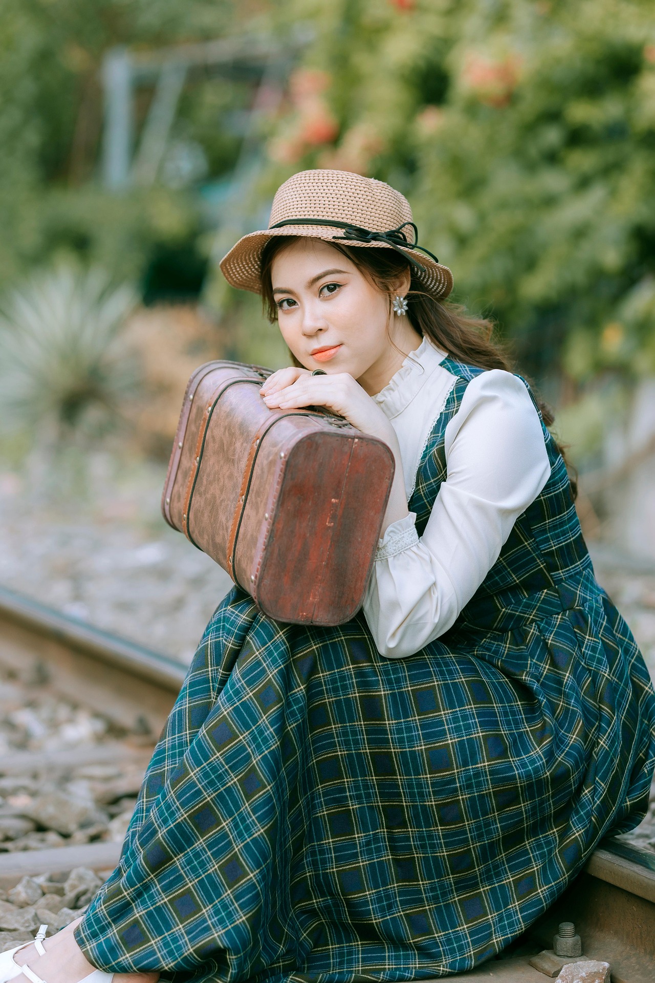 少女静静坐在铁轨之上,时而抬手轻扶帽檐,时而将脸颊轻轻枕在行李箱上,眉眼温柔,眼波里藏着淡淡的静谧与期许。周遭绿意盎然,光影柔和洒落,每一个从容恬淡的姿态,都像老电影里的经典画面,带着穿越时光的温柔质感,将独属于复古文艺的浪漫与诗意,永久留存。