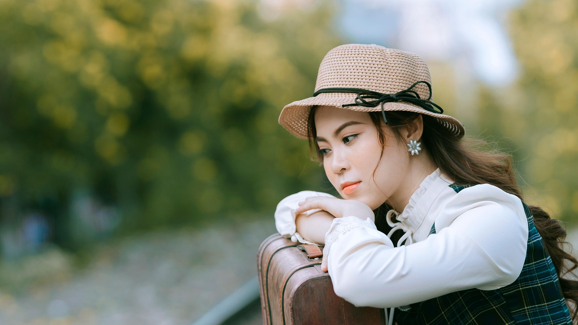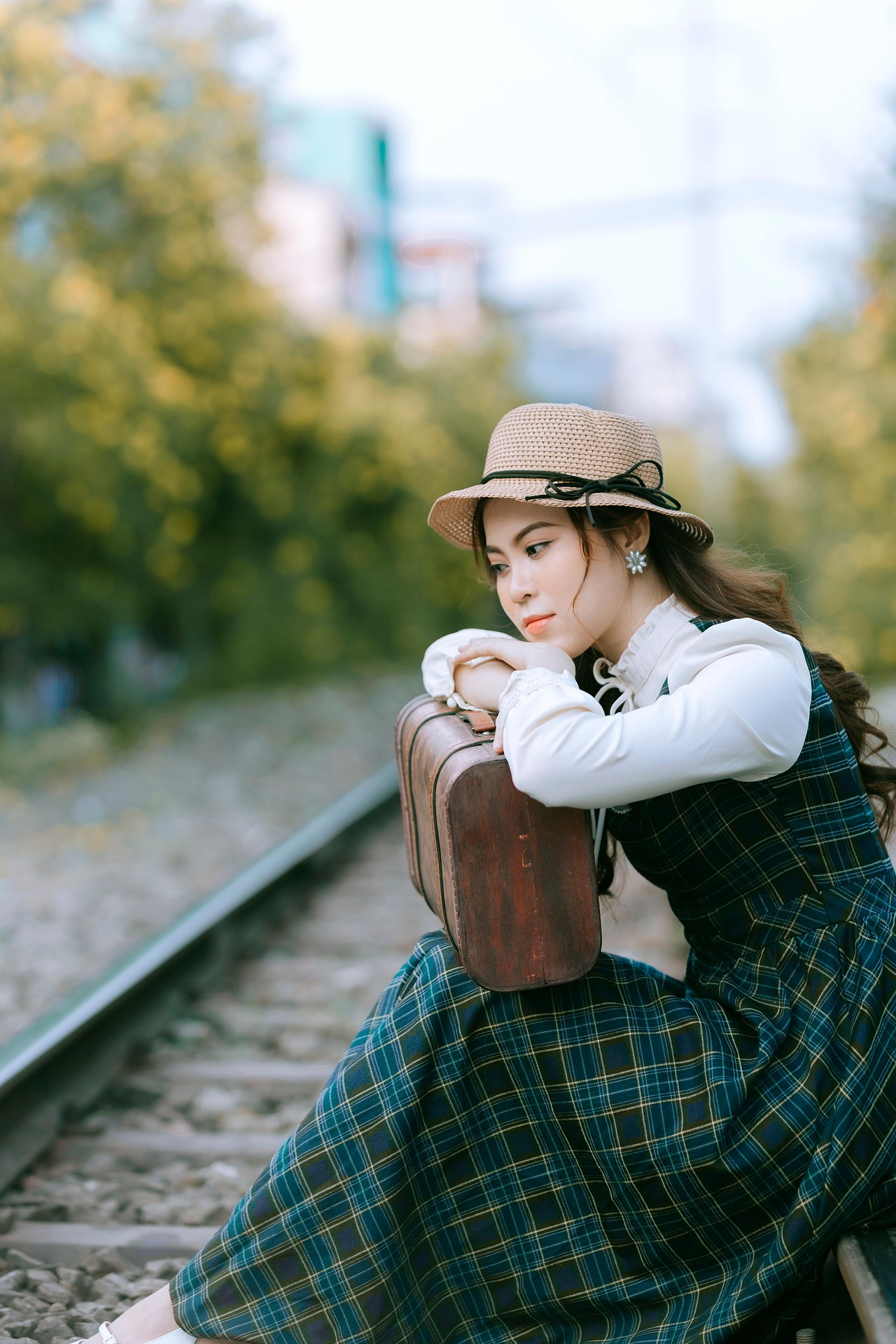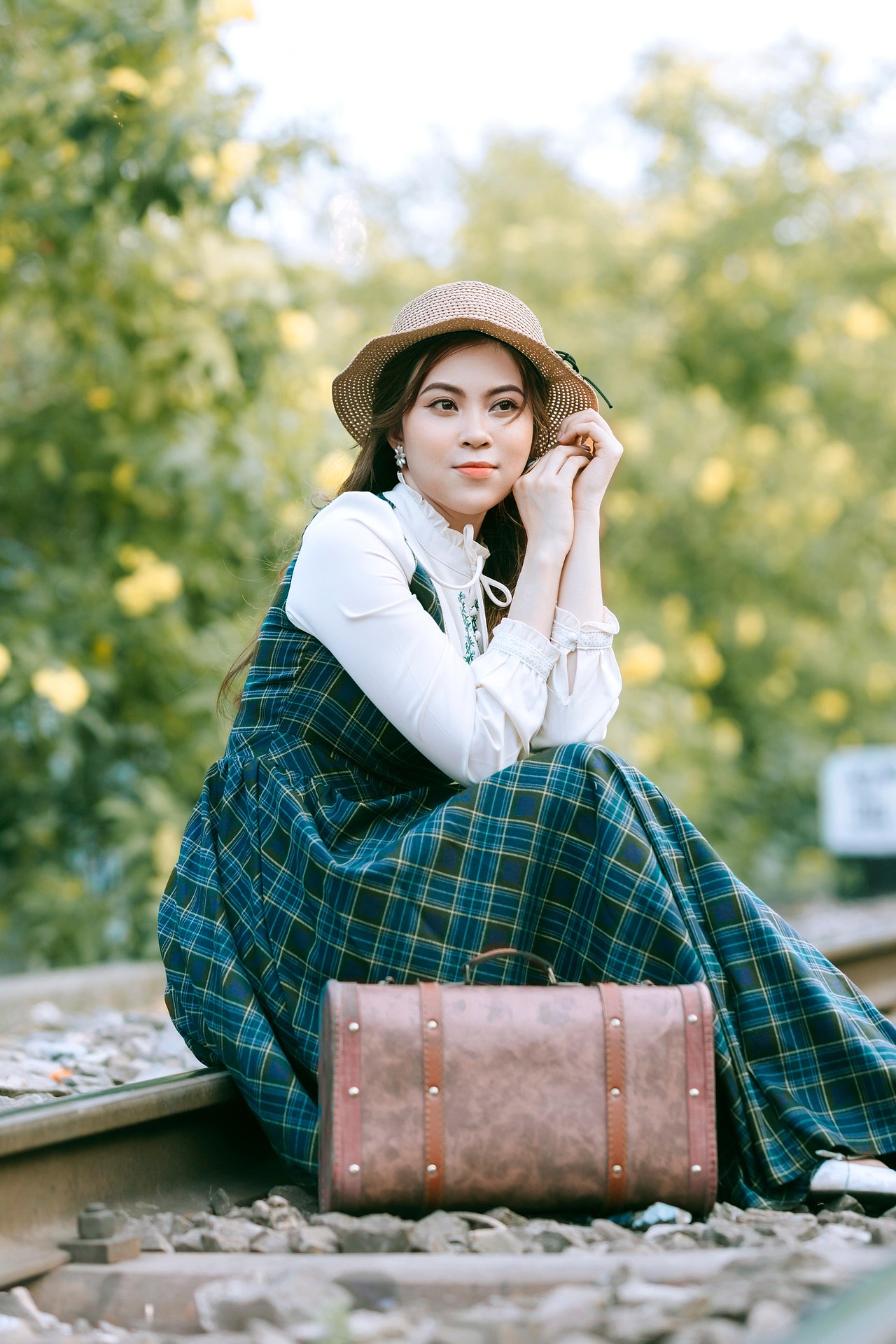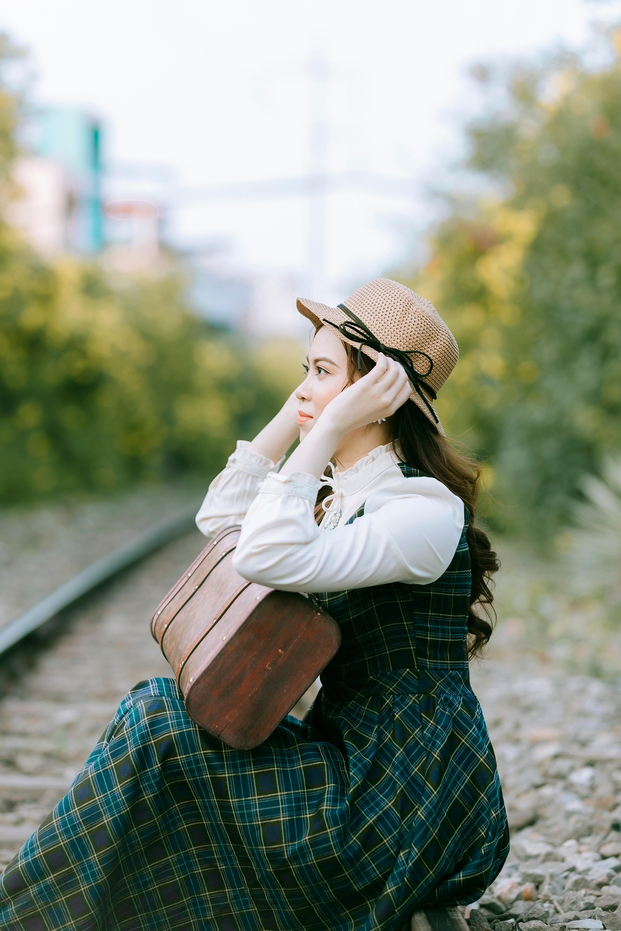 少女静静坐在铁轨之上,时而抬手轻扶帽檐,时而将脸颊轻轻枕在行李箱上,眉眼温柔,眼波里藏着淡淡的静谧与期许。周遭绿意盎然,光影柔和洒落,每一个从容恬淡的姿态,都像老电影里的经典画面,带着穿越时光的温柔质感,将独属于复古文艺的浪漫与诗意,永久留存。