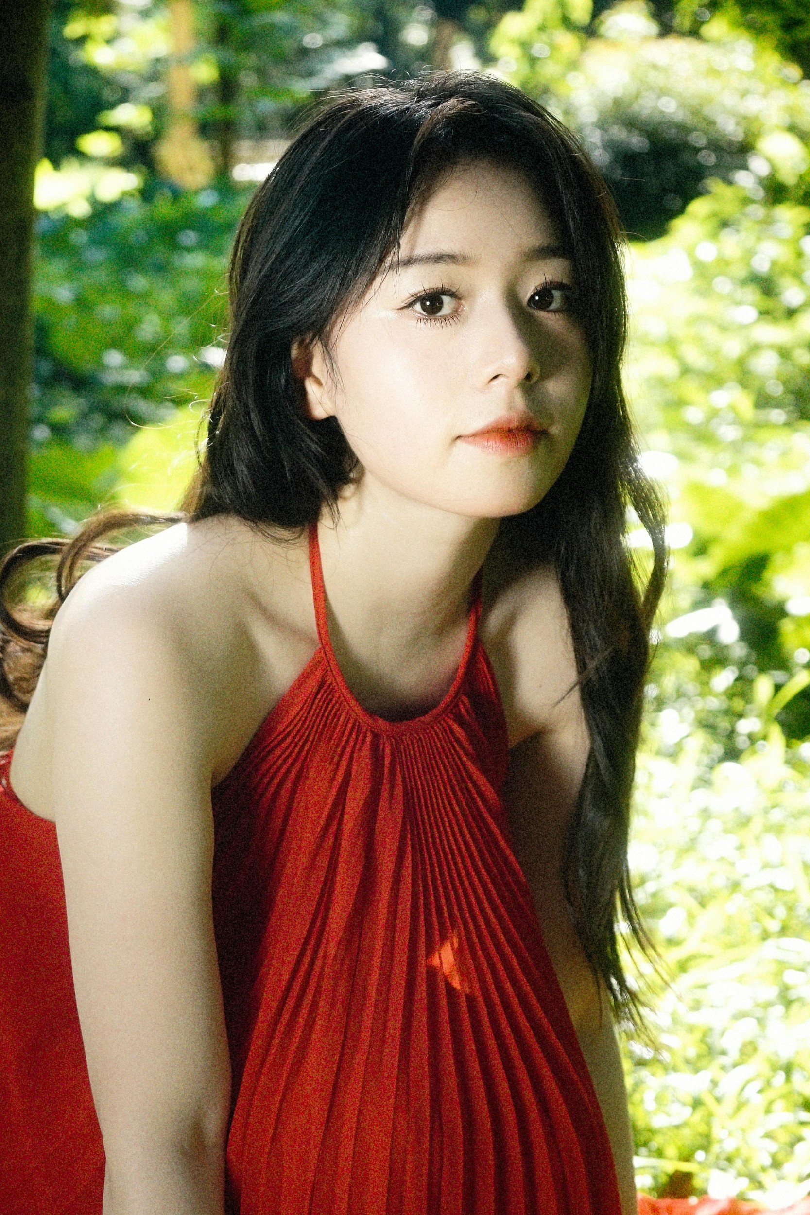 红色裙摆与葱郁绿意撞出最鲜活的色彩,每一张照片都像一首轻快的夏日小诗,写满了无忧无虑的少女心事。