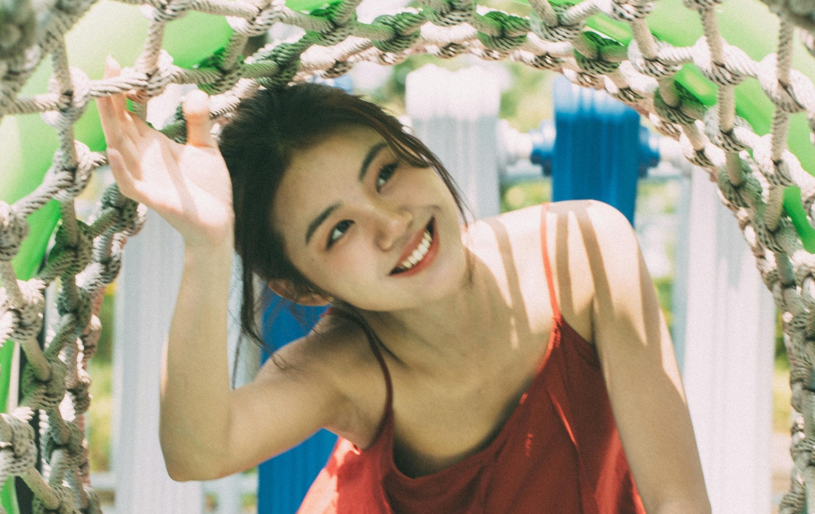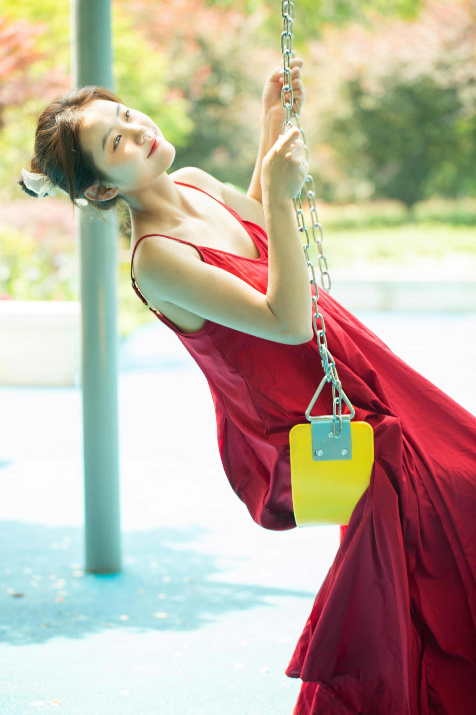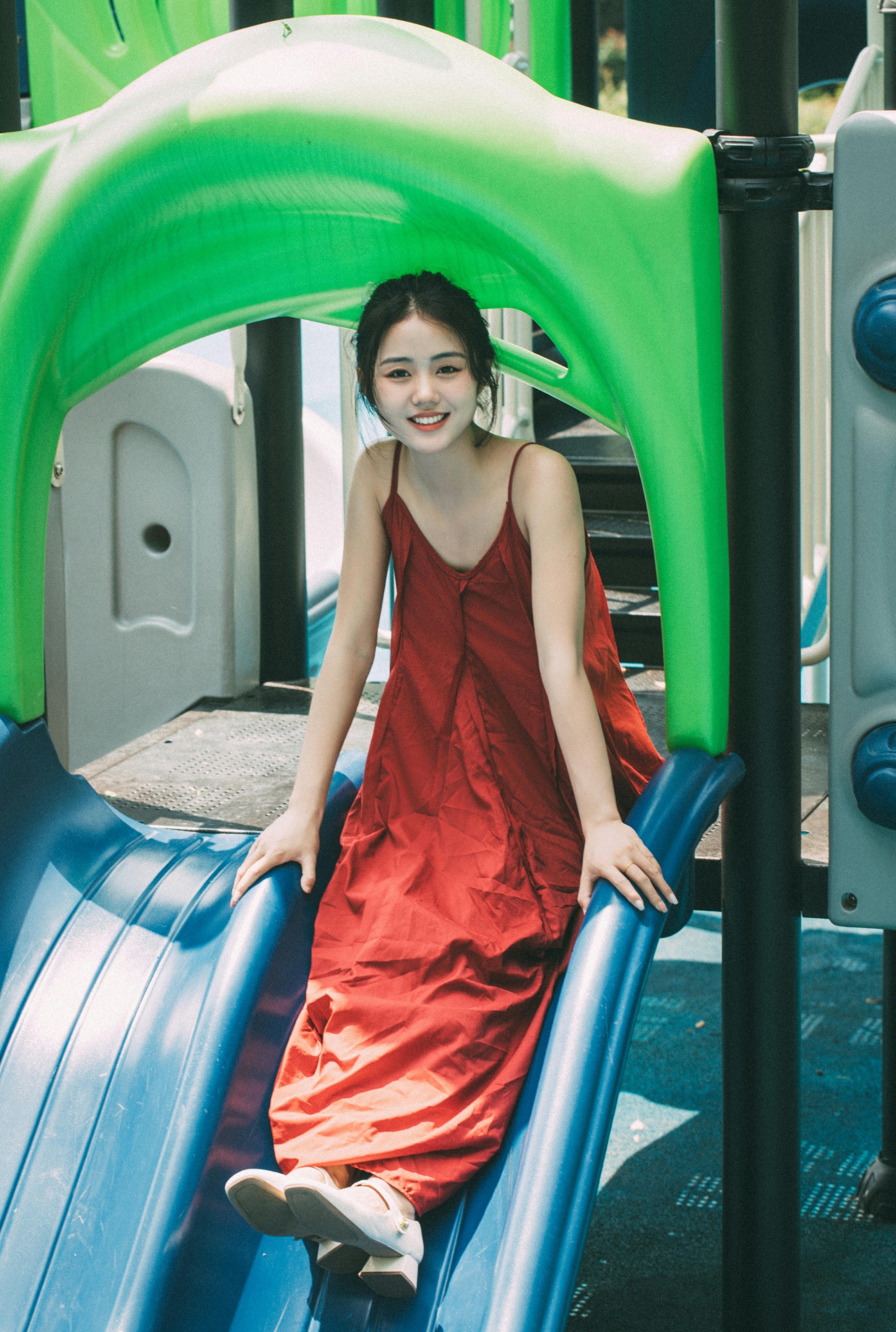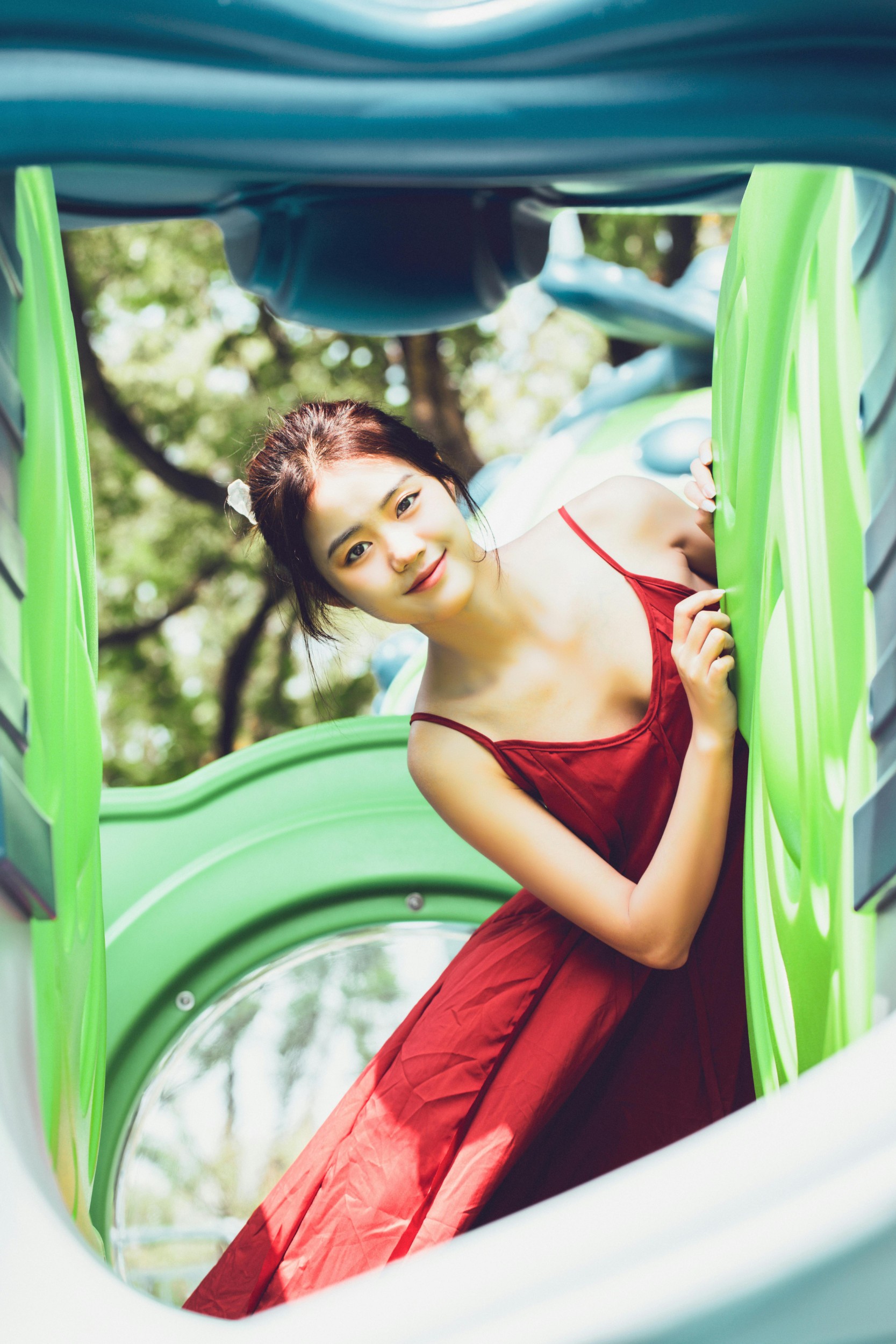 她穿着热烈的红裙,闯进了绿意盎然的游乐园。秋千上的她轻闭双眼,感受风掠过发梢;滑梯里的她探出脑袋,笑容比阳光还要耀眼;网洞里的她透过光影,眼里盛满了夏日的细碎星光。