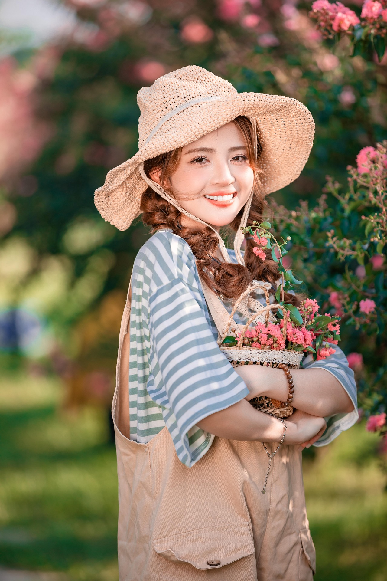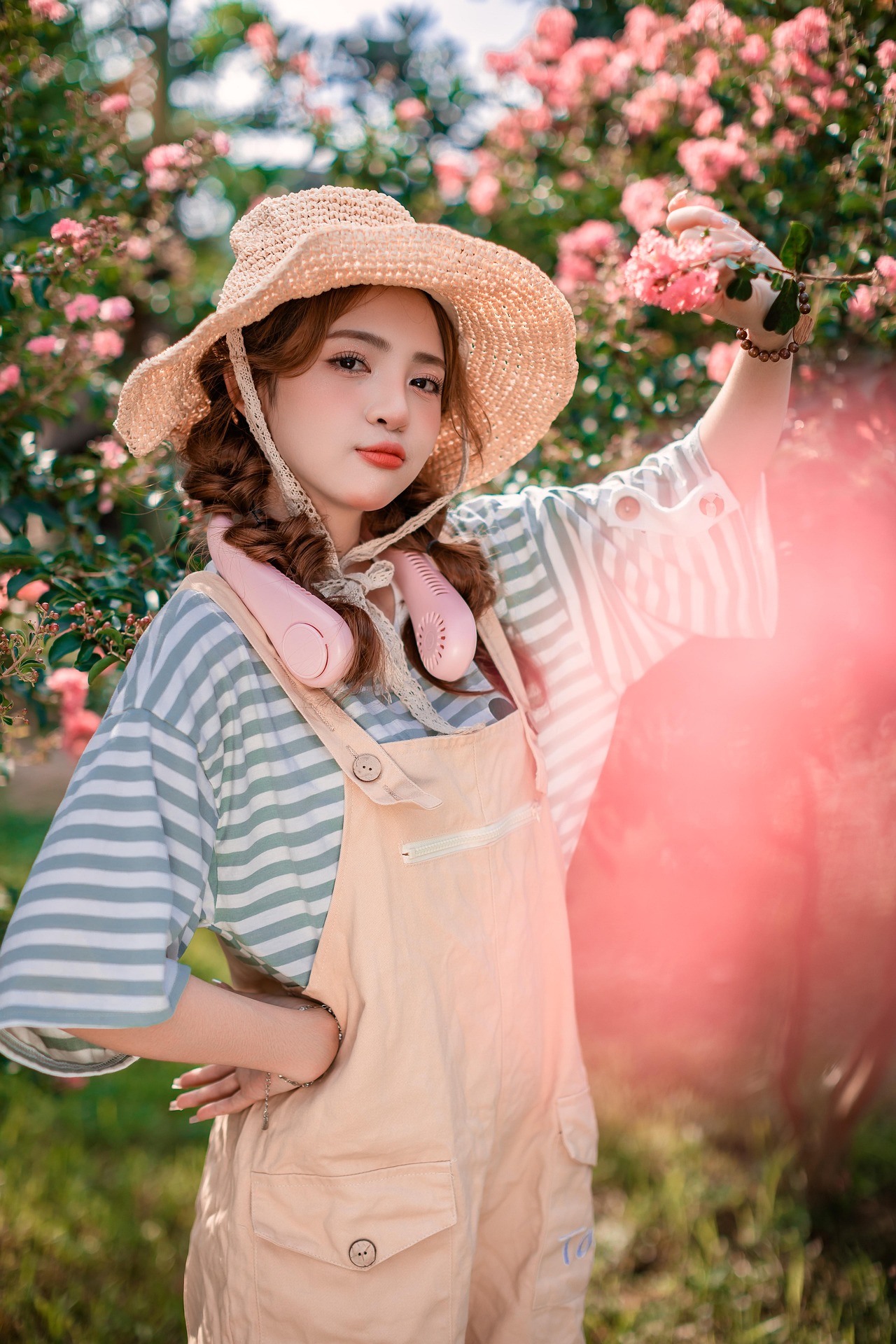 浅棕草帽搭配休闲背带裤与条纹 T 恤,松弛又元气,双马尾卷发衬出满满的少女灵动。鼻尖轻凑近花香,抬手轻拈花枝,甜甜笑意漫在眉眼之间,脖颈的小风扇、手里的小花篮,都为这份夏日悠闲添了恰到好处的俏皮。