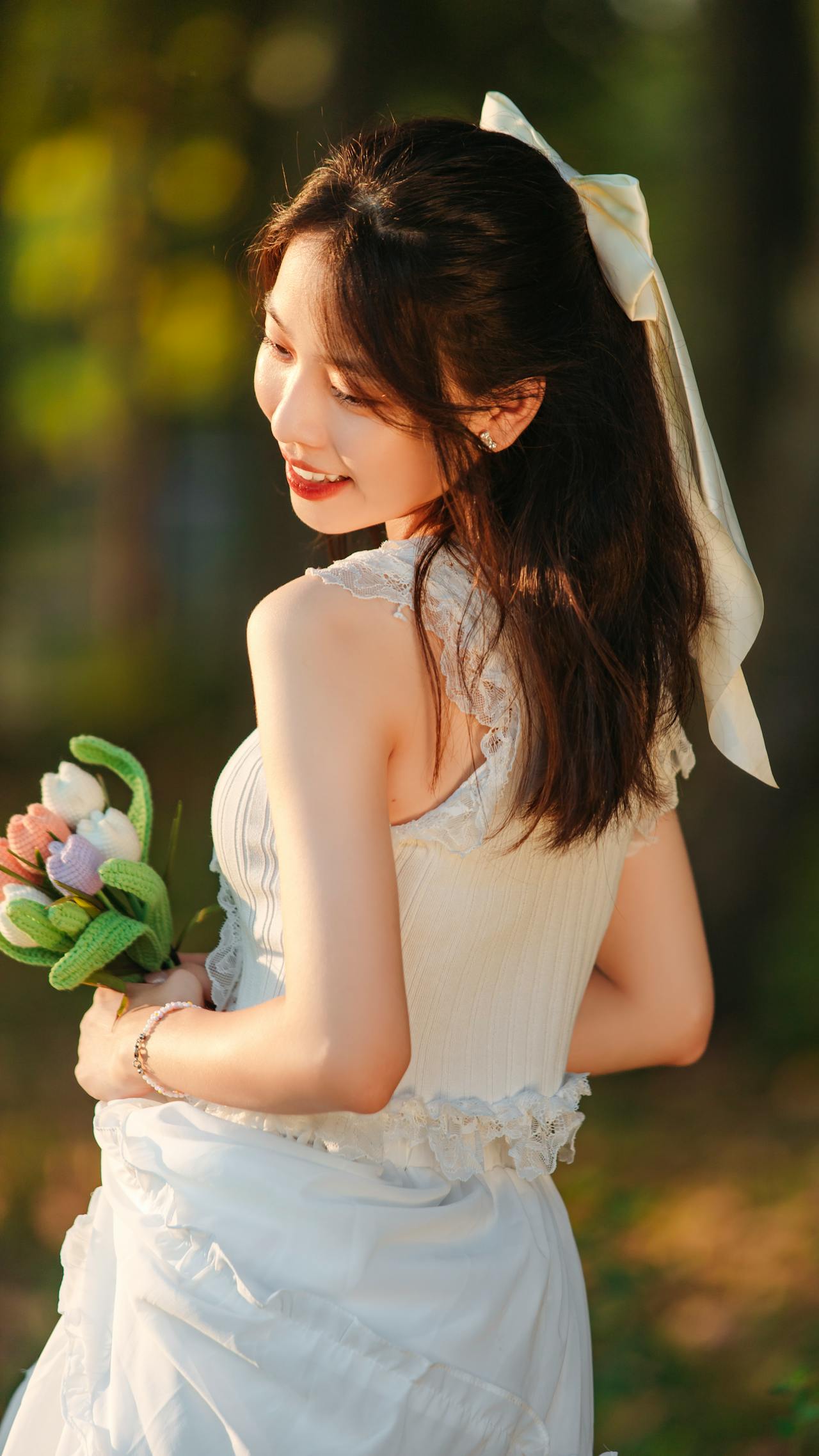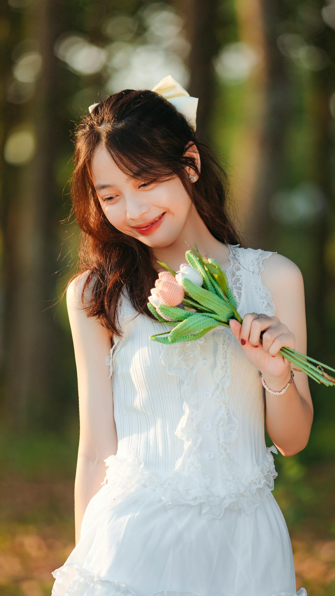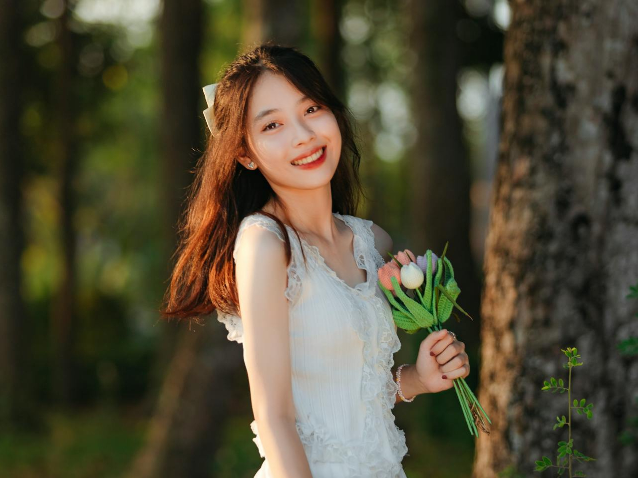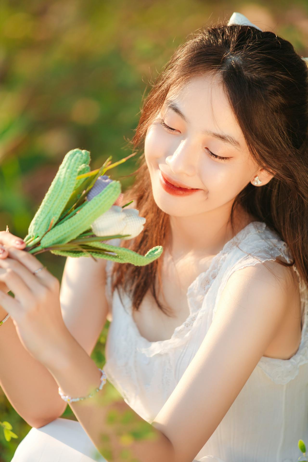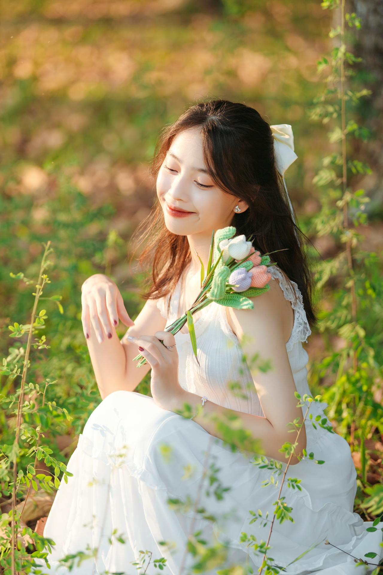 蹲在草地上时,她闭着眼笑,连空气里都带着青草的清香。手作的郁金香软乎乎的,像把一整个春天的温柔都捧在了手心。暖调的光晕、林间的绿意,和少女眼里的星光,撞出了独有的治愈感💛