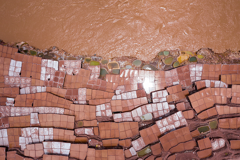 澜沧江边的芒康盐井,是一盘整齐排列的生巧克力。红褐色的盐田像一块块丝滑的黑巧,大小均匀的池面泛着哑光,沿着河岸铺开,如同手工巧克力的排块,带着天然的 “可可棕” 质感。