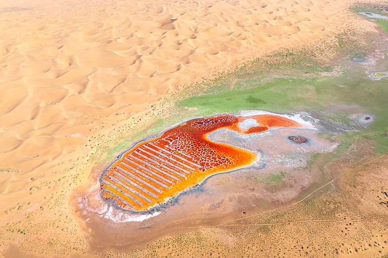 沙漠里的红盐湖,像一块纹理清晰的战斧牛排!红色的盐滩是鲜嫩的肉质,白色的盐纹是天然的脂肪纹理,边缘的浅滩则带着 “煎烤” 后的焦边感,被黄沙包裹着,仿佛一块刚出锅的大漠风味牛排。