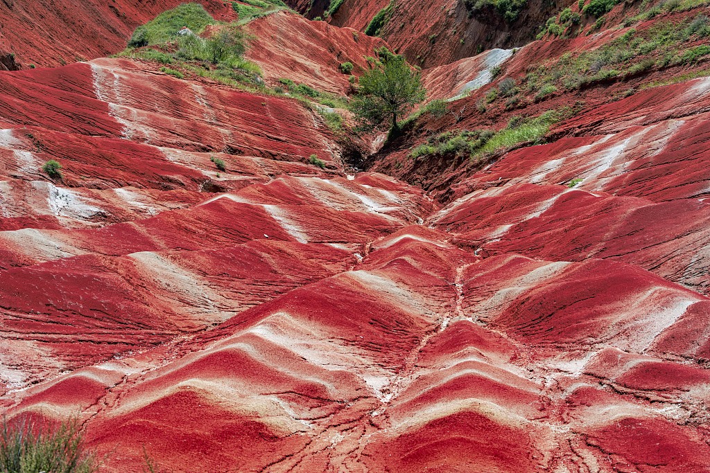 红层地貌的临夏山地,神似一卷纹理分明的山羊肉卷。赤红的山体带着天然的 “肉色”,被白色条带分隔出均匀的 “肥瘦相间”,褶皱起伏的线条,和刚切好的羊肉卷纹理一模一样,自带新鲜的 “食欲感”。