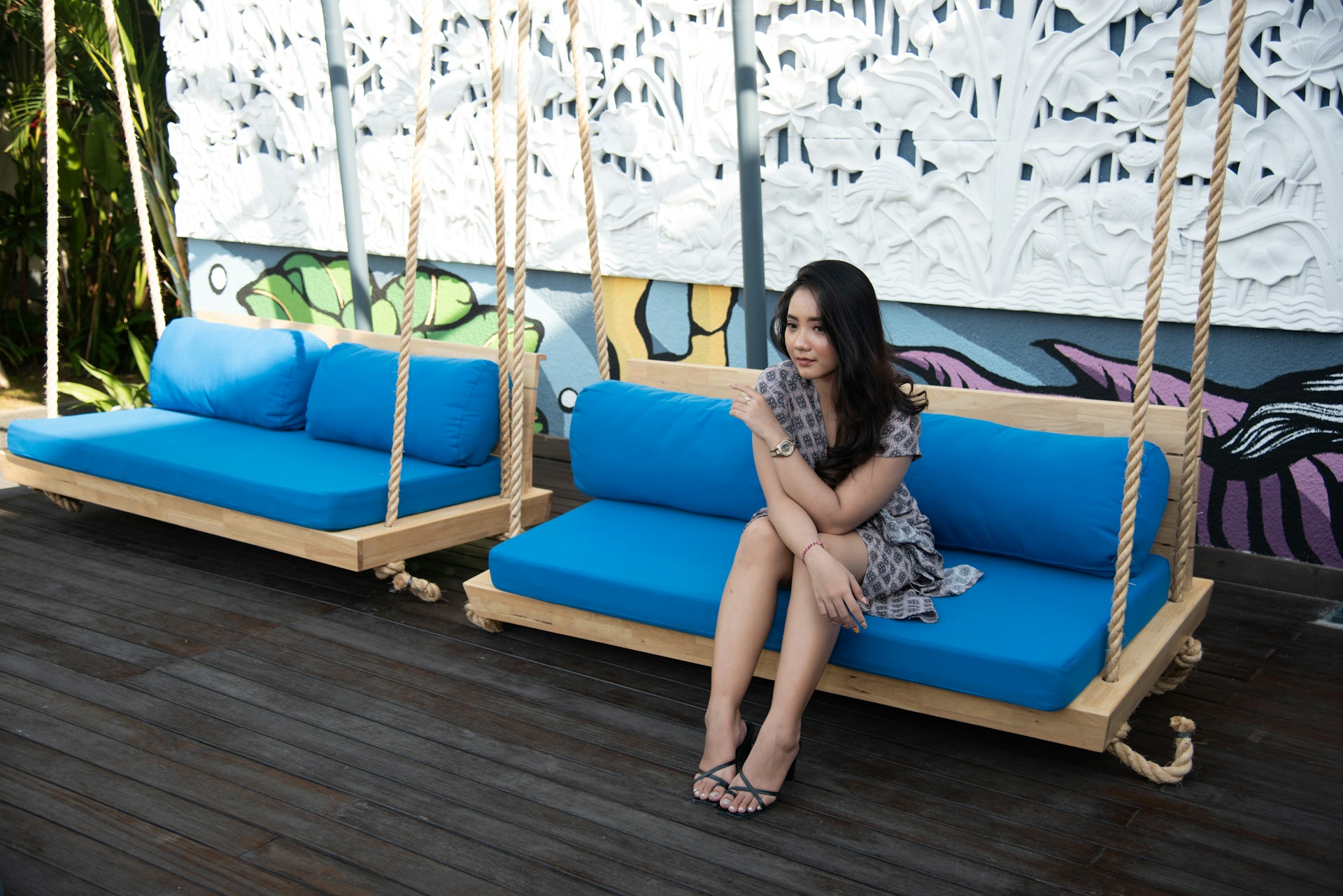 斑斓的涂鸦花墙像打翻了调色盘🎨,浓郁的色彩碰撞出鲜活的街头氛围。少女修身的裙装勾勒出利落的线条,慵懒倚靠在墙边,眉眼间尽是甜酷交织的随性。