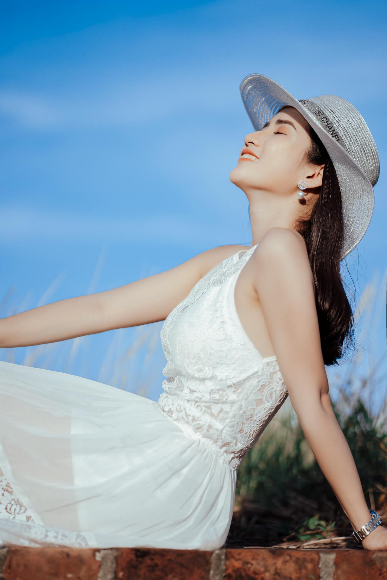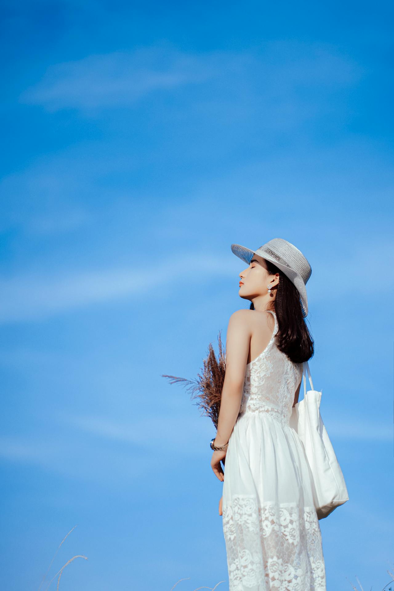 蕾丝长裙在风里轻轻摆动,草帽檐滤过细碎的阳光,手里的芦苇穗跟着风一起摇晃,连空气里都飘着松弛的味道。她或仰头迎着阳光微笑,或举着芦苇轻嗅,蓝天是最干净的背景板,把所有的温柔与明媚都衬得恰到好处。
