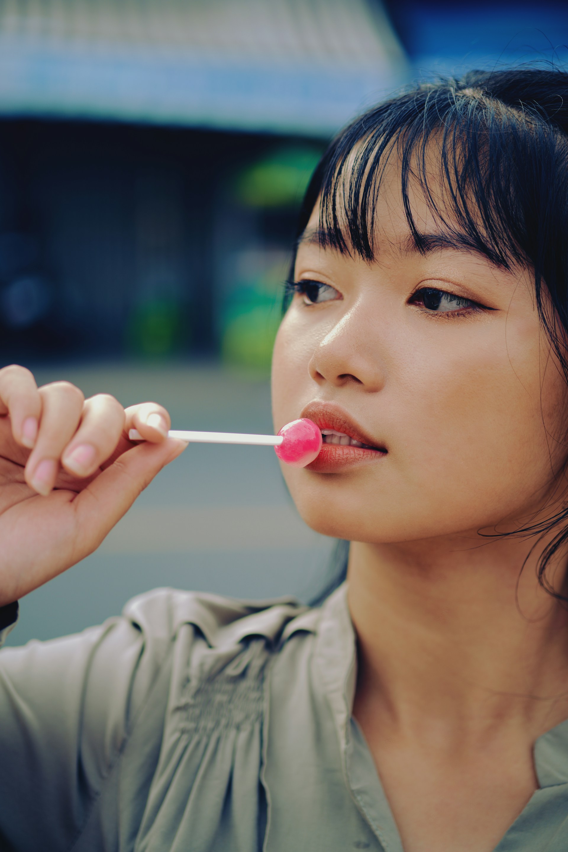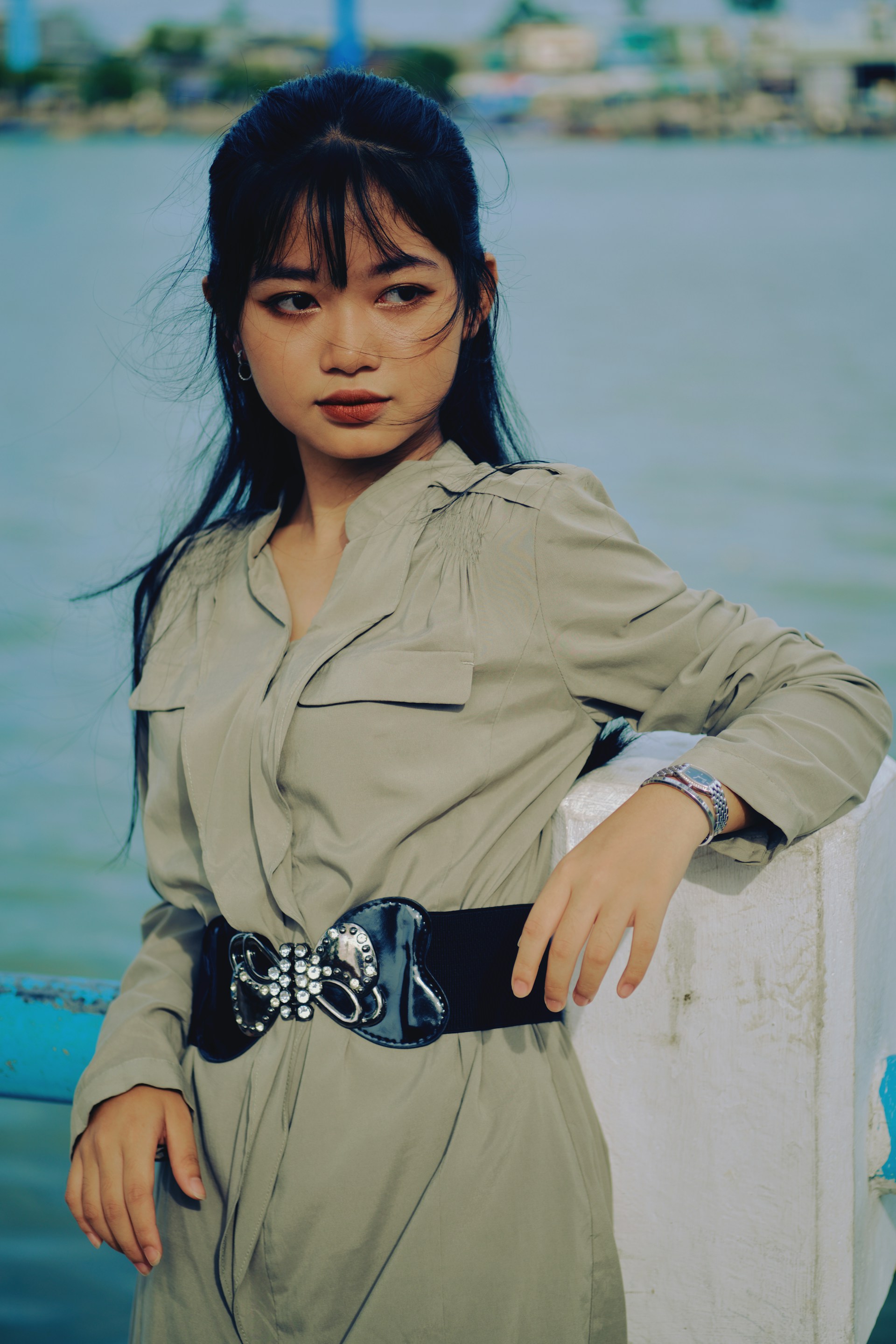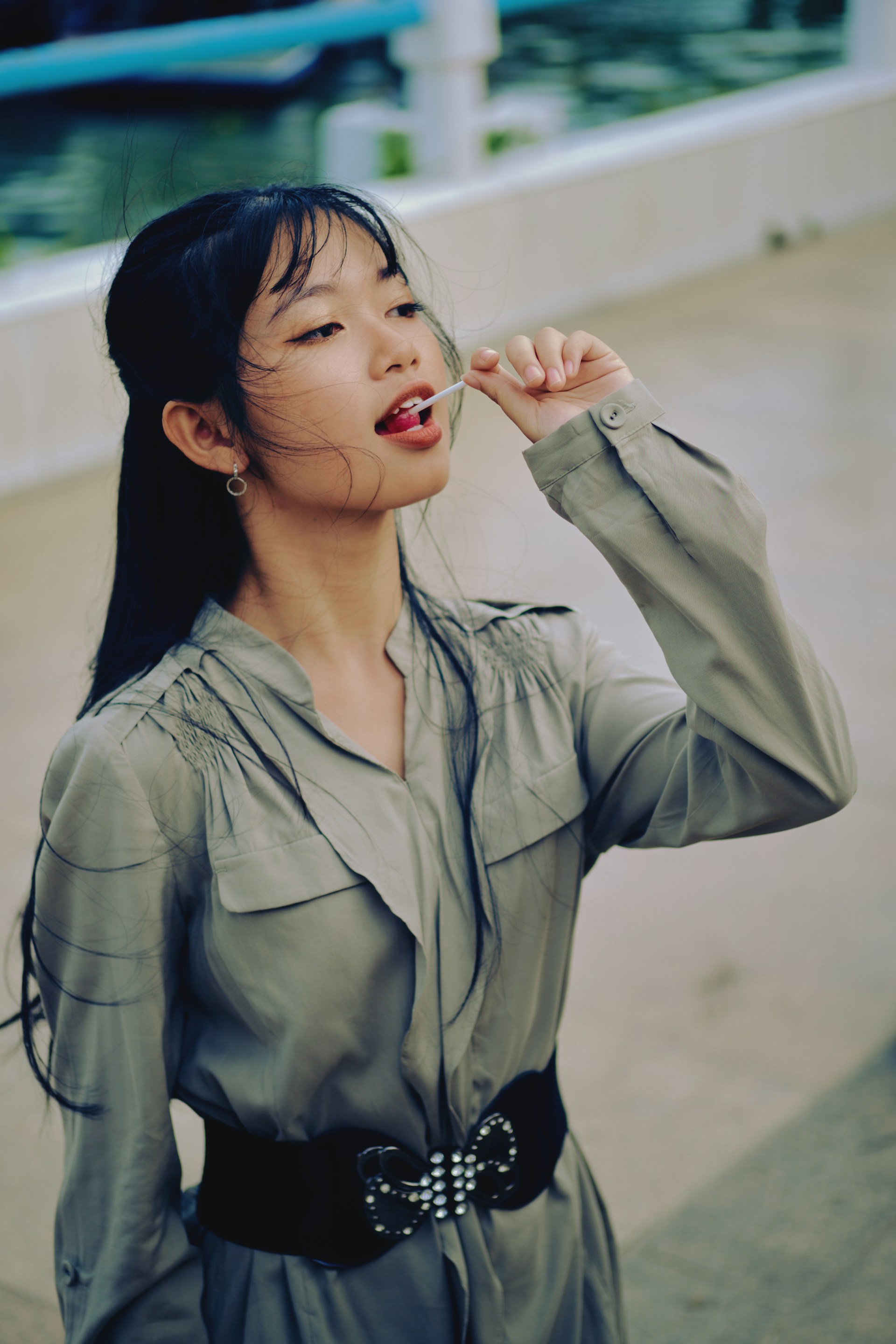河风带着水汽漫过岸边,把天光揉成温柔的灰调,落在她的衬衫上。宽腰带勾勒出利落线条,发梢被风轻轻吹起,带着几分不设防的随性。她抬手拨弄发丝,或是衔着棒棒糖轻笑,眉眼间的慵懒与灵动,被镜头一一接住。没有浓烈的色彩,只用清浅的灰调与自然光影,把街头的松弛感和少女的鲜活,都定格成了带着旧时光质感的画面。