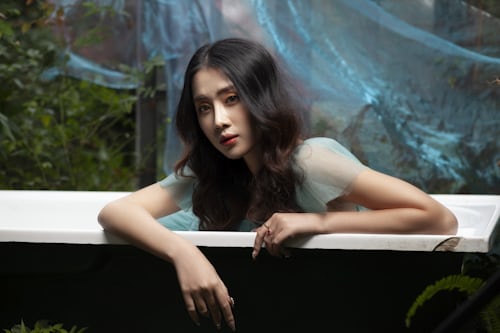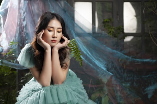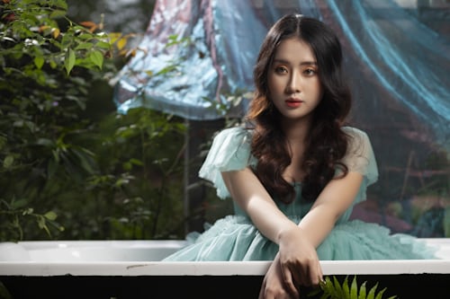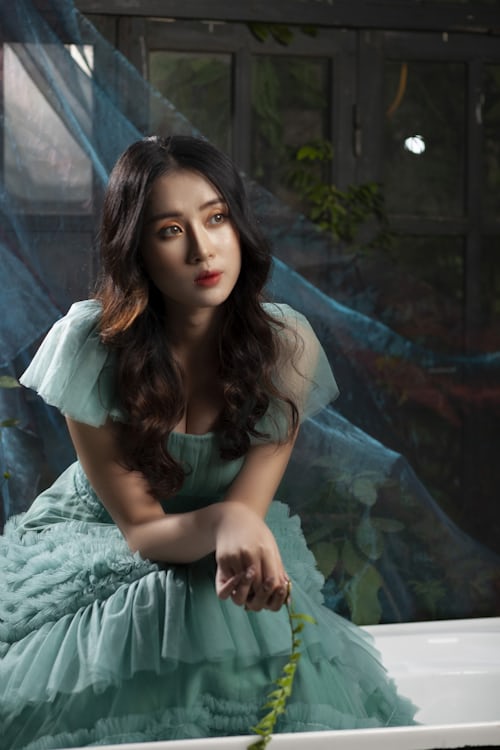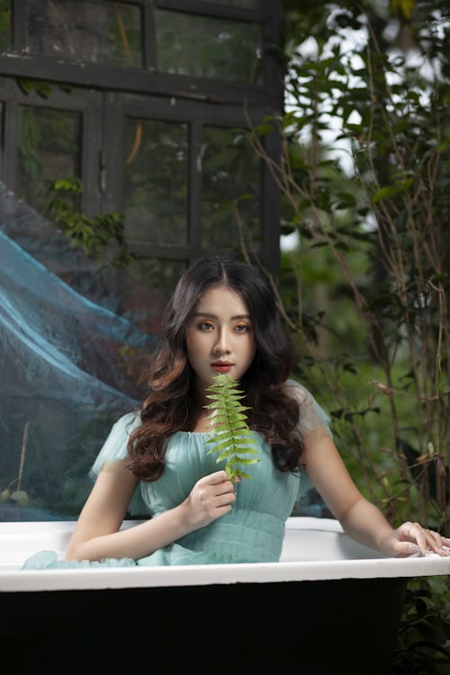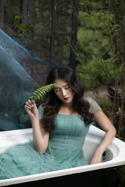 满屏清新的祖母绿网纱裙摆,自带自带森系童话的温柔氛围感🌿蓬松立体的纱裙设计,轻盈飘逸,袖口的精致设计增添少女感,在绿意环绕的空间里格外吸睛,尽显独特的气质魅力。 白色浴缸嵌入森野绿意之间,周围垂挂着朦胧蓝纱,蕨类绿叶成为画面点睛之笔💚