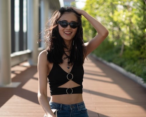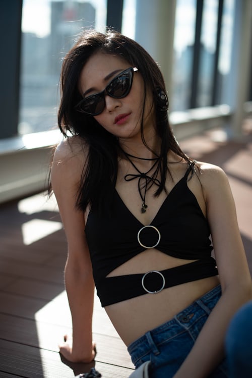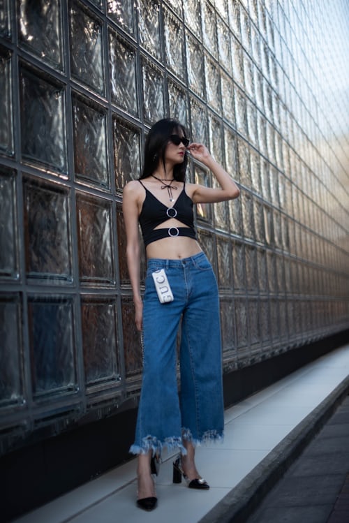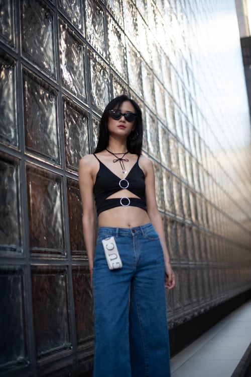 自带潮酷气场的镂空黑吊带,金属圆环与绑带设计细节感十足,利落剪裁完美勾勒身形🖤搭配复古毛边阔腿牛仔裤,慵懒松弛的裤型中和了上衣的冷艳感,经典黑蓝撞色,简约基础穿搭也能穿出超强街头格调。 复古墨镜加持冷艳御姐气质,长发随风轻扬,氛围感拉满💙