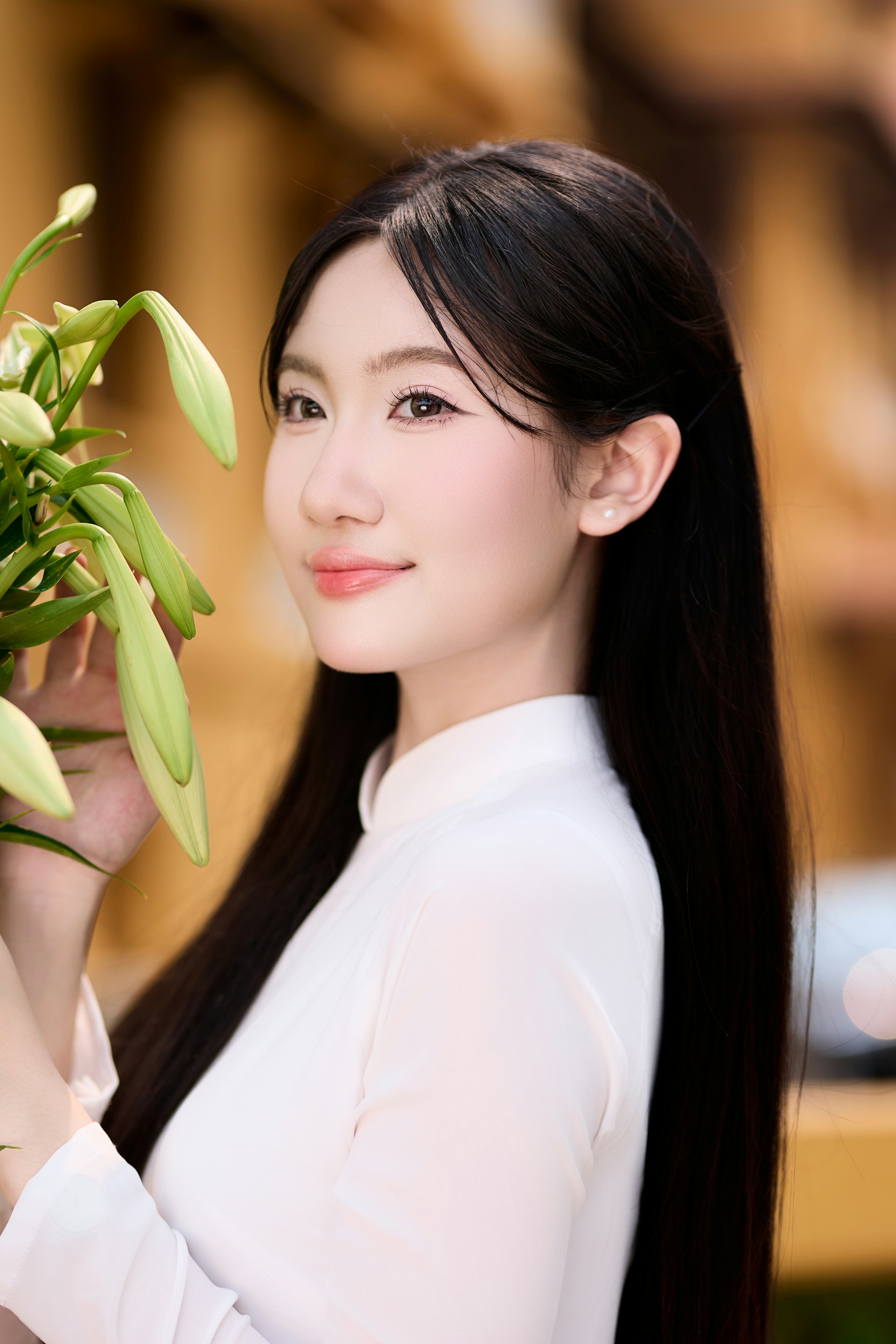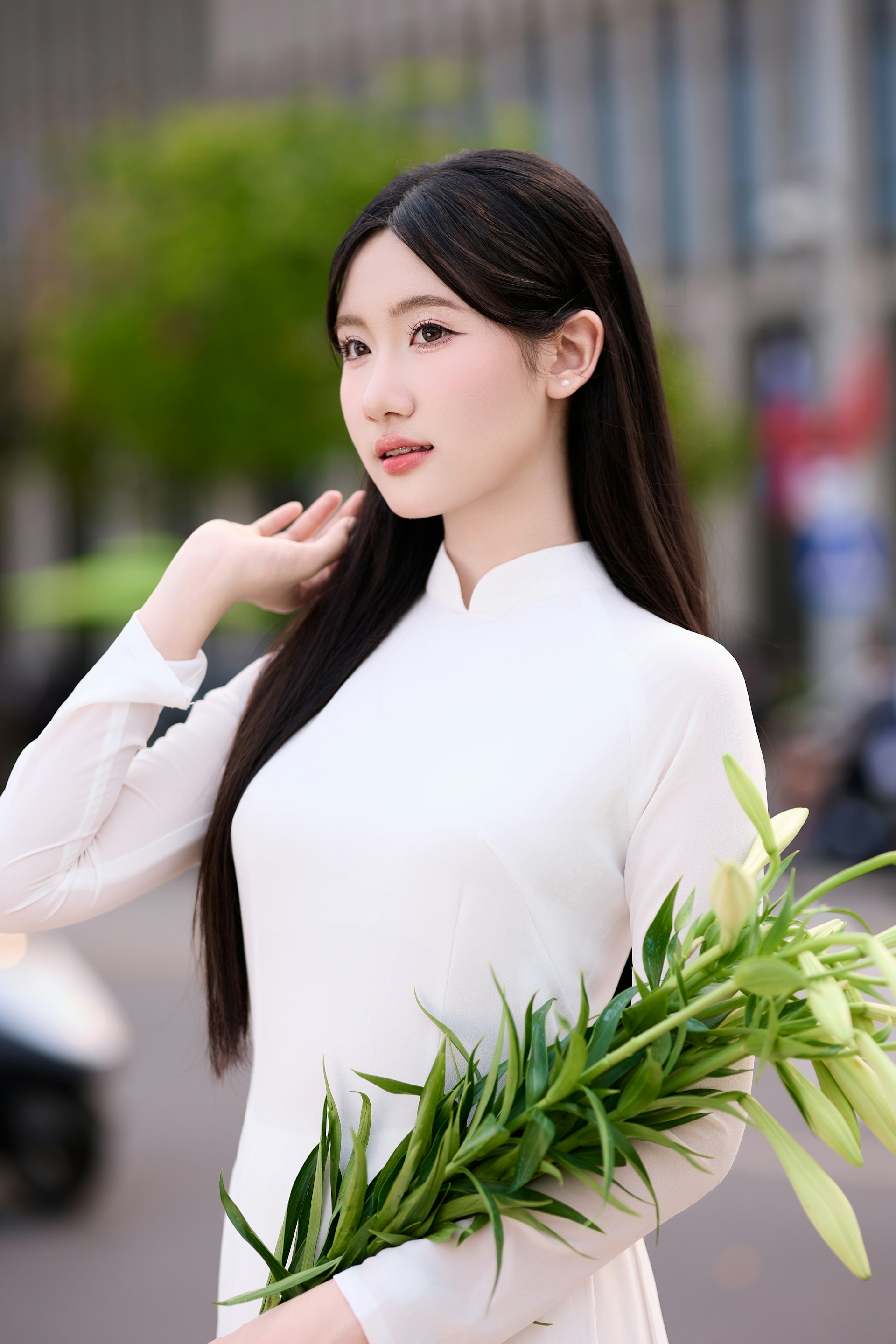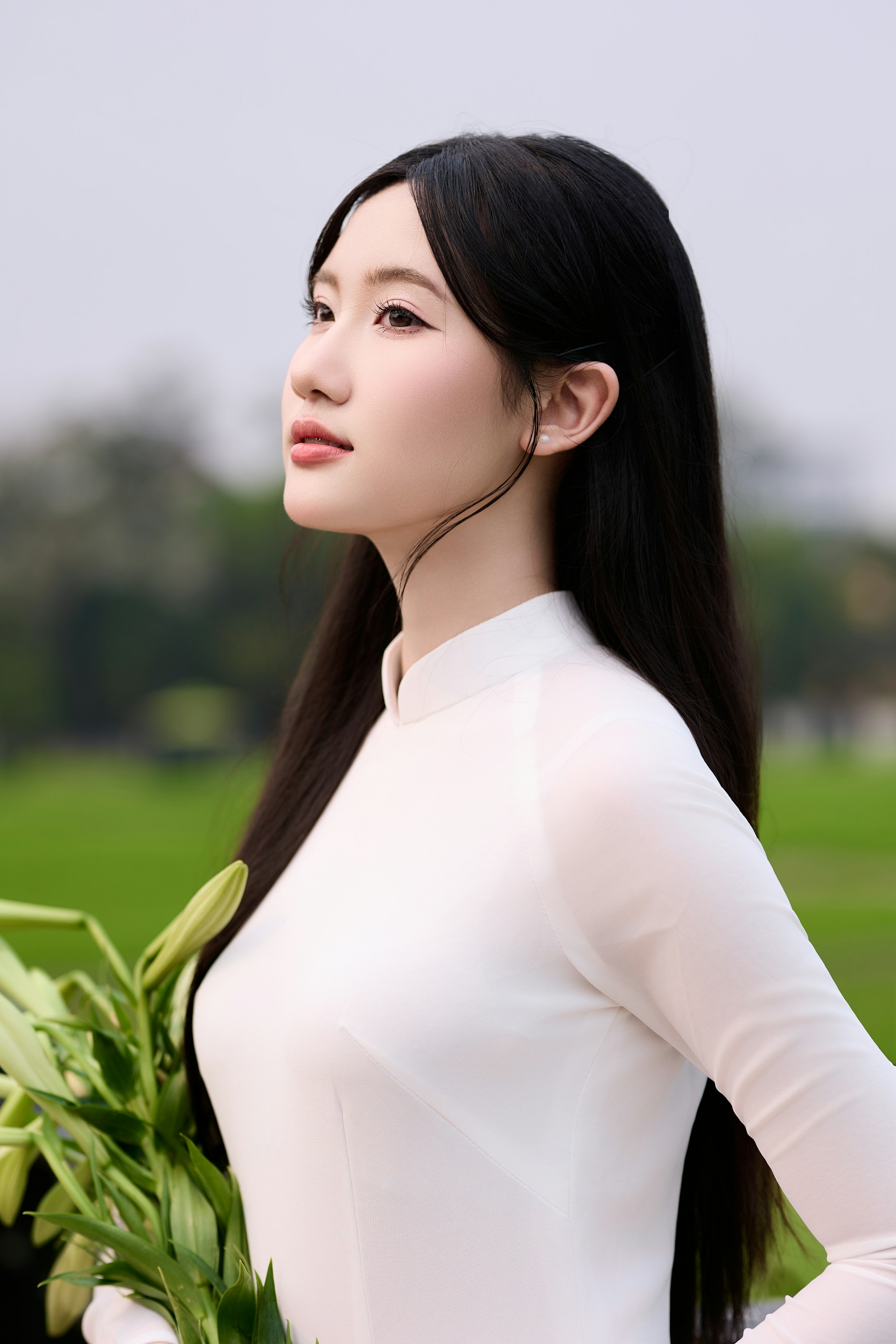 奥黛的白,是干净到极致的温柔。立领贴合脖颈,线条利落又优雅,垂坠的衣摆随着轻动的步伐轻轻摇曳,似春日里随风舒展的枝叶。长发如瀑垂落肩头,与素白的衣身相映,衬得肌肤胜雪,眉眼间的温柔气息扑面而来🌿。