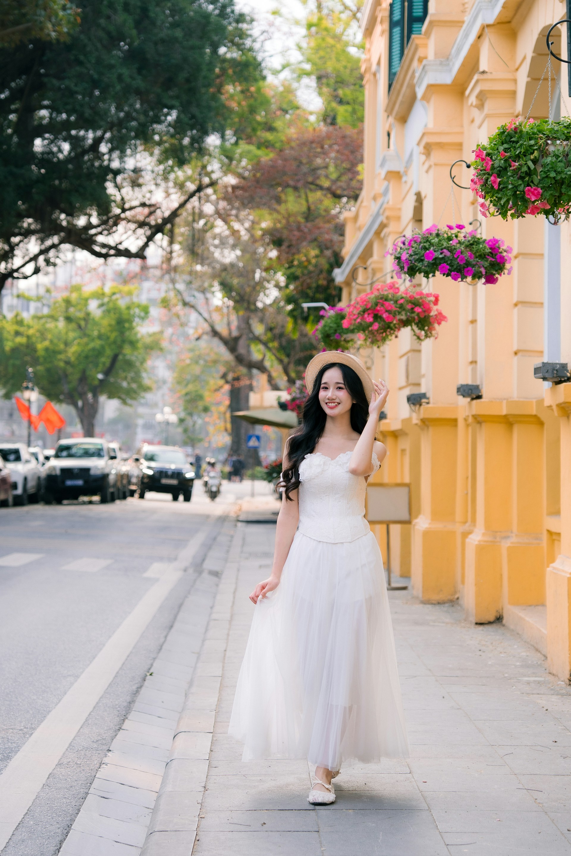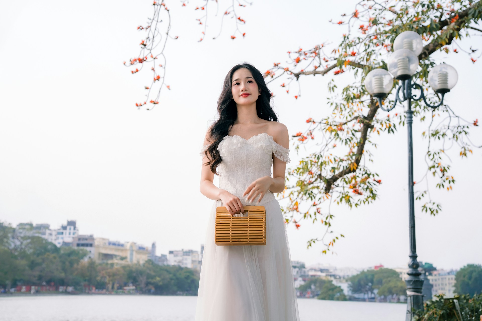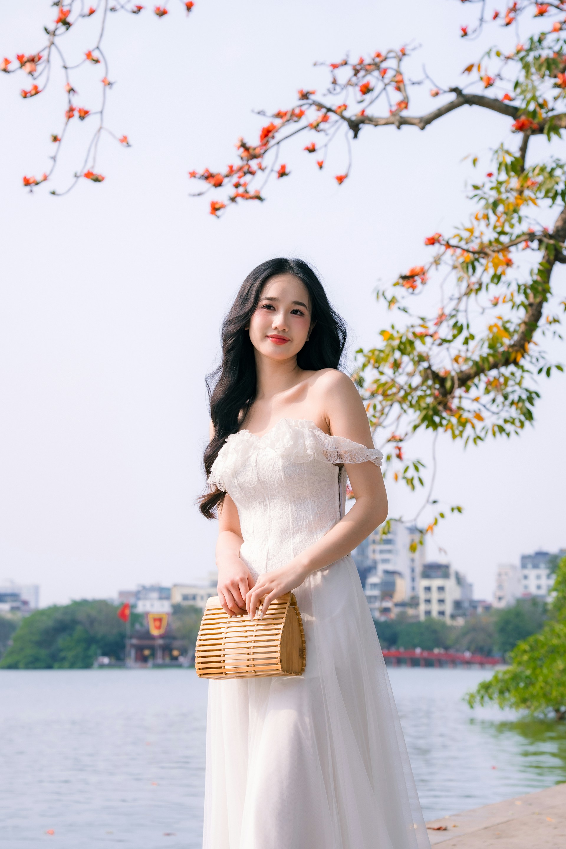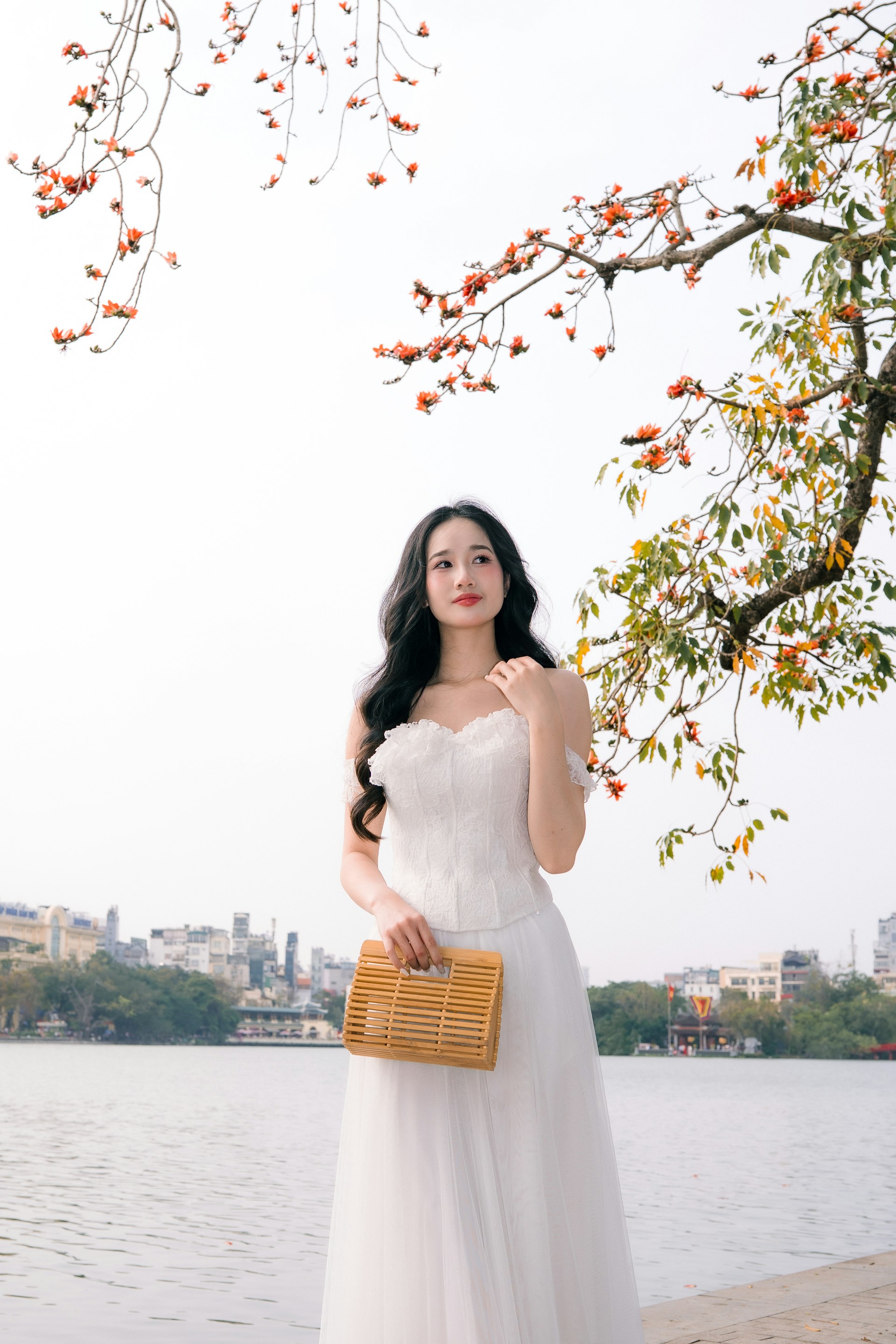 长发如瀑般卷曲垂落,衬得脸颊愈发小巧精致,甜美的笑容漾在脸上,眉眼弯弯,满是治愈的温柔。手中拎着竹编手提篮,自然的竹纹质感与白纱的纯净相映,又添了几分河内独有的烟火气与清新感🧺。