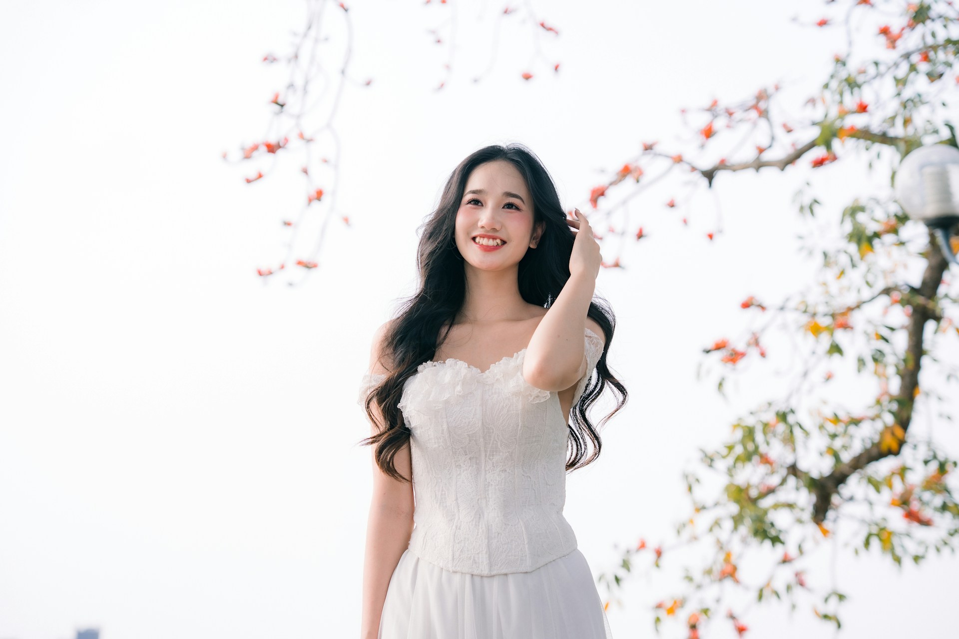 长发如瀑般卷曲垂落,衬得脸颊愈发小巧精致,甜美的笑容漾在脸上,眉眼弯弯,满是治愈的温柔。手中拎着竹编手提篮,自然的竹纹质感与白纱的纯净相映,又添了几分河内独有的烟火气与清新感🧺。图片来源:Unsplash