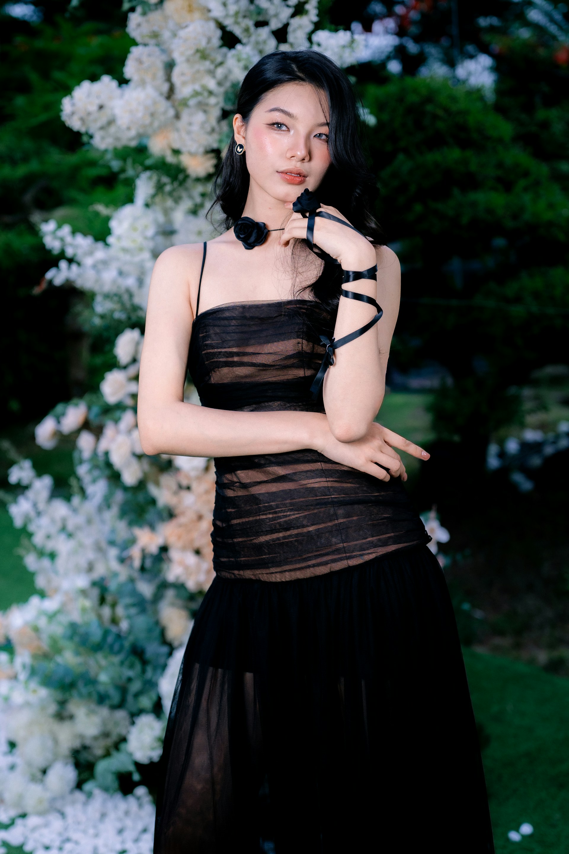 而穿黑裙,则像一朵带刺的黑玫瑰,冷艳又迷人。黑色抹胸纱裙带着半透明的质感,搭配颈间的黑玫瑰项圈与缠绕的丝带,又纯又欲,自带疏离又神秘的气质。她眼神清冷,抬手轻触颈间玫瑰,发丝轻垂,在花墙前勾勒出独属于暗夜的魅惑与高级感🖤。