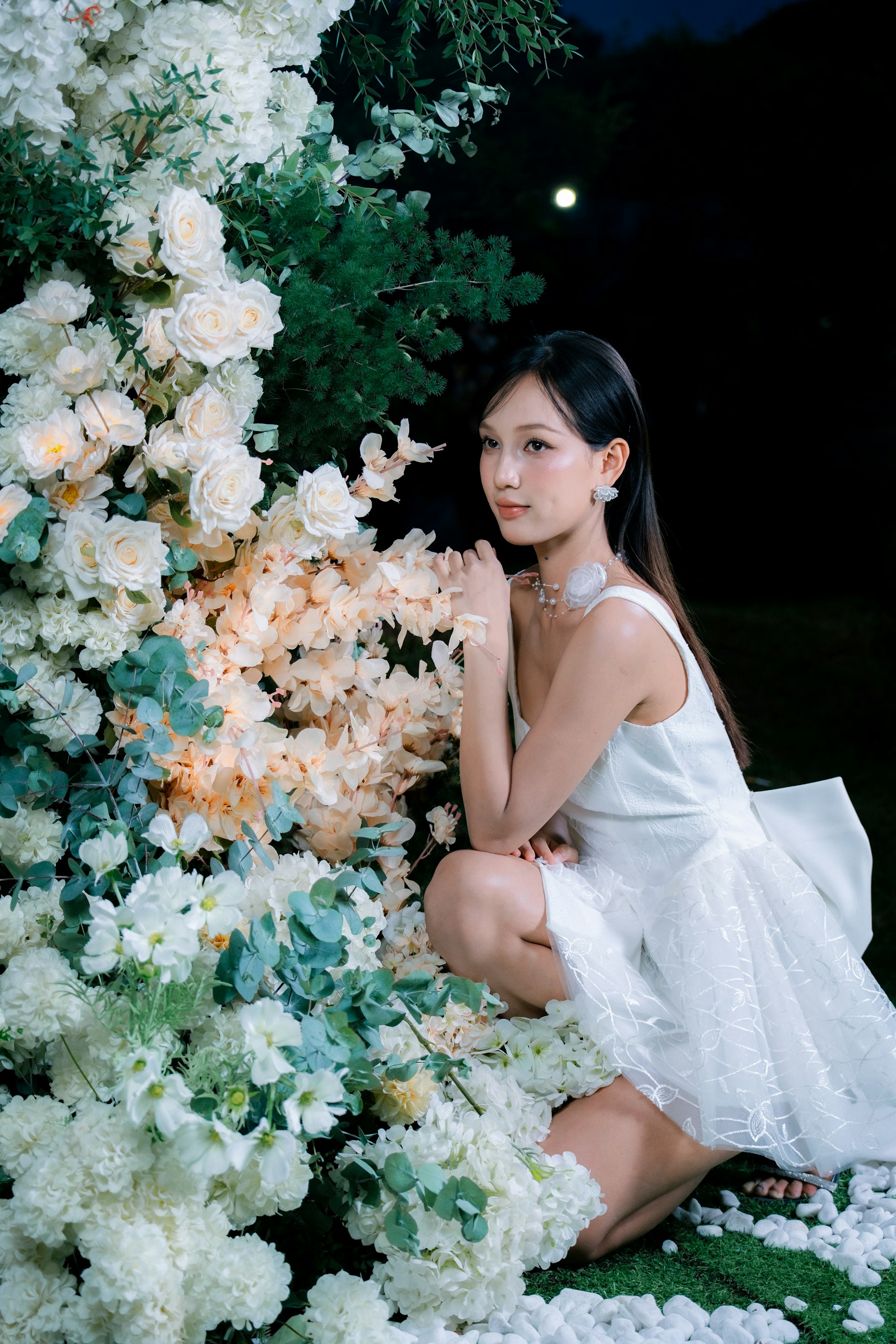 夜色温柔,月光轻洒,一面由白玫瑰、香槟花与尤加利叶编织而成的花墙,成了这场浪漫故事的背景板。穿白衣,像从月光里走出来的白月光。她身着精致的短款白纱裙,裙摆上的蕾丝纹路在夜色里泛着微光,身后的蝴蝶结像一对隐形的翅膀,温柔又灵动。她或蹲在花丛中,手捧一束白绣球,眉眼间带着干净的温柔;或侧身回望,白裙与花海融为一体,像一朵悄然绽放的月光花,干净又治愈✨。