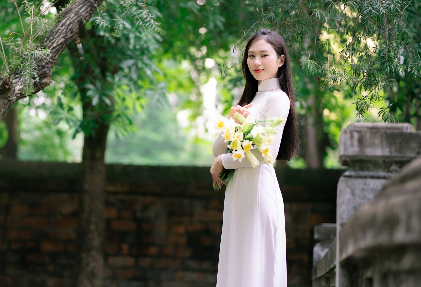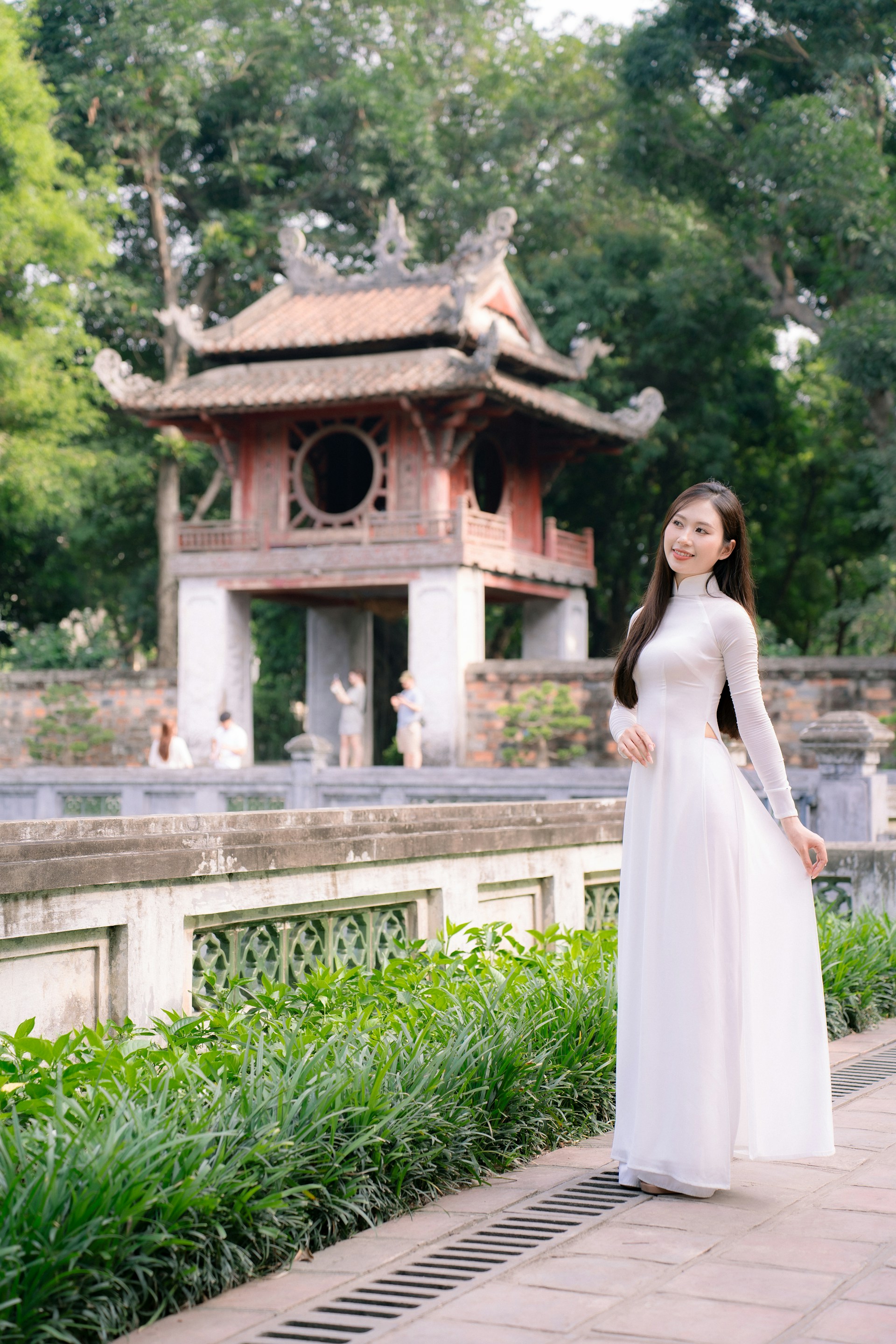 阳光穿过文庙的古木枝叶,在青石板路上洒下斑驳的光影。少女身着一袭纯净的白奥黛,衣袂在微风中轻轻扬起,与红墙古亭、葱郁绿植相映,勾勒出独属于越南的东方诗意🌿。