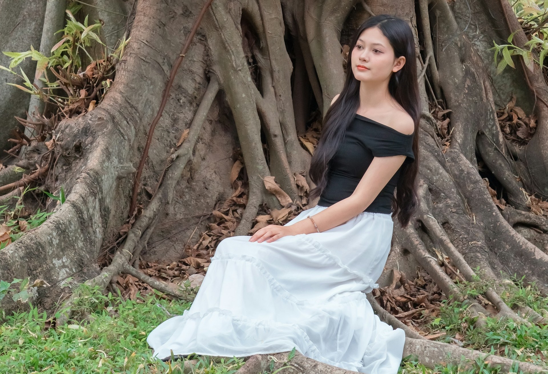 少女身着一件黑色一字肩上衣,露出精致的肩颈线条,搭配一条层层叠叠的白色蛋糕长裙,黑与白的经典碰撞,利落又温柔,自带一种不刻意的清冷气质🖤🤍。她靠在苍劲的老树根部,或轻抬下颌浅笑,或侧身垂眸沉思,发丝被微风轻轻吹动,每一个动作都透着自然又松弛的状态。图片来源:Unsplash