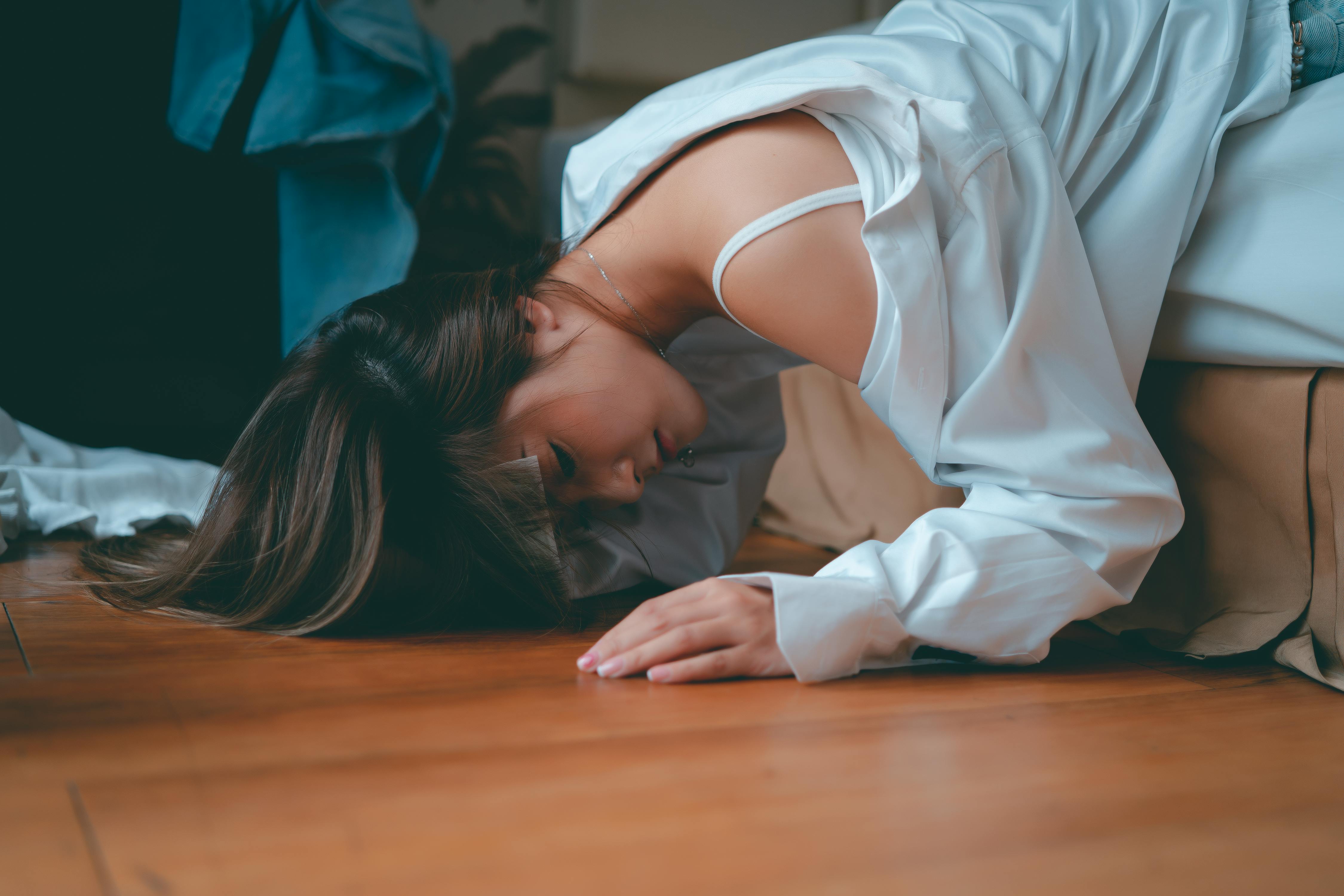 额头上的退热贴,手里的温水与药片,散落的衣物,凌乱的床铺,都是真实生活的碎片。她靠在床边,时而抬头望向镜头,时而垂眸看着手机,眼底藏着一丝脆弱与迷茫。