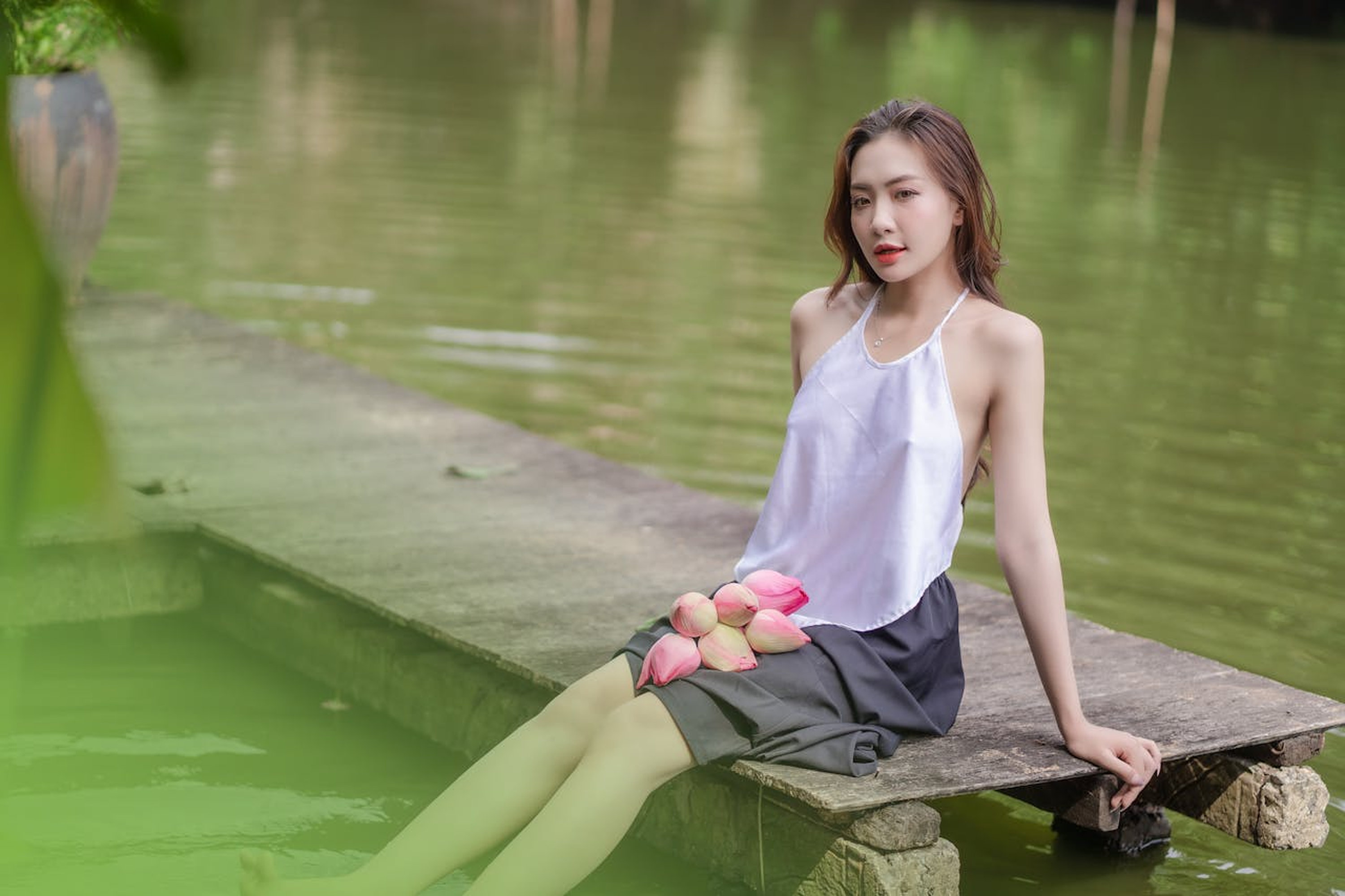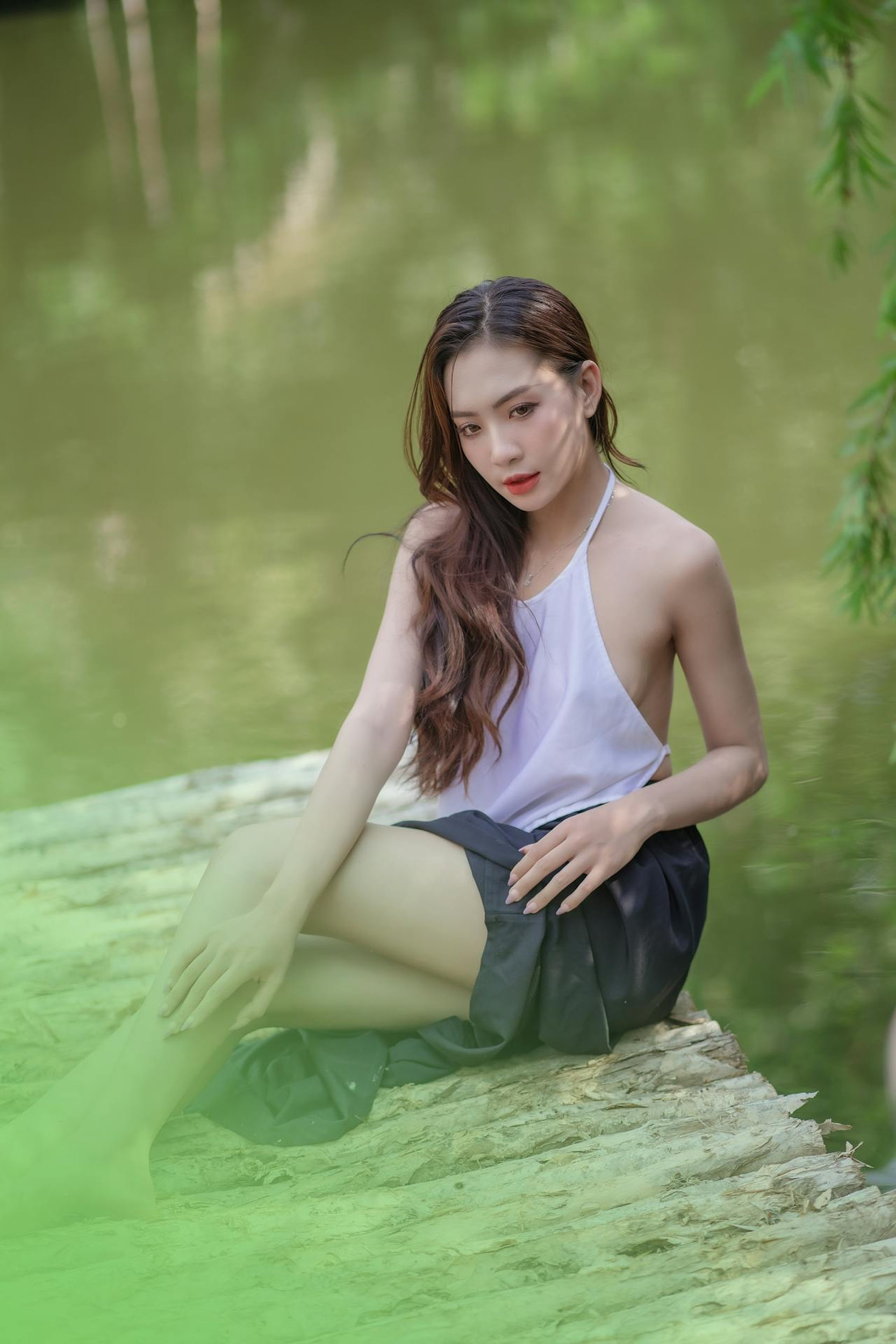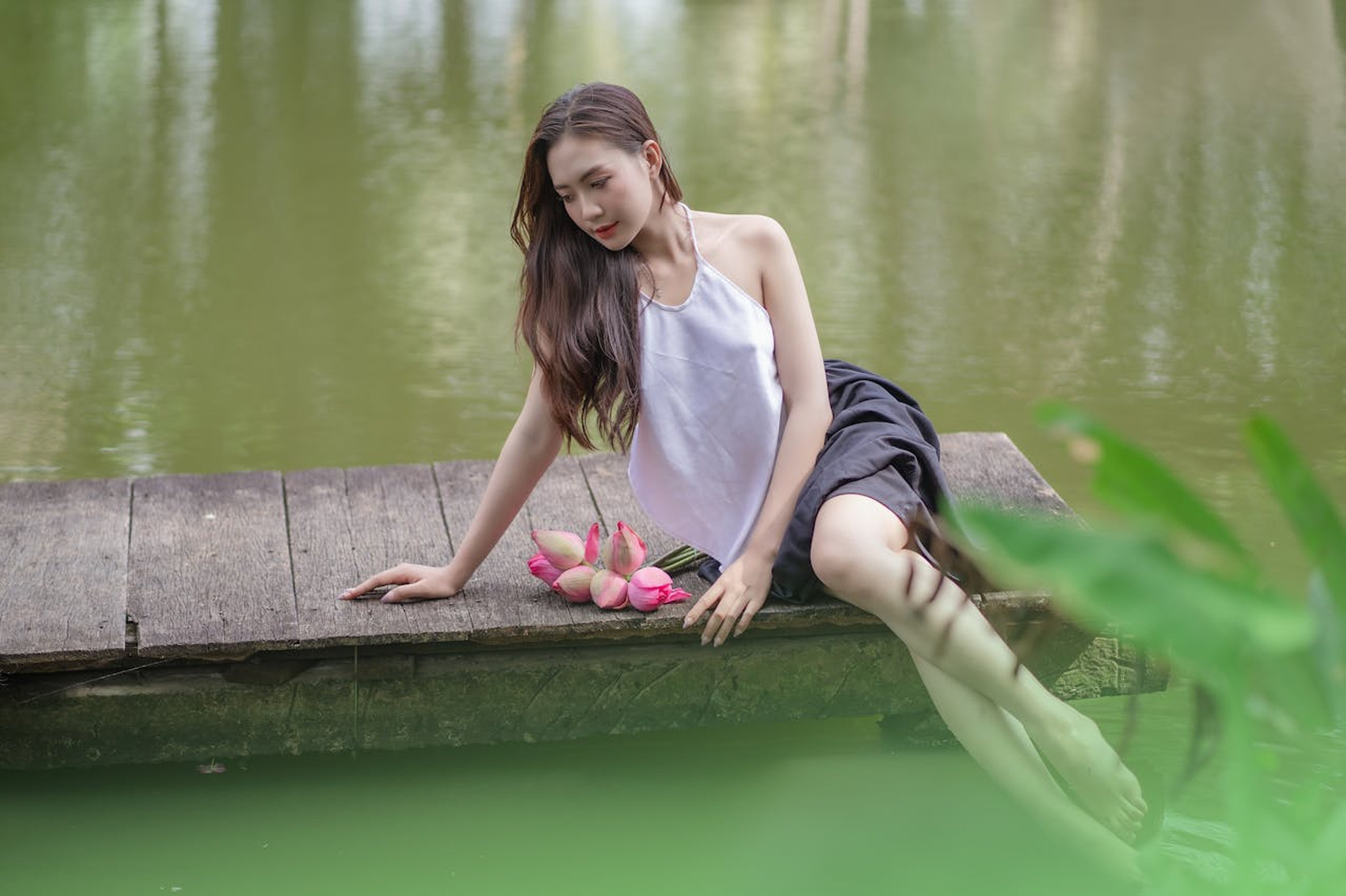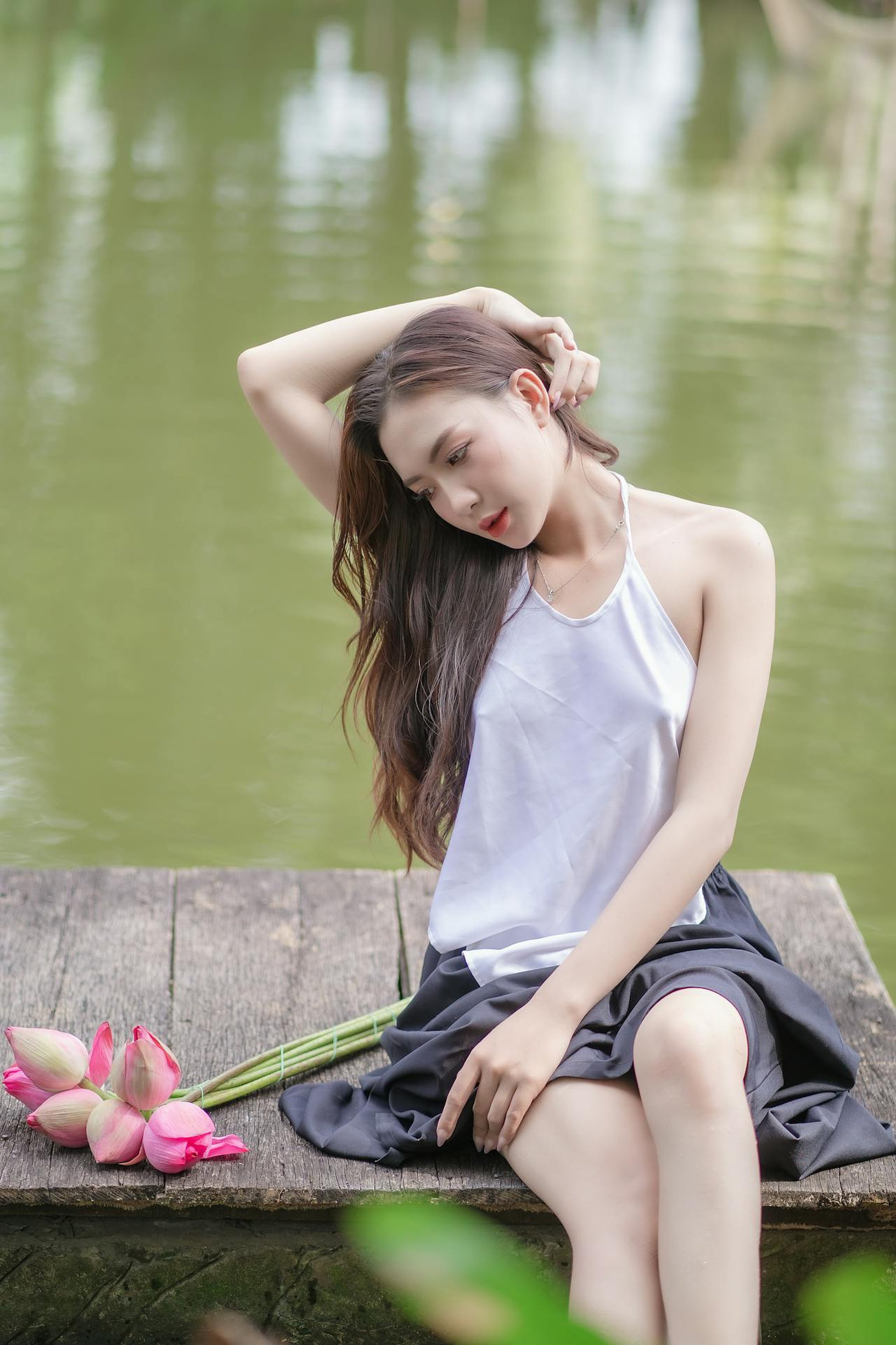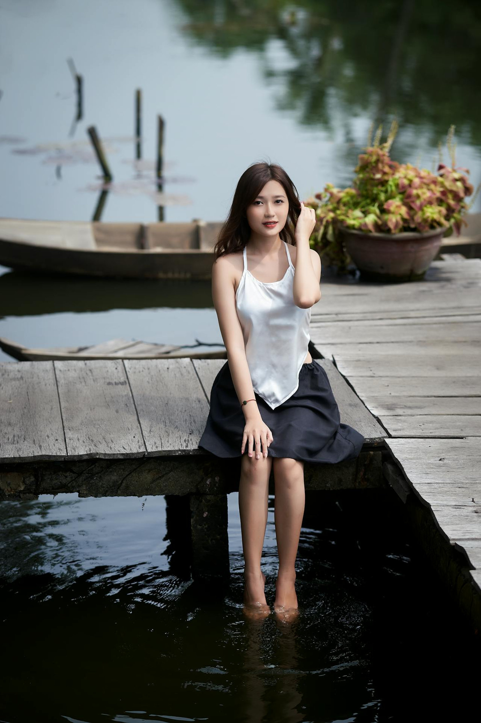 白挂脖上衣配黑裙,是水乡最清爽的配色。她坐在老旧的木栈桥上,脚边是漾着碎光的池水,手边放着几支含苞的荷花,长发被风轻轻撩起,和水面的涟漪一起晃呀晃。阳光穿过枝叶,在她身上投下斑驳的光影,整个画面都浸在一层淡淡的绿调里,软乎乎的,像一首关于夏日的小诗。