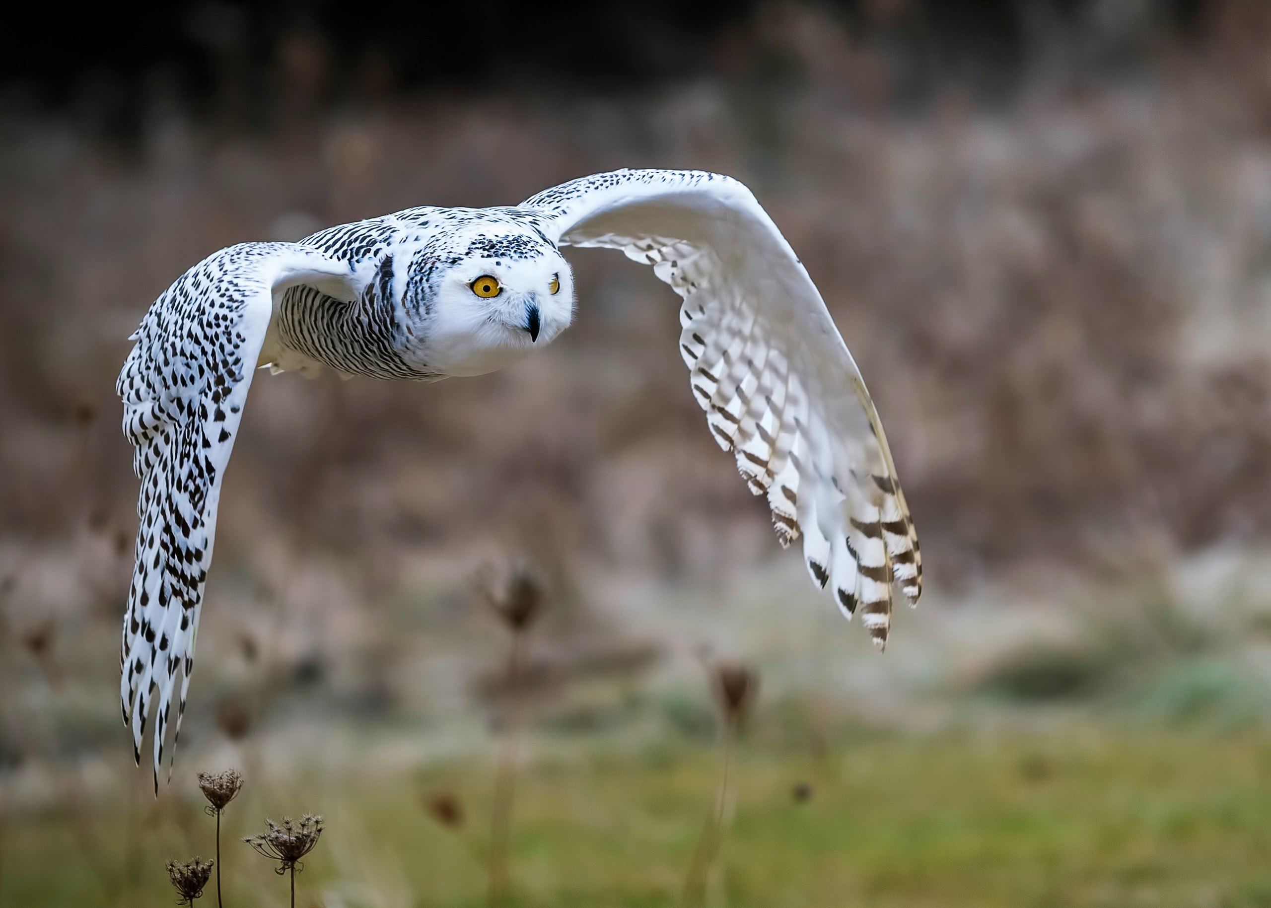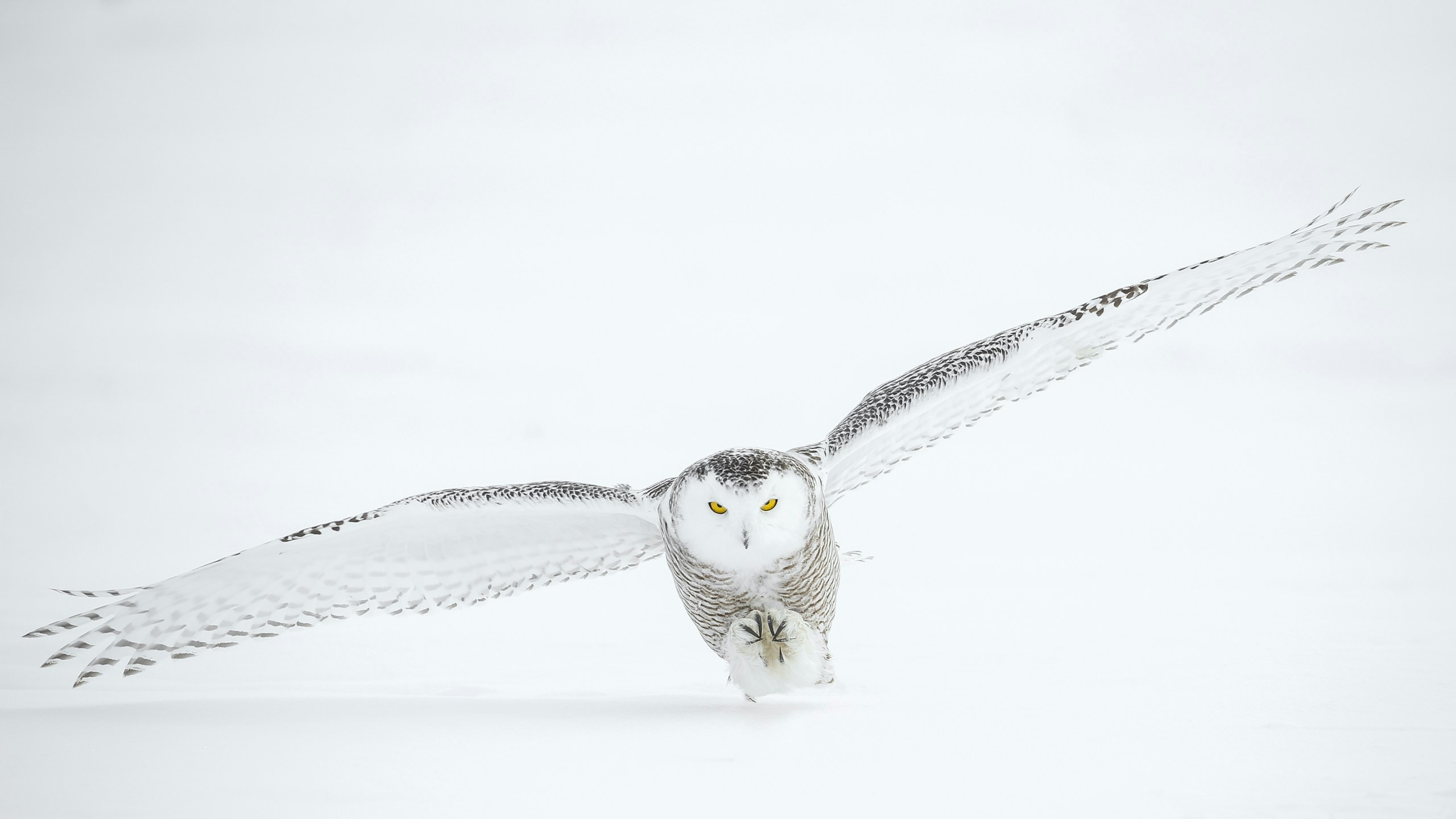 雪鸮拥有鸟类中最极致的保暖装备,羽毛密度极大,甚至连脚趾都被浓密的白羽包裹得严严实实,看起来就像穿了一双超厚的雪地靴。这些羽毛不仅提供了绝佳的保温效果,防止热量在零下几十度的环境中流失,还能起到消音作用。当它们张开双翼滑翔时,厚实的羽毛能吸收震动,实现真正的“静音飞行”。