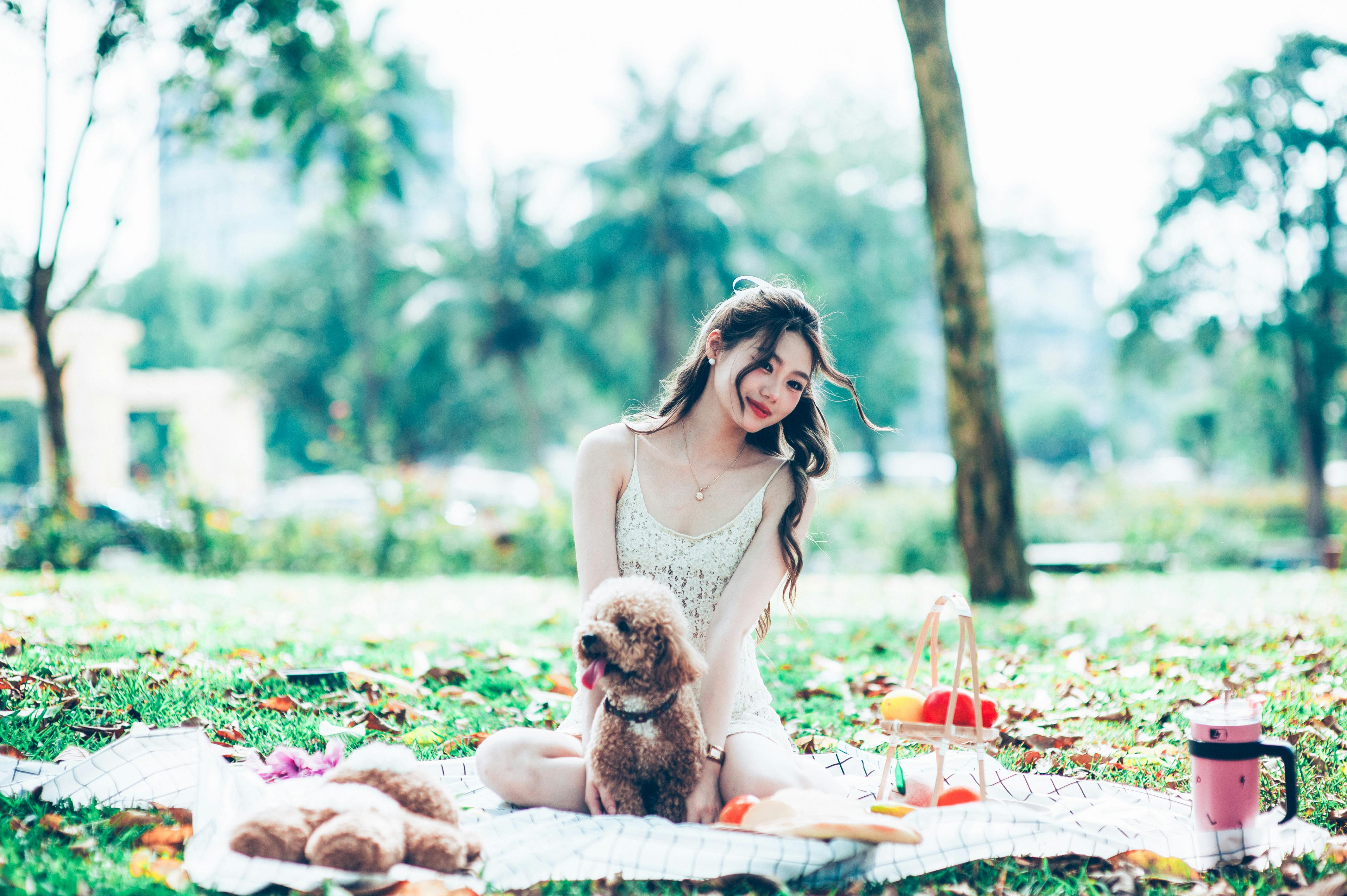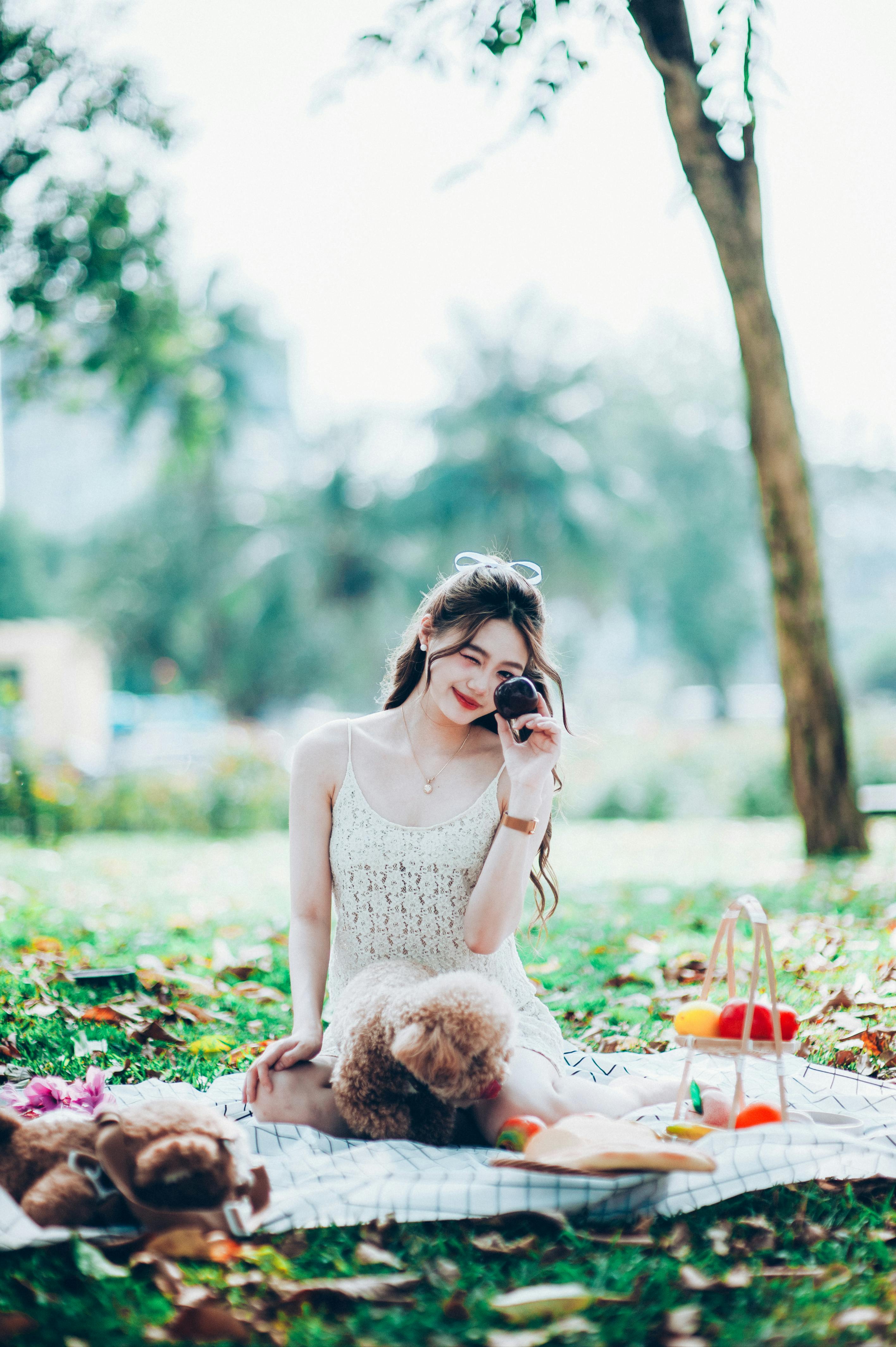 草地、格子布、水果篮,还有蹲在一旁吐舌头的小泰迪,组成了最治愈的野餐画面。女孩笑眼弯弯,连小狗都被这温柔的氛围感染,乖乖地窝在她身边,一起享受慢下来的春日时光。