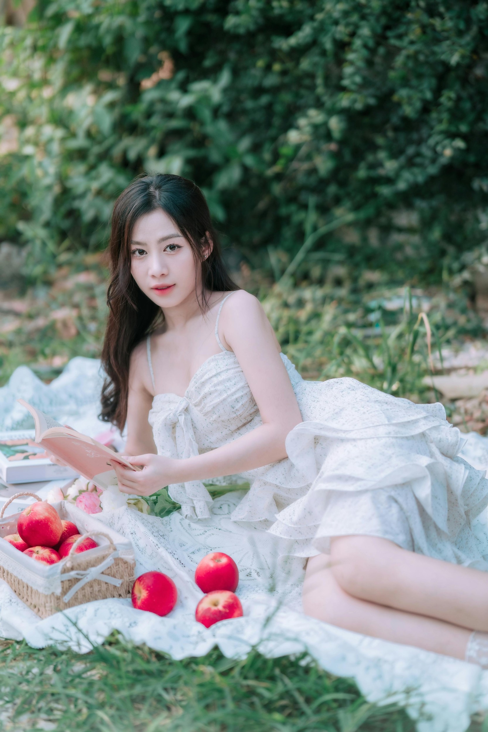 白纱裙、红苹果、翻开的书本,在绿意盎然的草地里,构成了一幅清新的油画。女孩低头翻书的模样,安静又美好,仿佛整个世界的喧嚣,都被这片春日野餐的温柔隔绝在外。