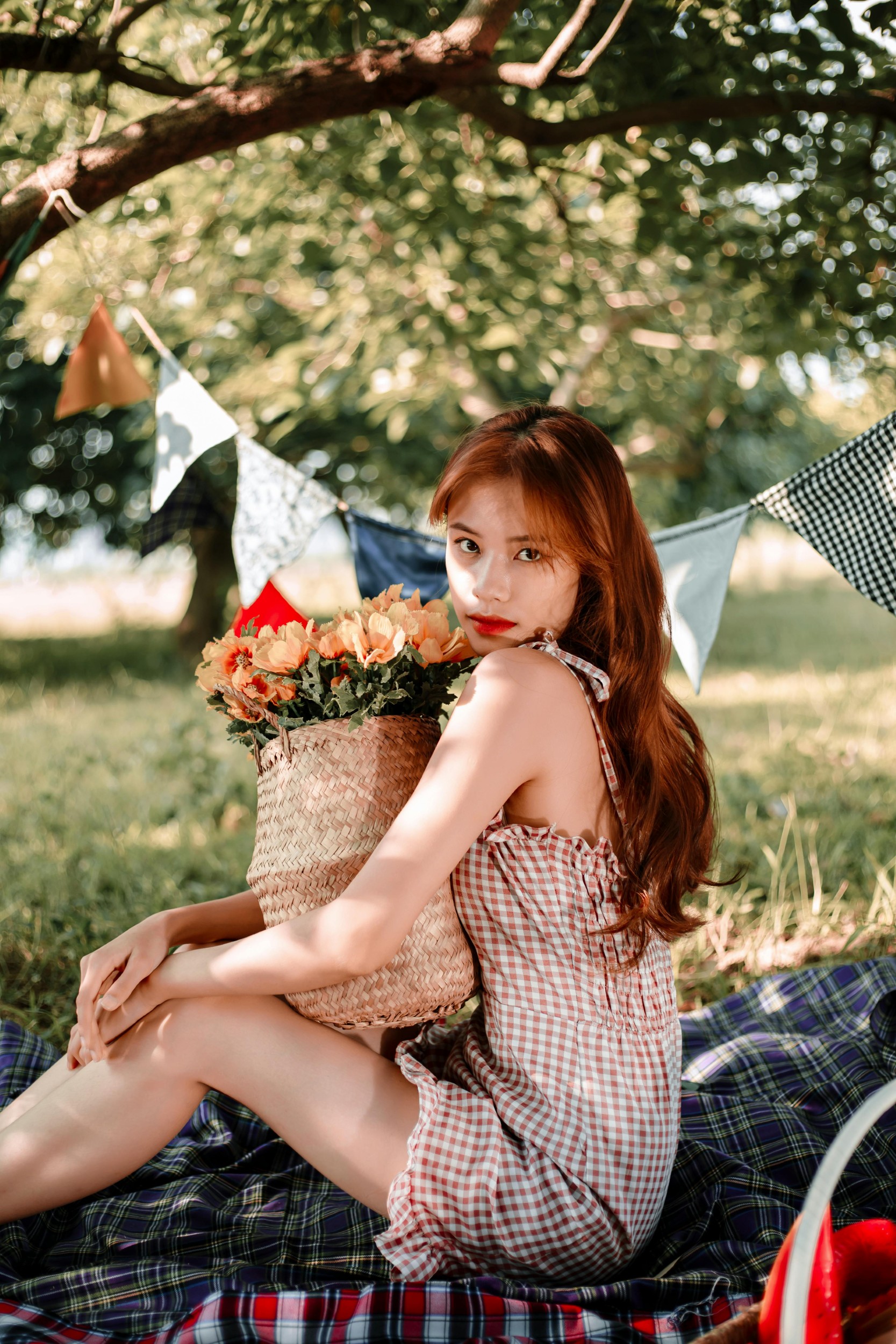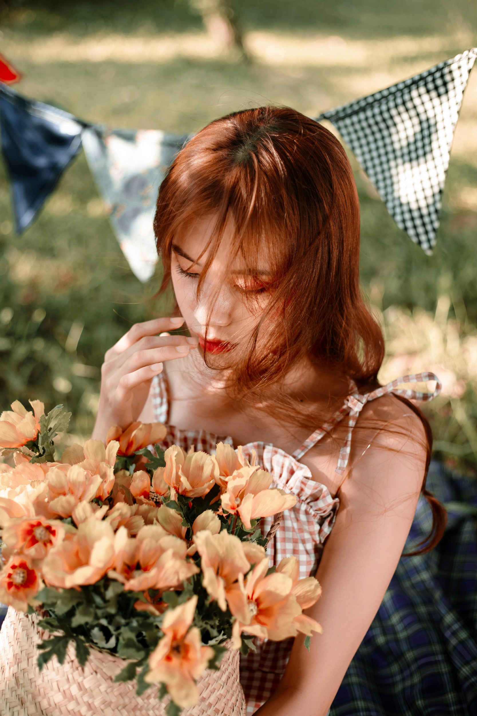 树影斑驳,彩旗轻晃,格纹野餐布上,装满了鲜花、水果与少女的心事。她抱着竹编花篮,被暖金色的阳光包裹,红棕发色与橙黄花朵相映,每一帧都像电影里的温柔片段。