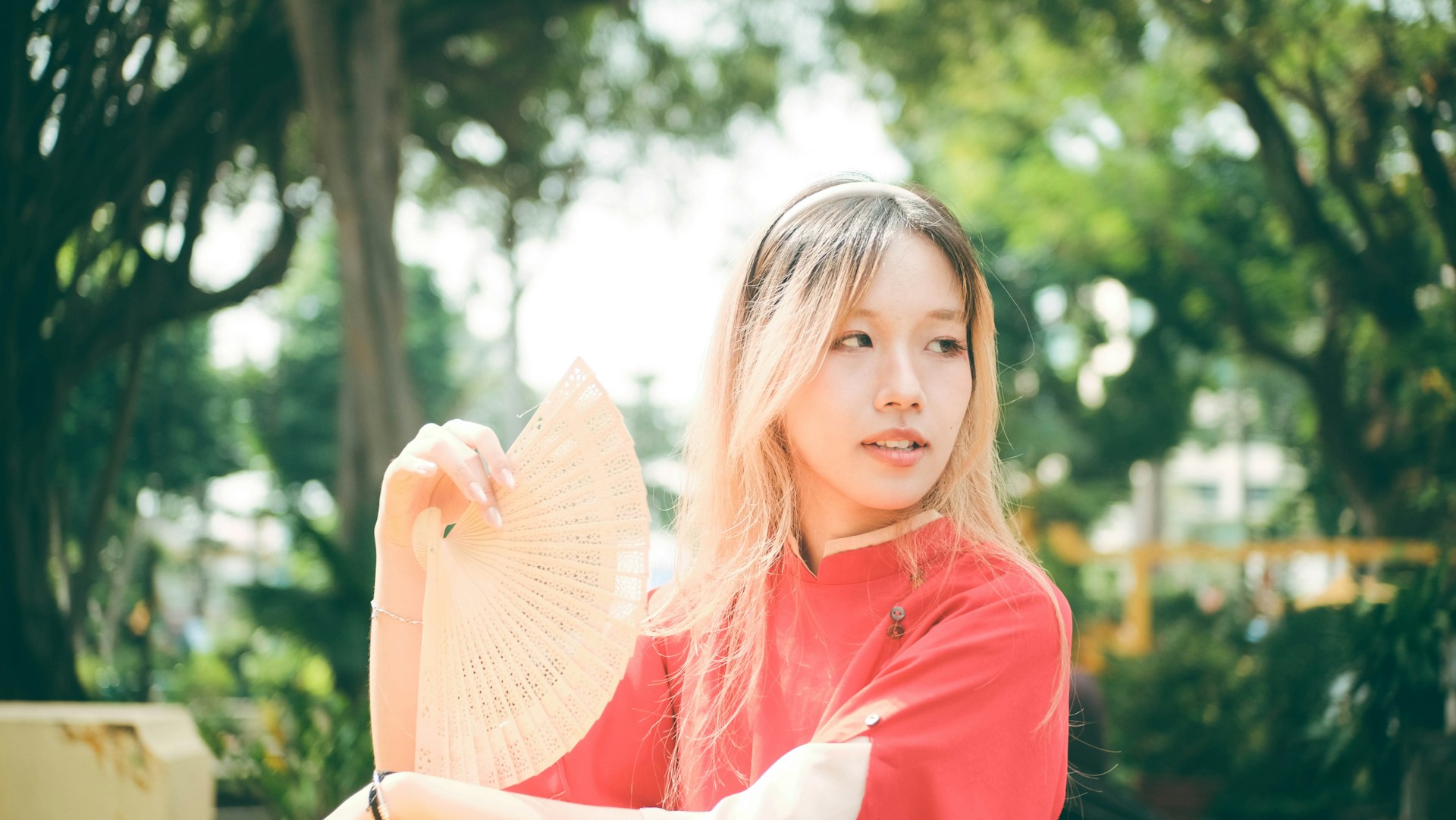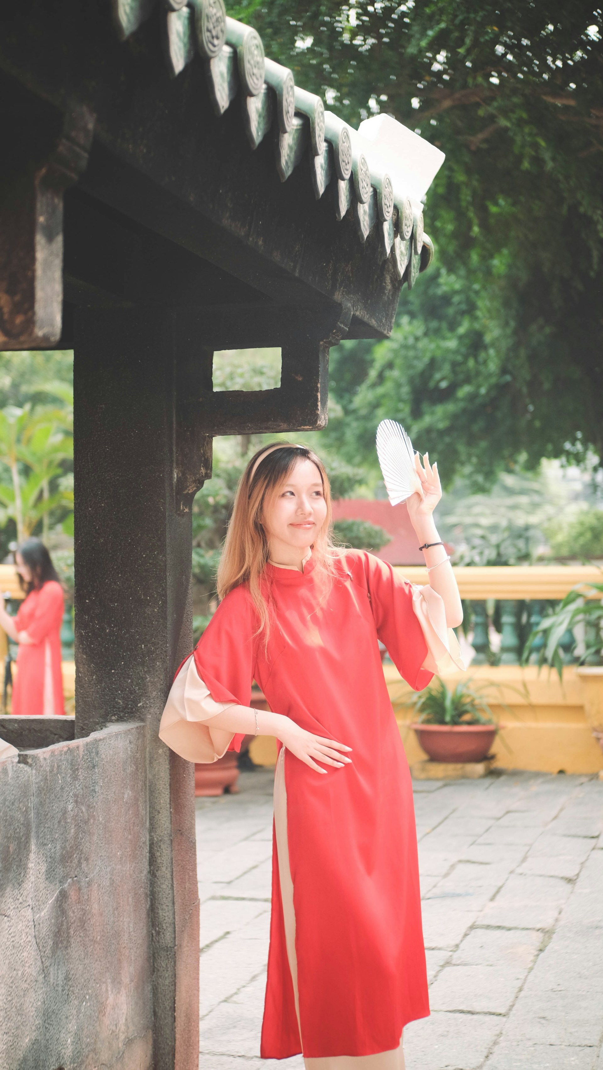 她握着竹扇,或半掩着脸庞浅笑,或倚着黄墙安静垂眸,又或是俏皮地从石柱后探出头来,比出一个轻快的手势。红裙的热烈和园林的古朴撞在一起,既有东方古典的温婉,又藏着少女独有的灵动。