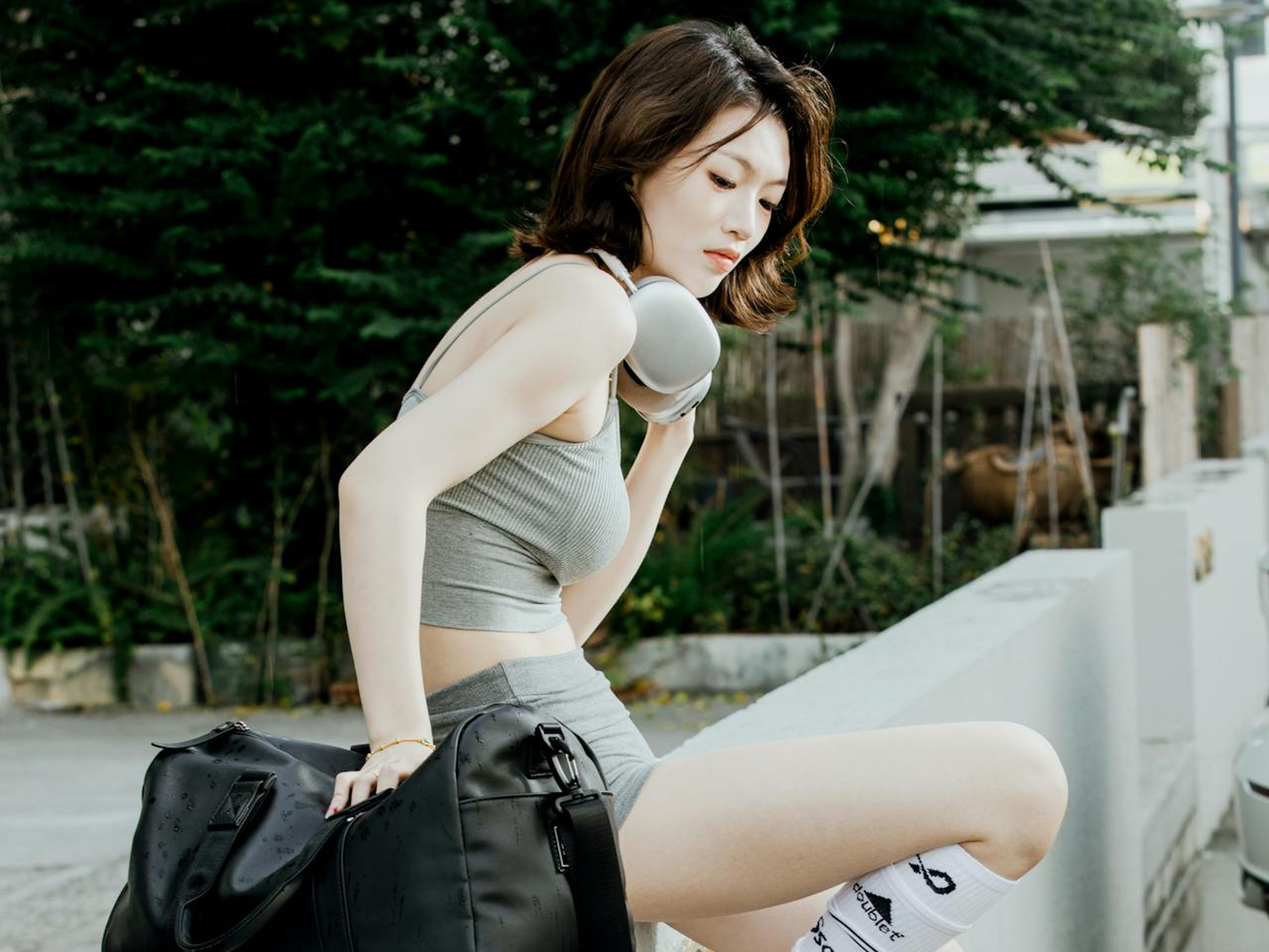 简约的灰色吊带短裤套装,贴合夏日的清爽调性,修身版型勾勒出利落线条。银色耳机挂在颈间,黑色挎包随性斜挎,长袜与老爹鞋的搭配,潮酷感直接拉满。