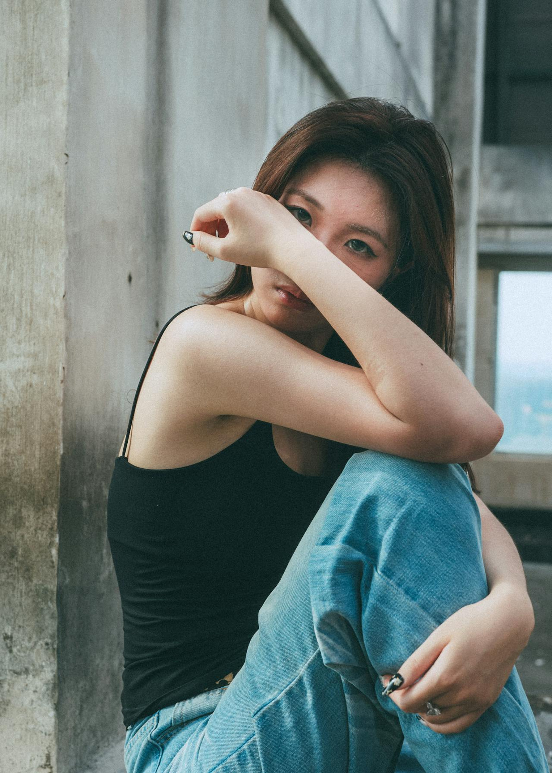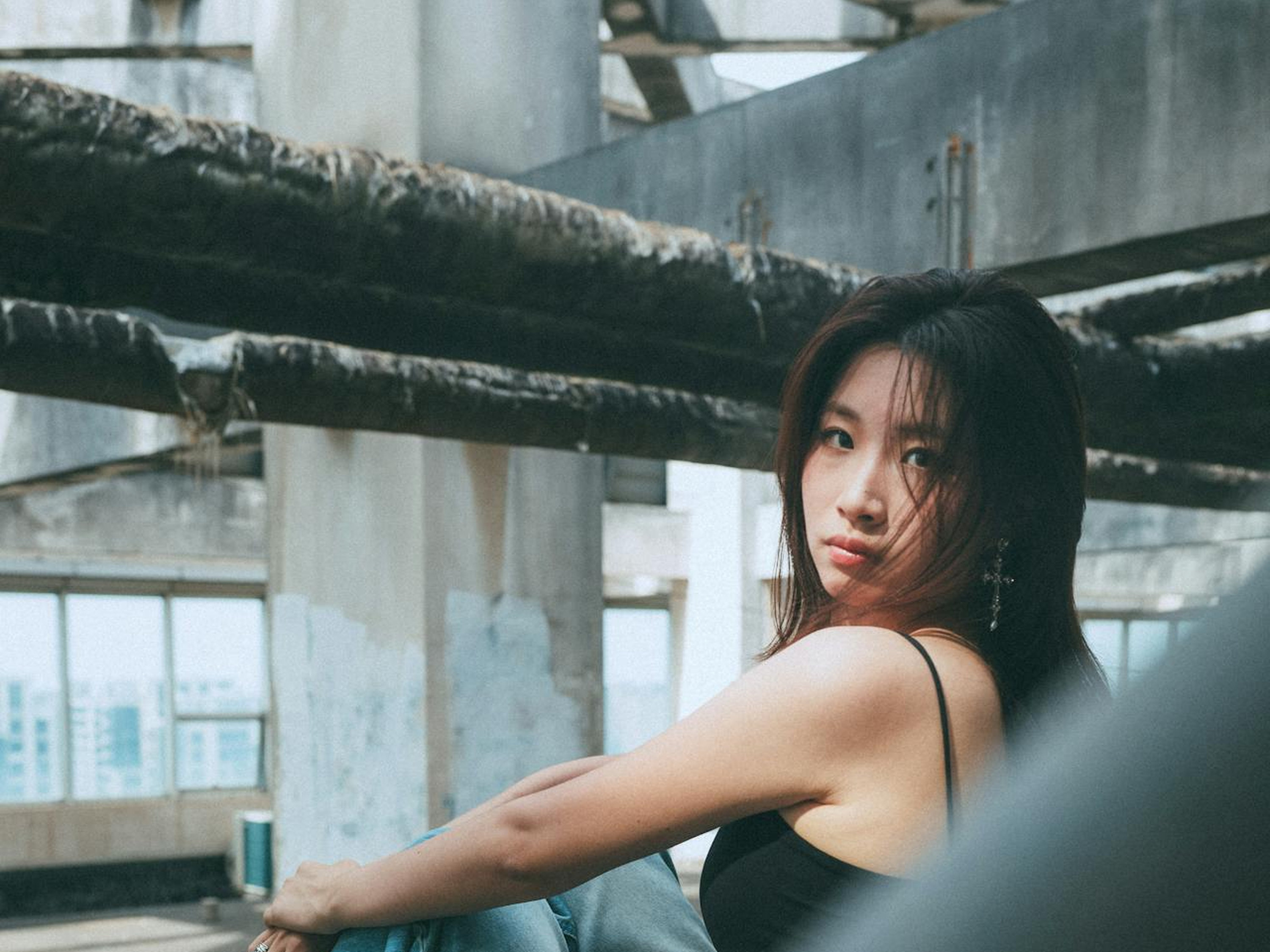 她或倚着栏杆回头,或席地而坐,眼神里带着几分漫不经心的酷,发丝被风吹乱,和水泥的粗糙纹理一起,把松弛与不羁写进了镜头里。没有刻意的精致,只有不被定义的态度,把街头的潮酷与旧天台的氛围感,定格成了超有个性的画面。