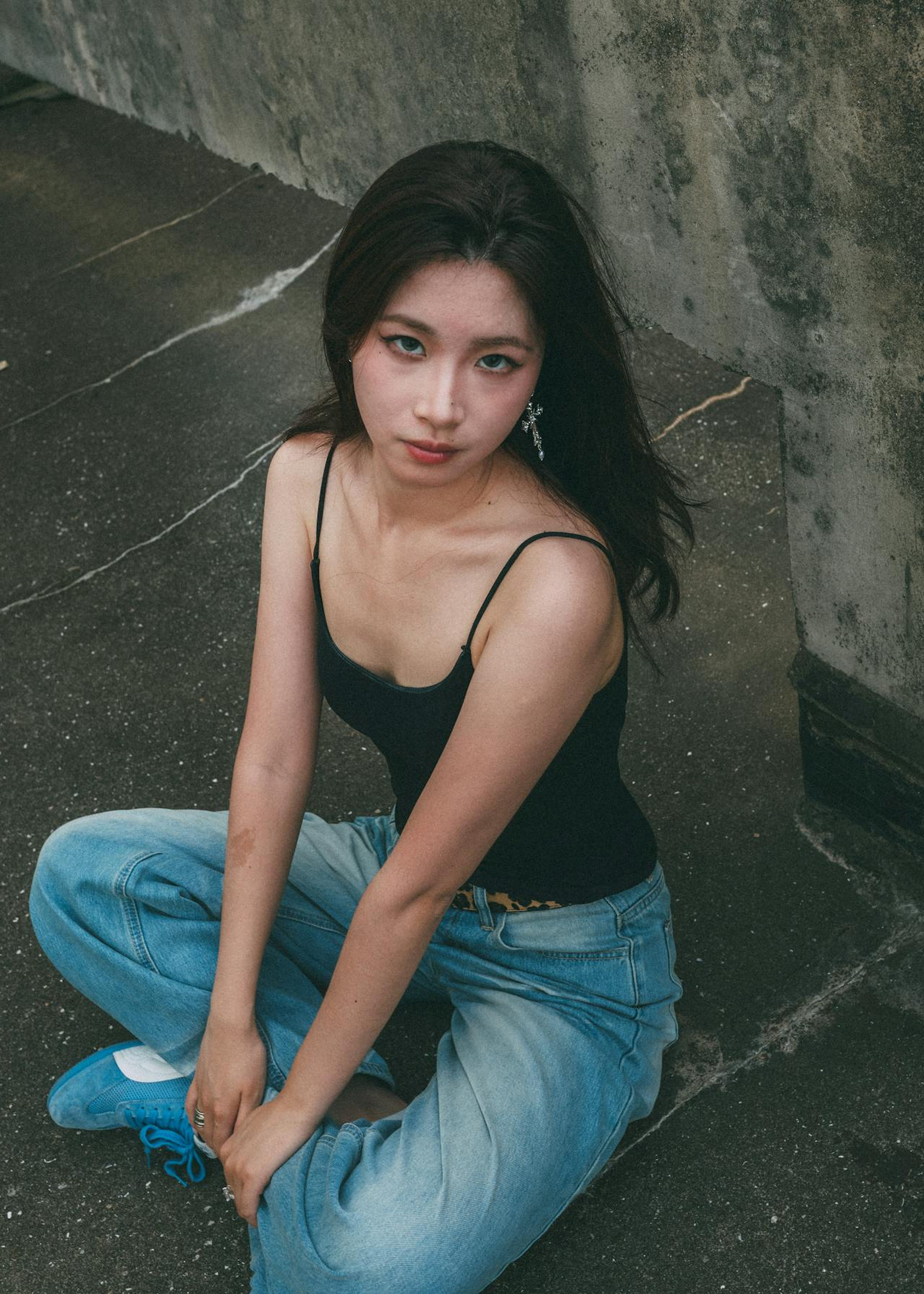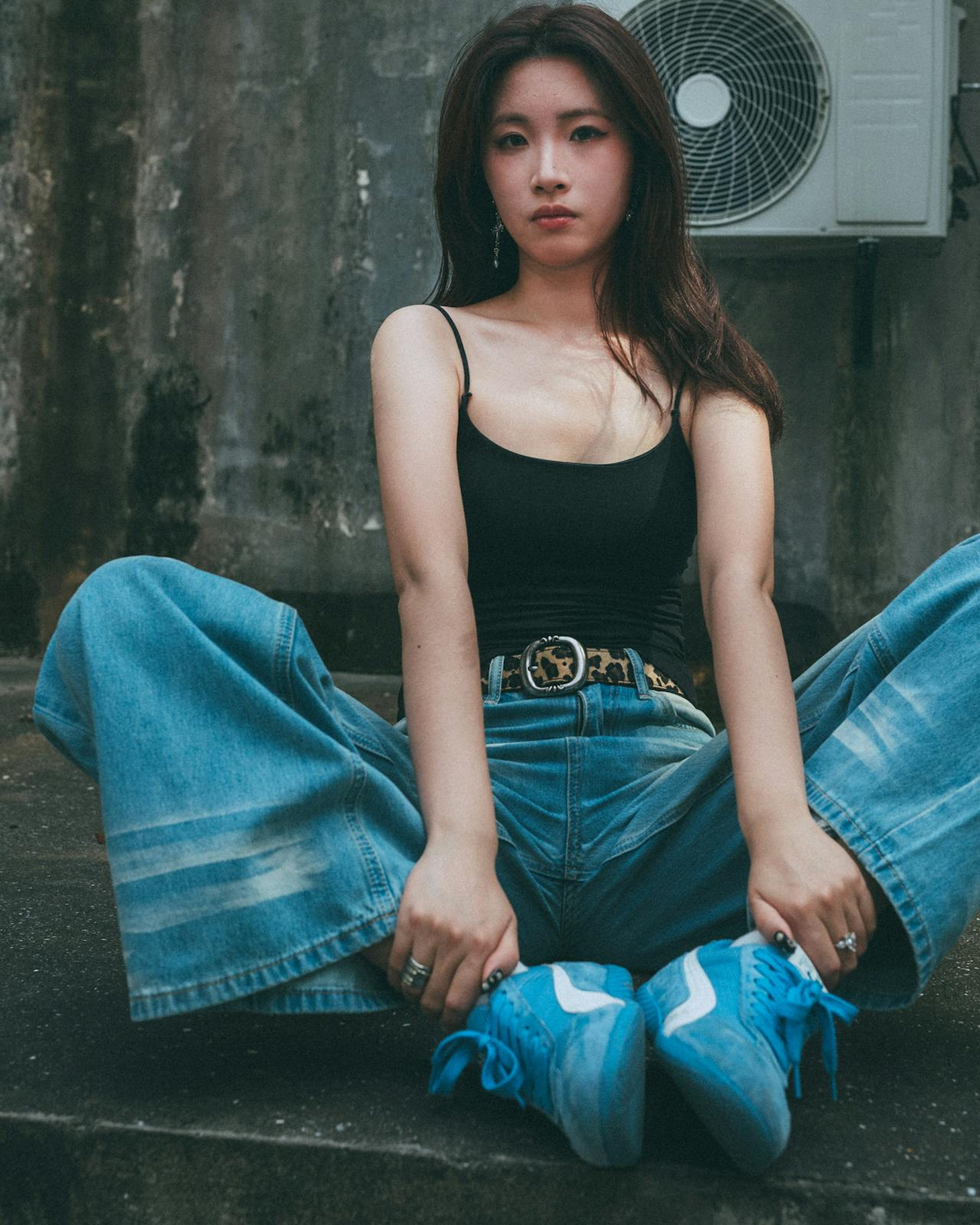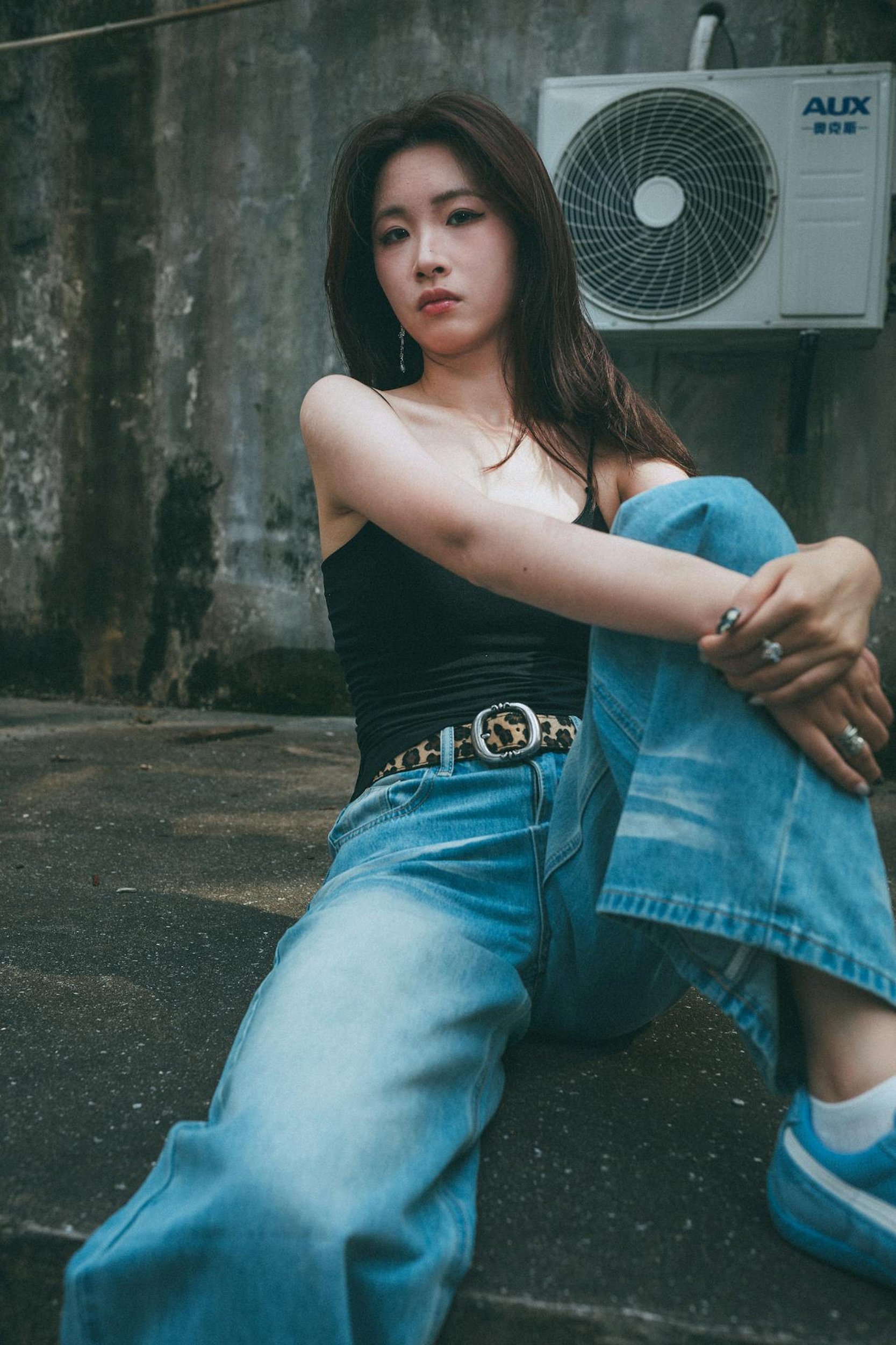 黑色吊带搭配阔腿牛仔裤,豹纹腰带和蓝色板鞋的点缀,让简单的穿搭充满了美式街头的张力。水泥墙、生锈管道、旧空调外机,成了最有故事感的背景板,冷调的胶片滤镜,更添几分复古质感。